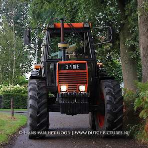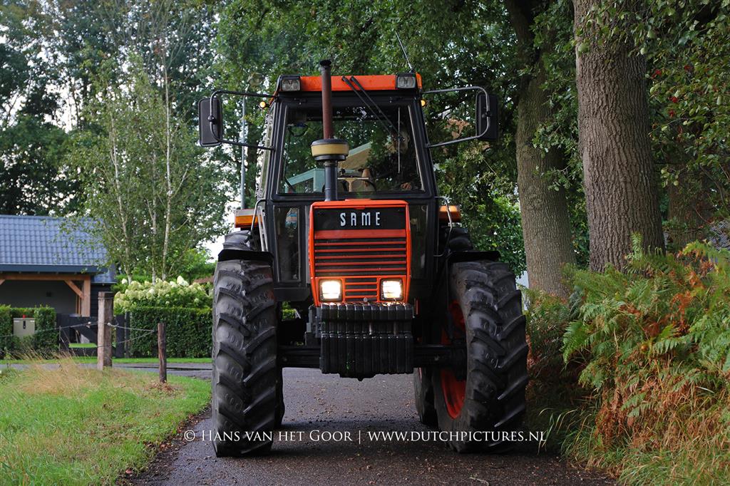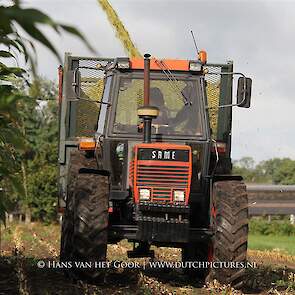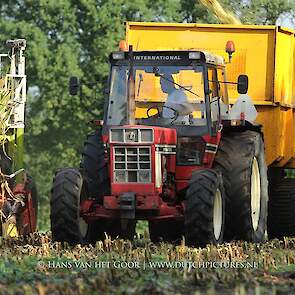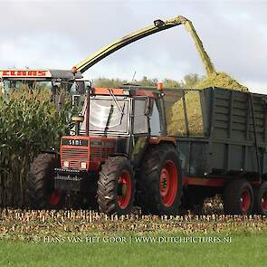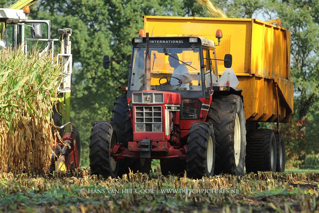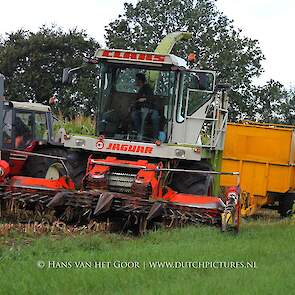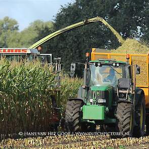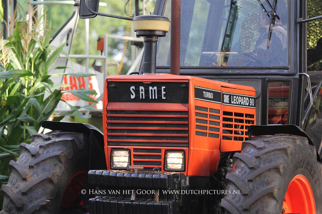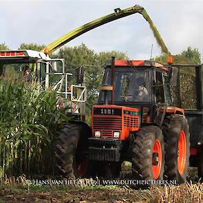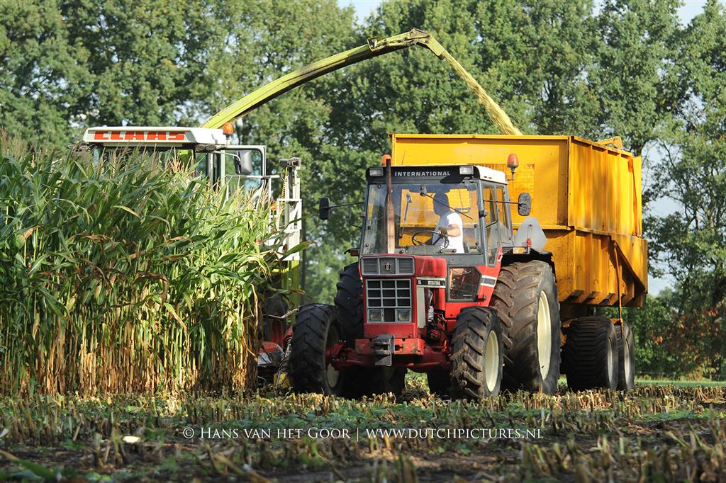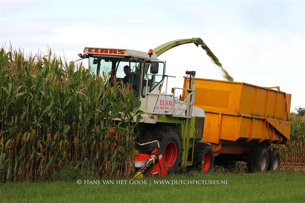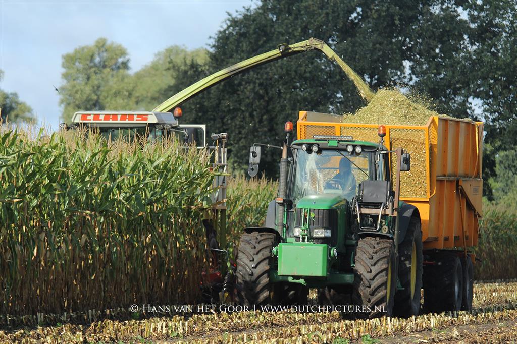 Maïs hakselen tussen Voorthuizen en Barneveld met een Claas Jaguar 695 SL veldhakselaar met Kemper Champion 4500 zesrijer, een Same Leopard 90 Turbo, een International 955 en een John Deere 6820. Loonbedrijf: Maïsploeg Kootwijkerbroek Het Velkemeen uit Kootwijkerbroek.