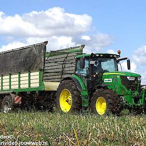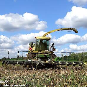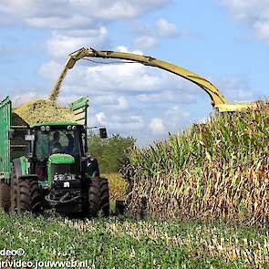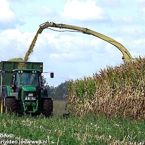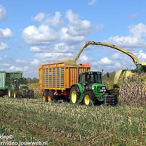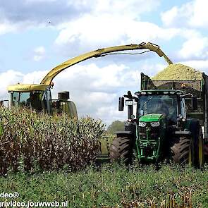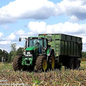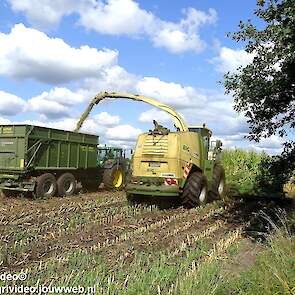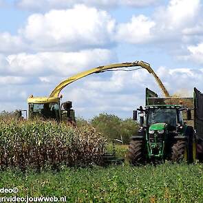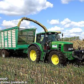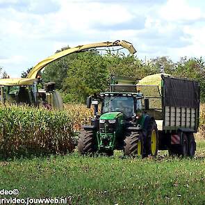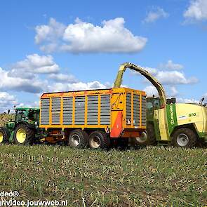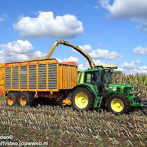 Lohnunternehmen ASW-Ochtrup (Agrar-Service Wessendrof) (D) aan het mais hakselen met een Krone BigX 700 met Krone EasyCollect 12 rijer, John Deere 6430 met Veenhuis Super Silagewagen, John Deere 8630 met Tebbe silagewagen, John Deere 6195 met Kaweco Radium 50 en een John Deere 7530 met Fortuna Muldenkipper .