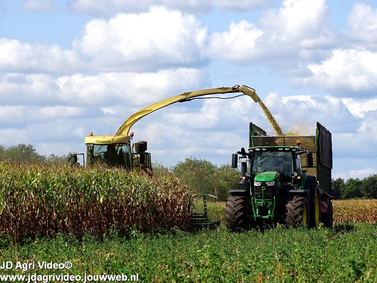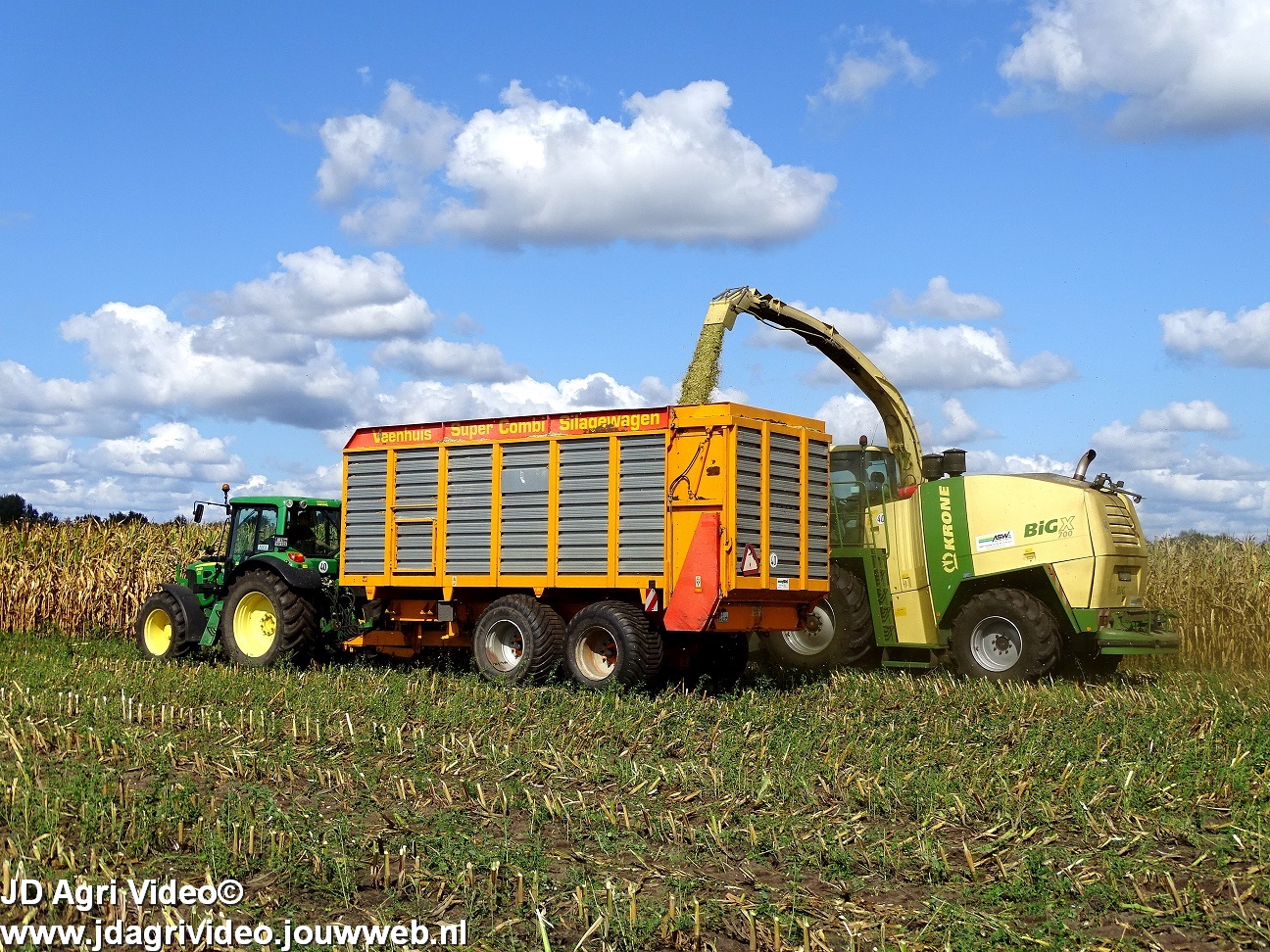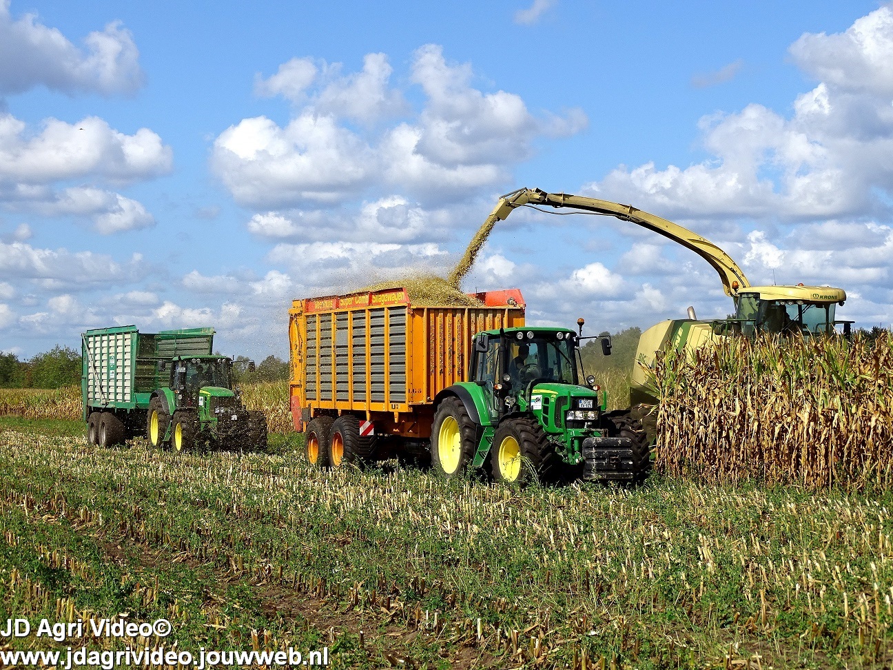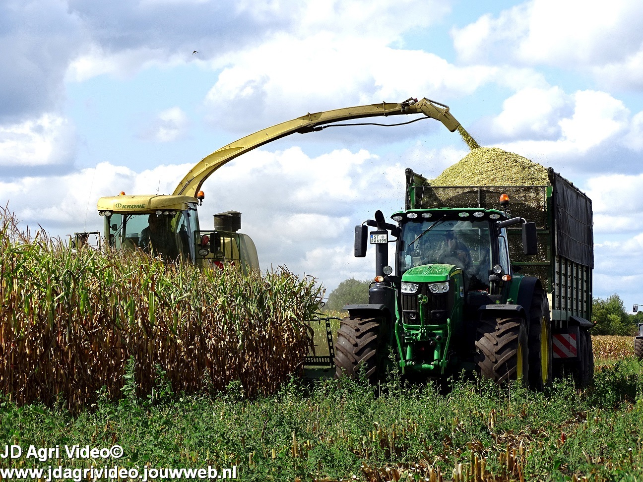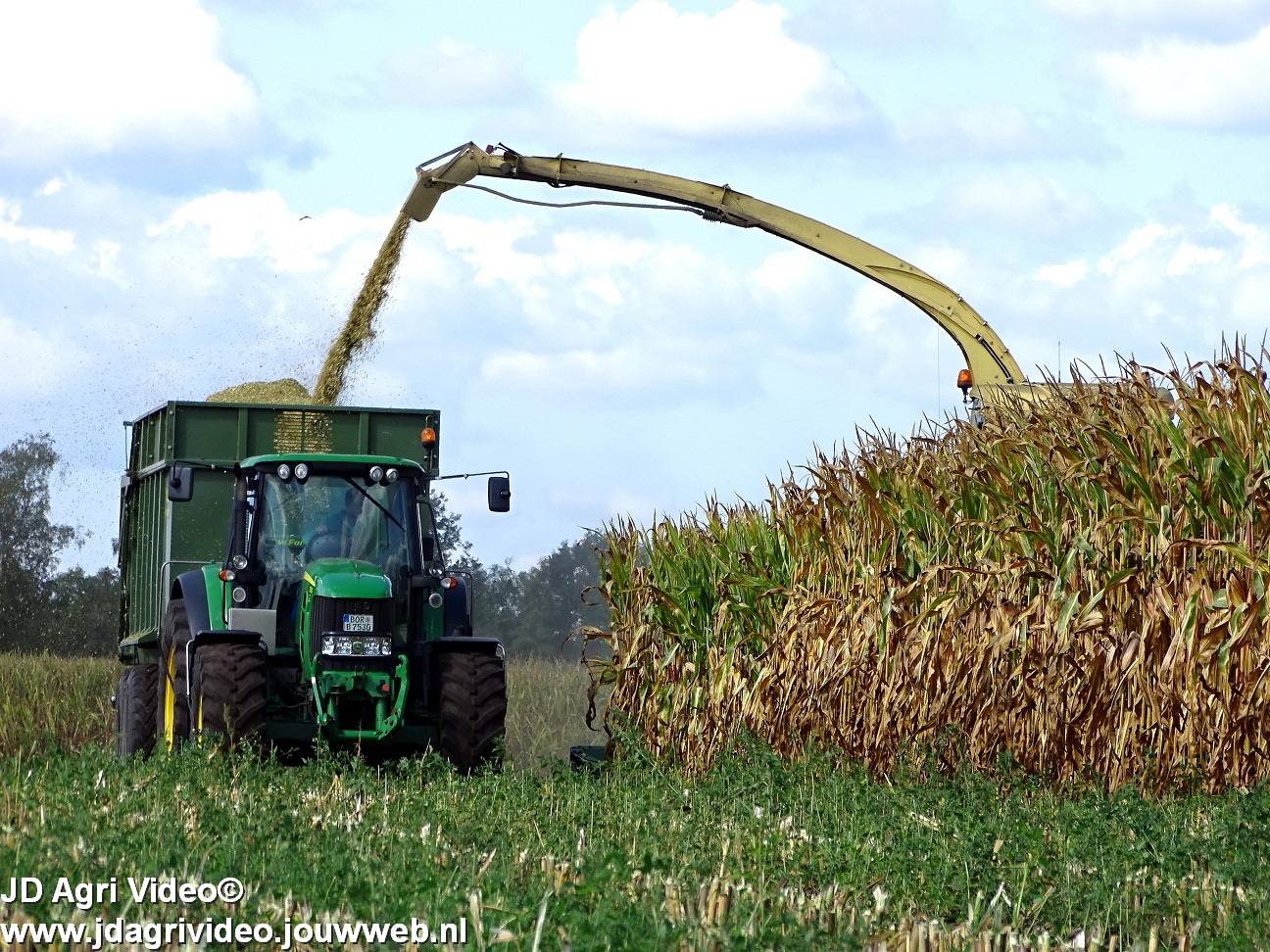Lohnunternehmen ASW-Ochtrup (Agrar-Service Wessendrof) (D) aan het mais hakselen met een Krone BigX 700 met Krone EasyCollect 12 rijer, John Deere 6430 met Veenhuis Super Silagewagen, John Deere 8630 met Tebbe silagewagen, John Deere 6195 met Kaweco Radium 50 en een John Deere 7530 met Fortuna Muldenkipper .