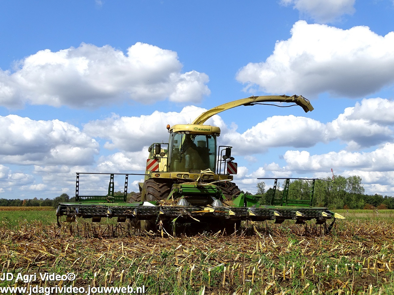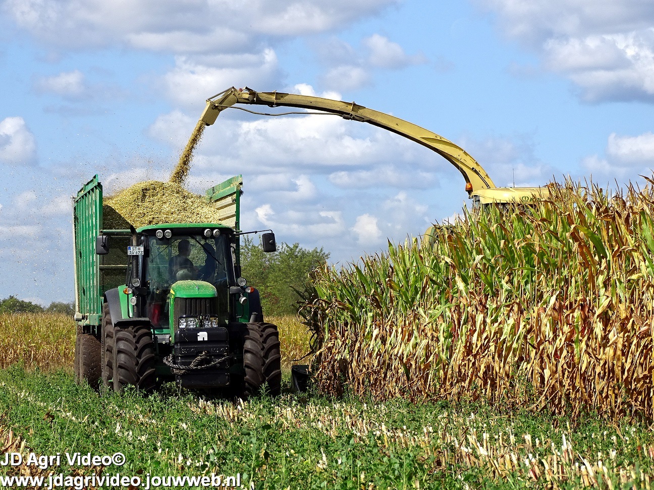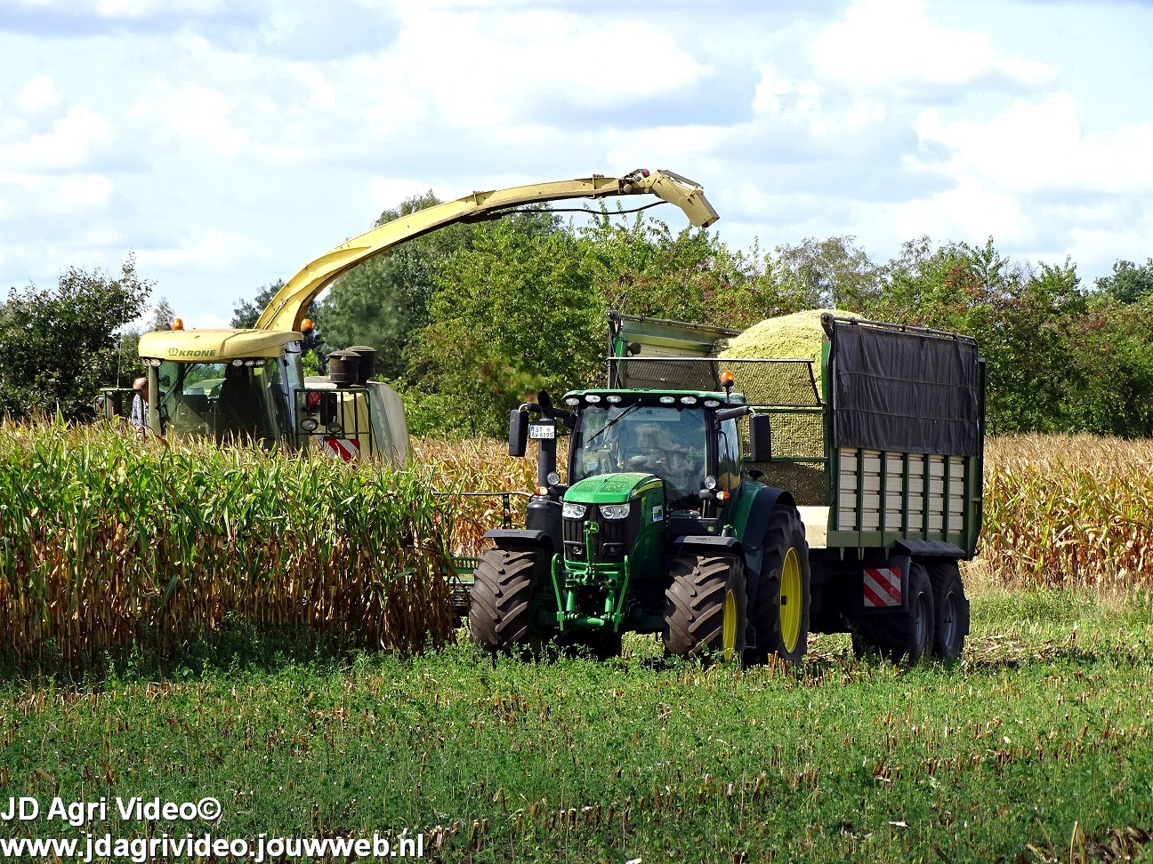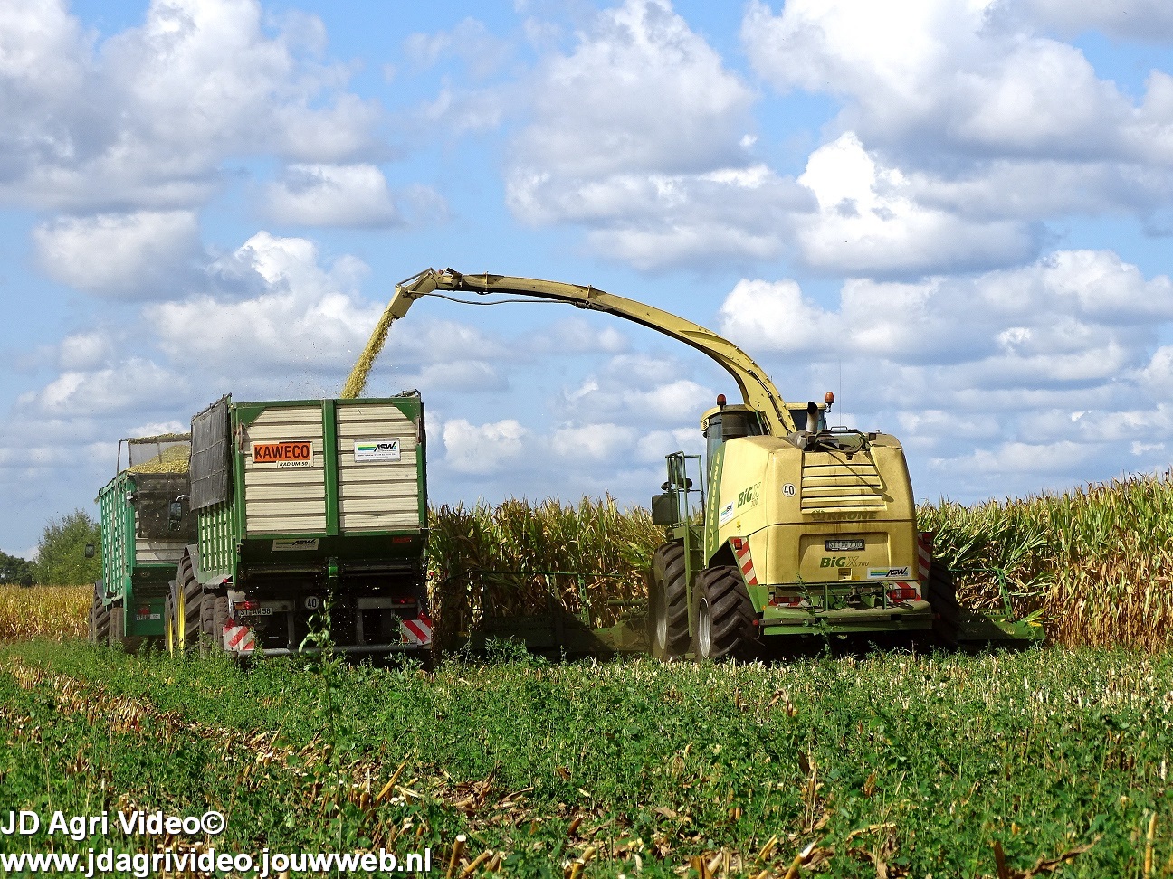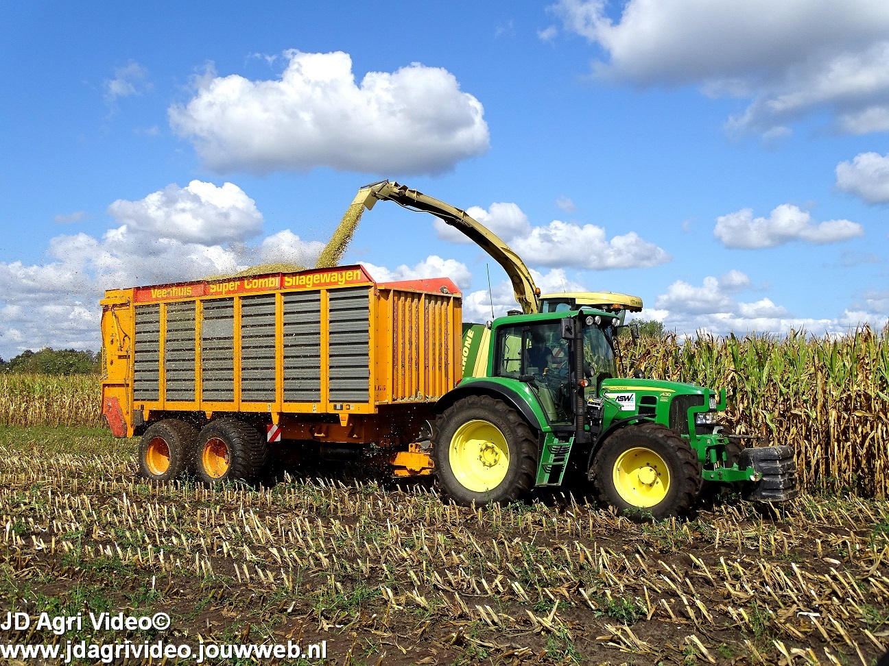 Lohnunternehmen ASW-Ochtrup (Agrar-Service Wessendrof) (D) aan het mais hakselen met een Krone BigX 700 met Krone EasyCollect 12 rijer, John Deere 6430 met Veenhuis Super Silagewagen, John Deere 8630 met Tebbe silagewagen, John Deere 6195 met Kaweco Radium 50 en een John Deere 7530 met Fortuna Muldenkipper .