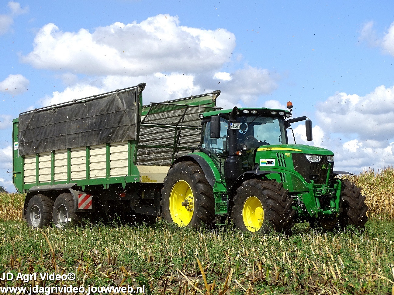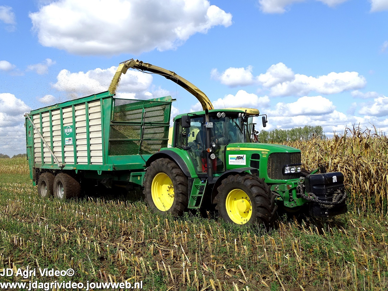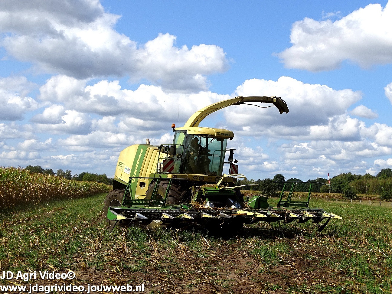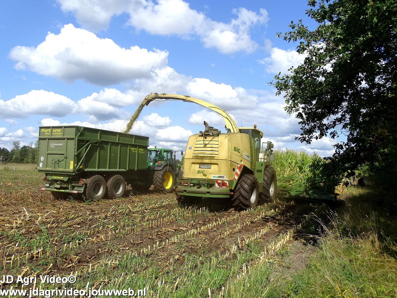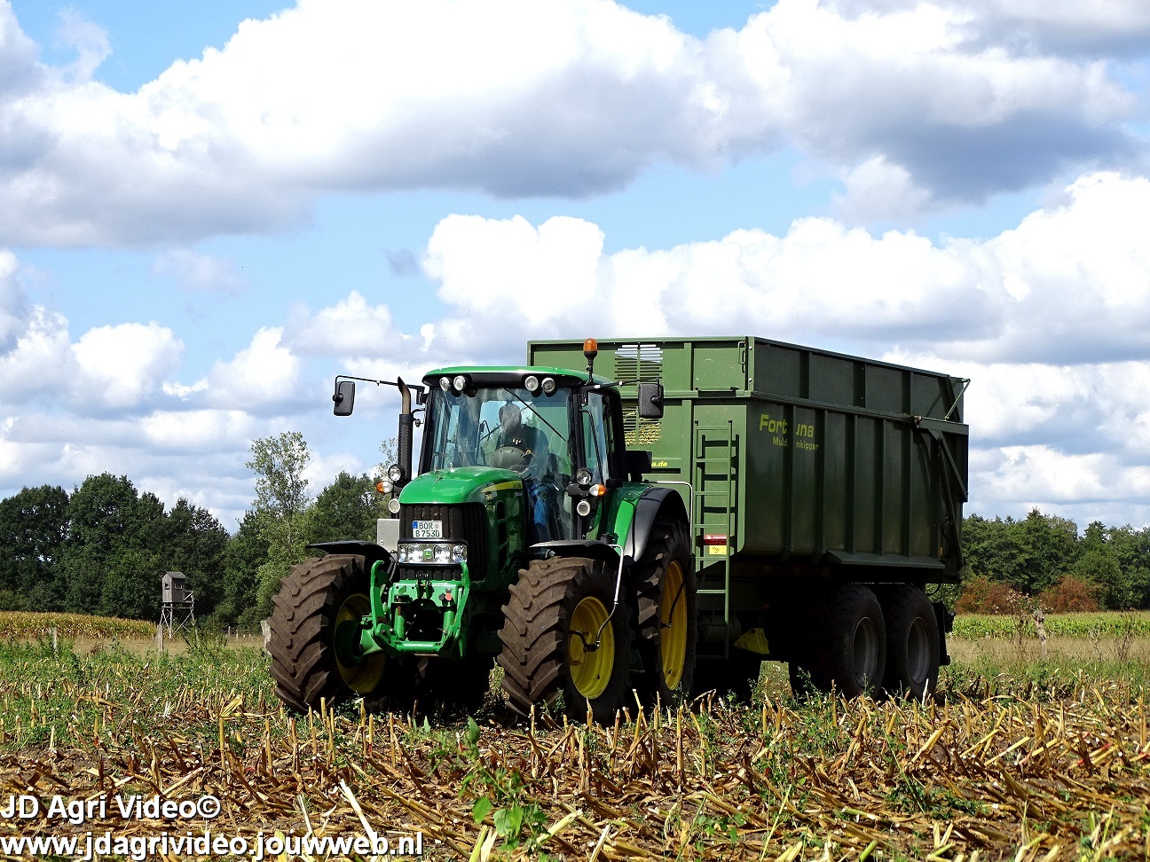 Lohnunternehmen ASW-Ochtrup (Agrar-Service Wessendrof) (D) aan het mais hakselen met een Krone BigX 700 met Krone EasyCollect 12 rijer, John Deere 6430 met Veenhuis Super Silagewagen, John Deere 8630 met Tebbe silagewagen, John Deere 6195 met Kaweco Radium 50 en een John Deere 7530 met Fortuna Muldenkipper .