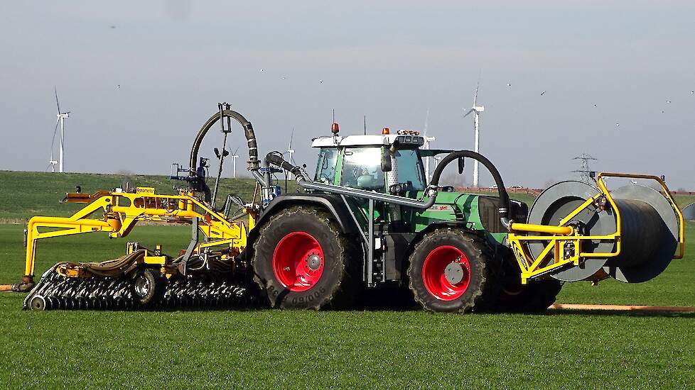 Loonbedrijf Johan Frens uit Hulshorst aan het sleepslangbemesten bij Zeewolde met een Fendt 926 met Tjalma/Agrometer bemester en een Fendt 718 voor de pomp.