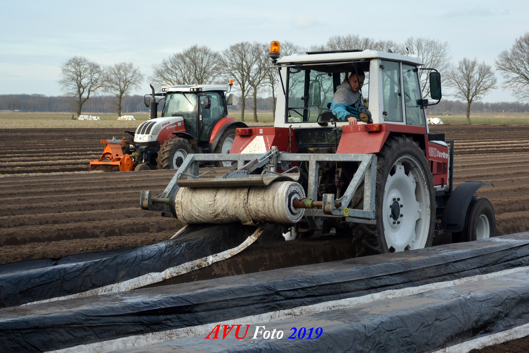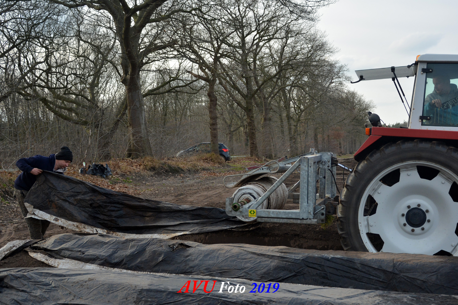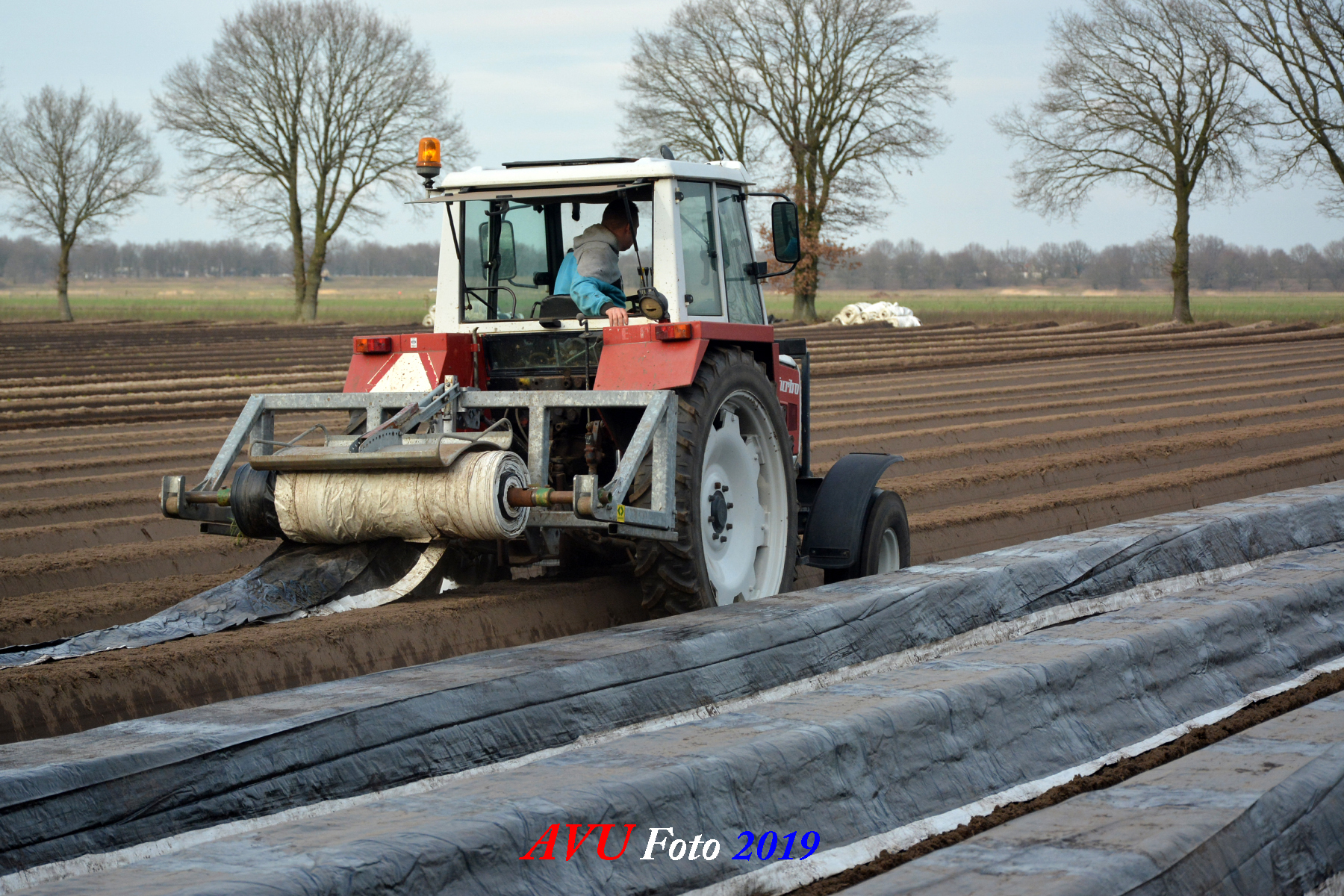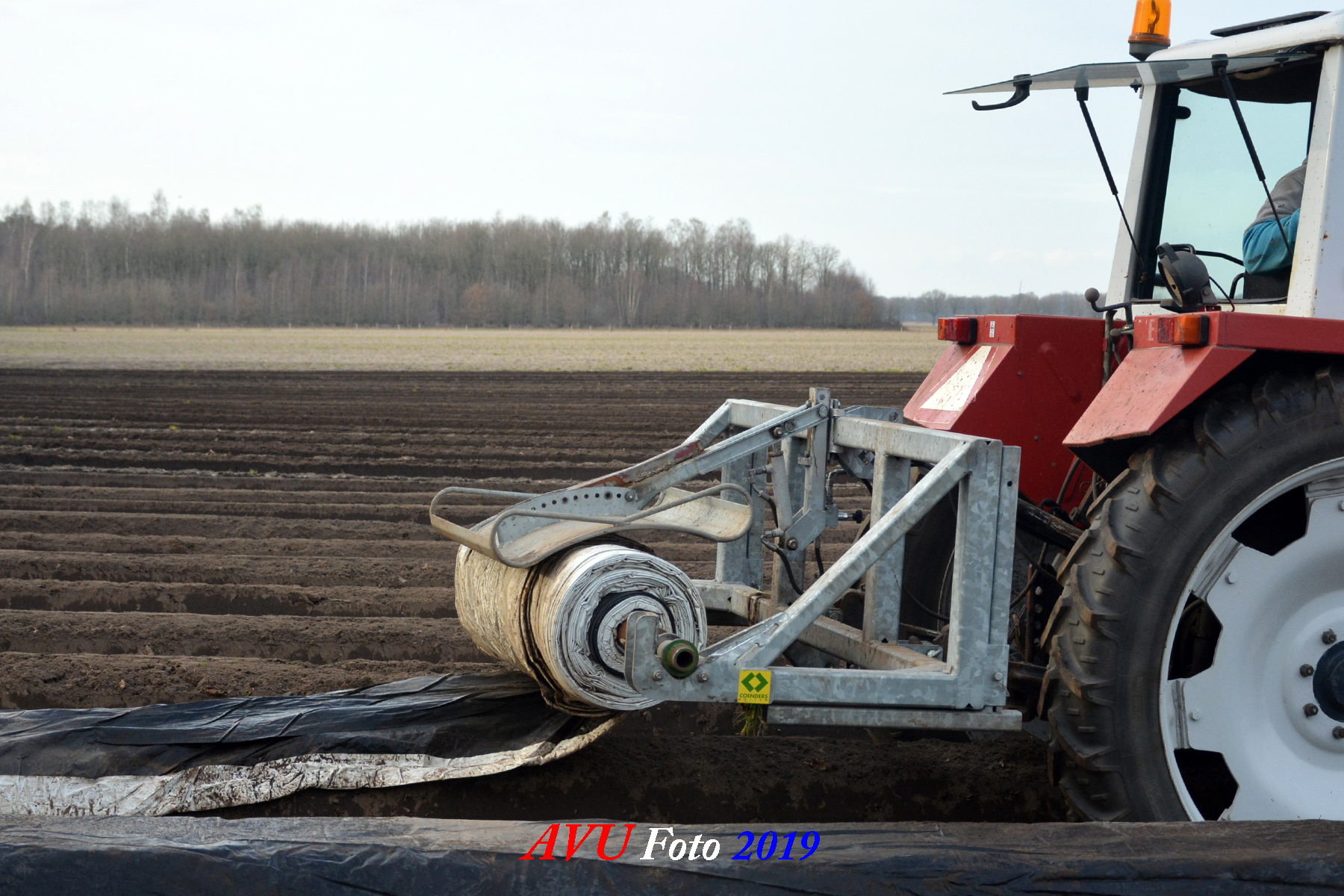 De eerder gevormde aspergeruggen worden door een eenvoudige folie-afroller voorzien van speciale folie, waarbij aan de onderzijde ruimte is gecreëerd om wat zand in te plaatsen zodat deze strak op de rug blijft liggen. Aan de kopeinden wordt deze folie vastgebonden en vastgezet aan een grondpaal om te zorgen dat de wind deze niet opblaast. Reageren mag.