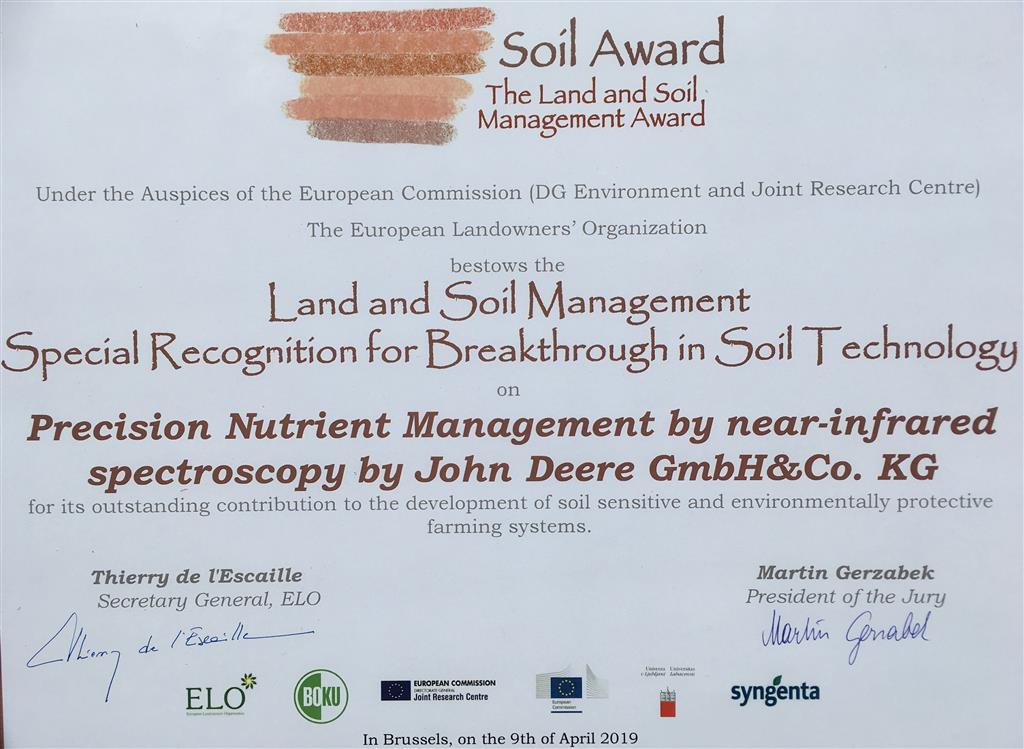 Deze speciale waarderingsprijs werd op 9 april uitgereikt tijdens Forum for Agriculture (FFA) door de European Landowners Organization (ELO) voor deze belangrijke doorbraak in bodemtechnologie. De jury legde de nadruk op de uitstekende werkwijze voor grondgebruik en bodembeheer waardoor bodembedreigingen verminderd worden. De HarvestLab 3000 biedt landbouwers en loonwerkers een nieuwe technologie voor het duurzamer beheren van de voedingscyclus en het verbeteren van de efficiëntie van het gebruik van meststoffen. Het doel is om over- of onderbemesting te voorkomen door het constant meten van de nutriëntenwaarden tijdens het toedienen van mest. John Deere Mestanalyse stelt landbouwers in staat om real time stikstof, fosfaat en kalium toe te dienen op basis van een streefwaarde voor voedingsstoffen en/ of maximale snelheid in kg/ ha. Deze ingrediënten en het totale toegepaste volume zijn gedocumenteerd en het systeem kan ook plaats specifiek doseren.