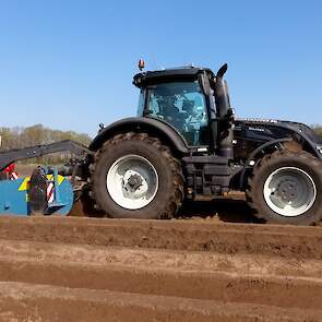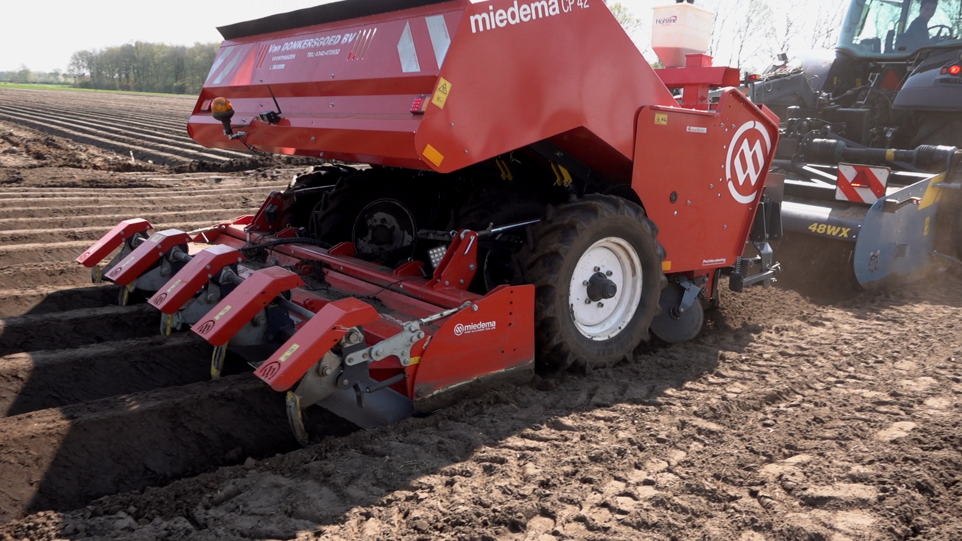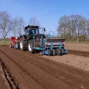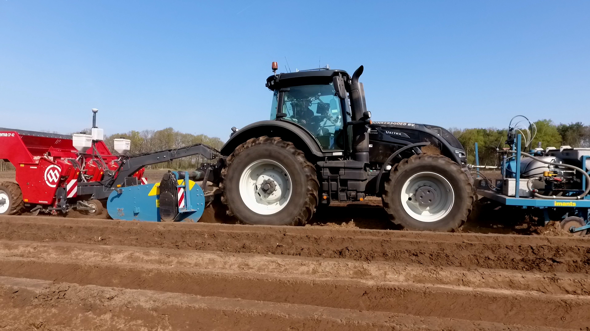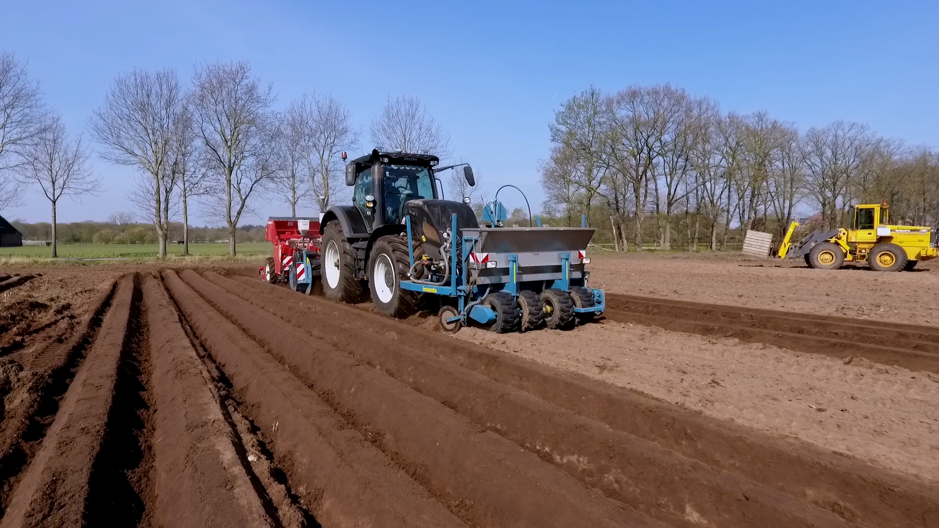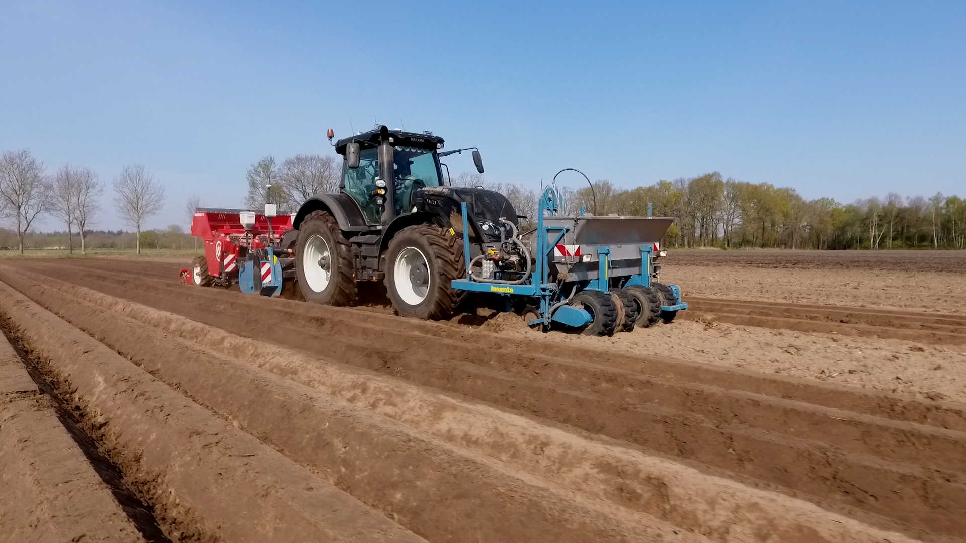 Aardappelen poten door Van Donkersgoed BV met deze imposante combinatie bestaande uit een Valtra S294 met Imants spitmachine en een getrokken Miedema CP 42.