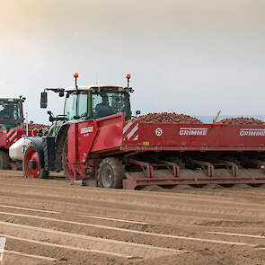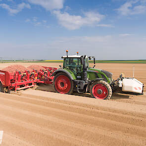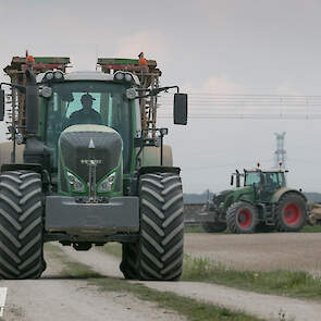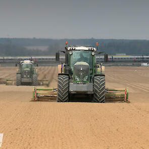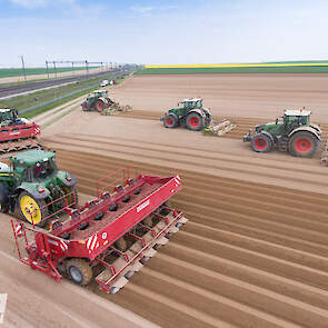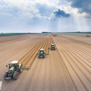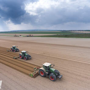 Grimme GL 36T-aardappelpootmachines. Te zien zijn onder meer een Fendt 930, 936, 939 en Fendt 722 Vario. Tevens een John Deere 7820.