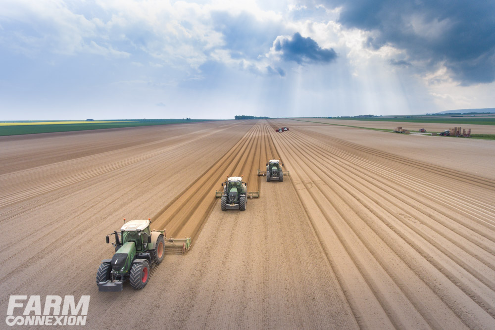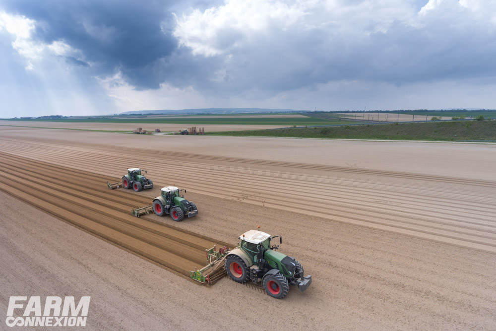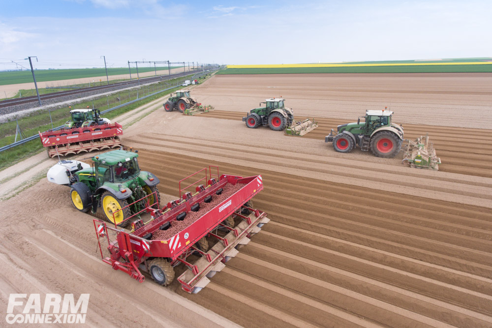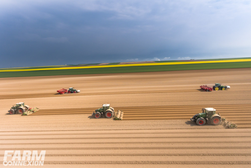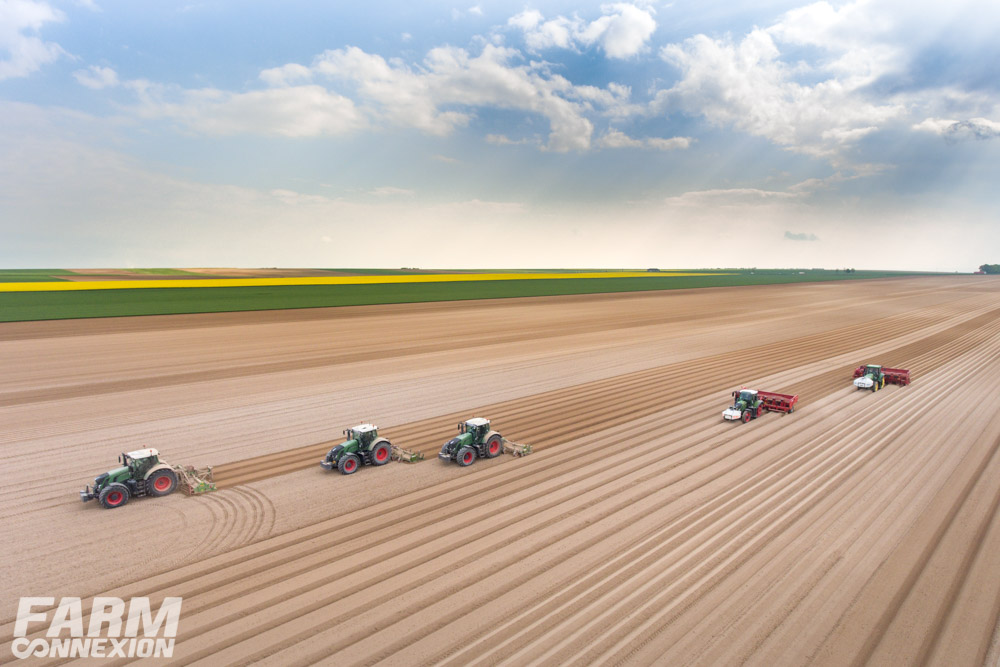 Grimme GL 36T-aardappelpootmachines. Te zien zijn onder meer een Fendt 930, 936, 939 en Fendt 722 Vario. Tevens een John Deere 7820.