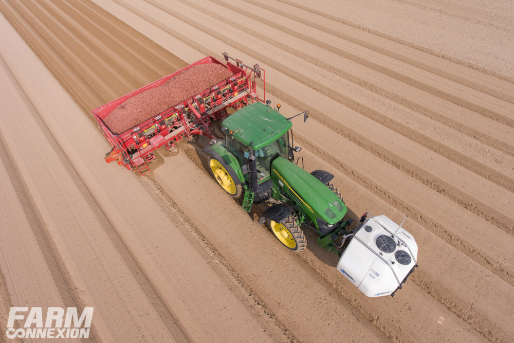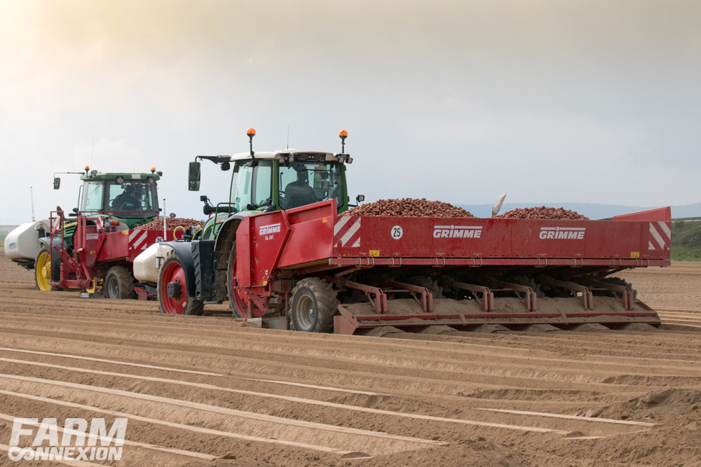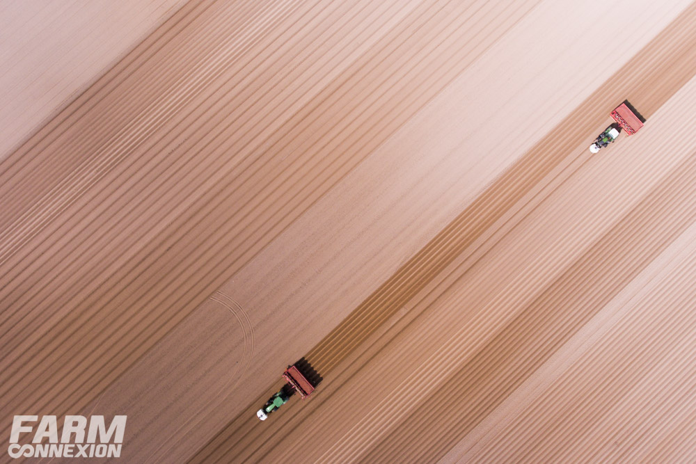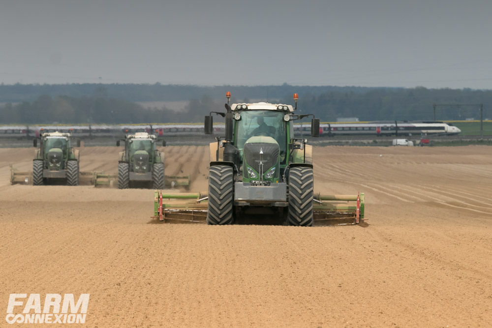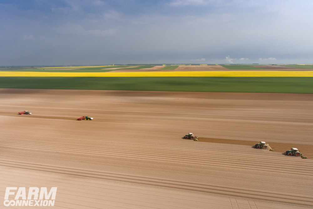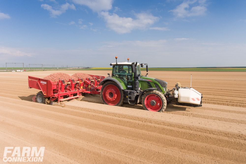 Grimme GL 36T-aardappelpootmachines. Te zien zijn onder meer een Fendt 930, 936, 939 en Fendt 722 Vario. Tevens een John Deere 7820.