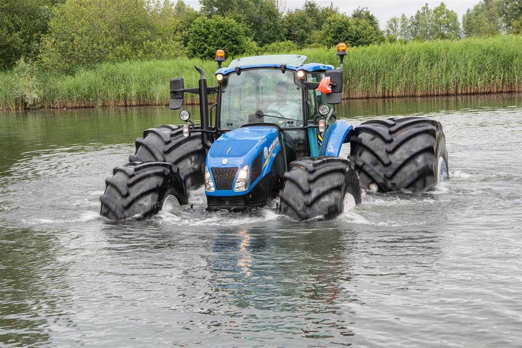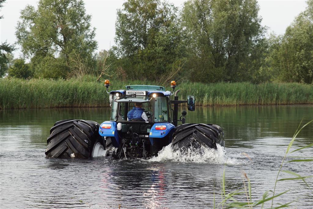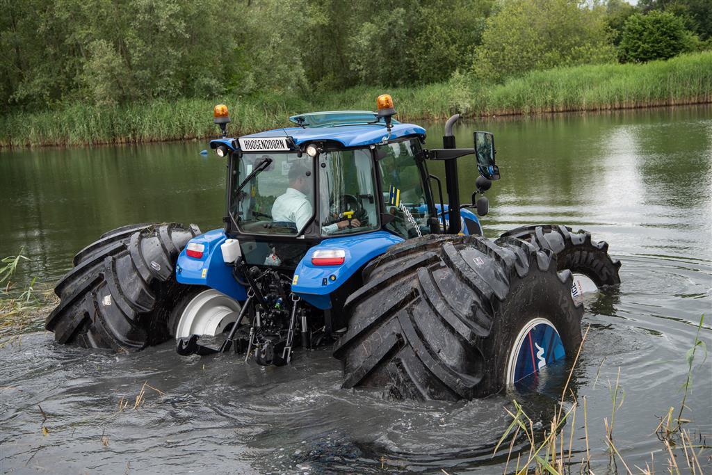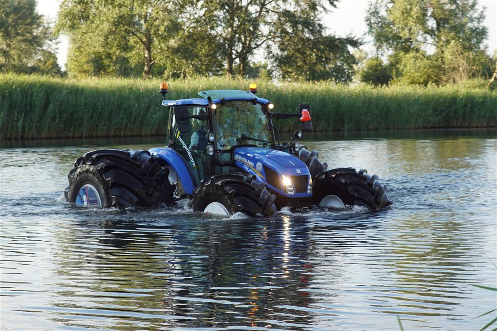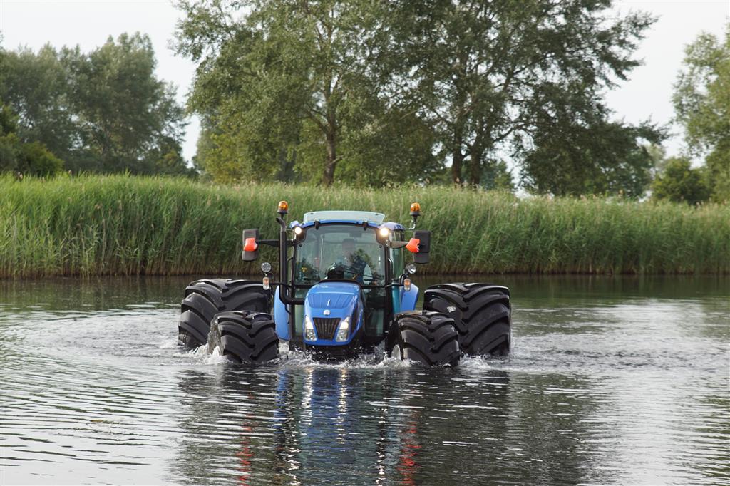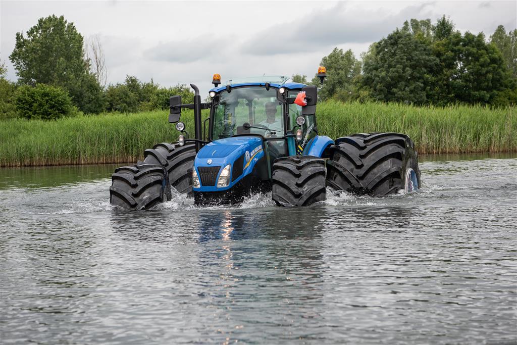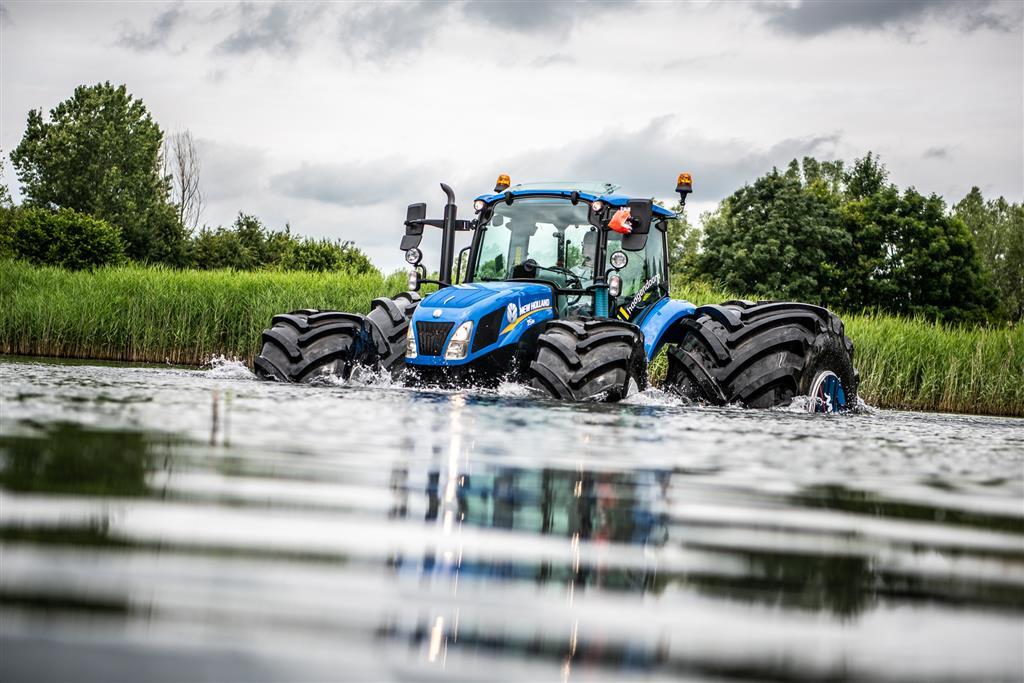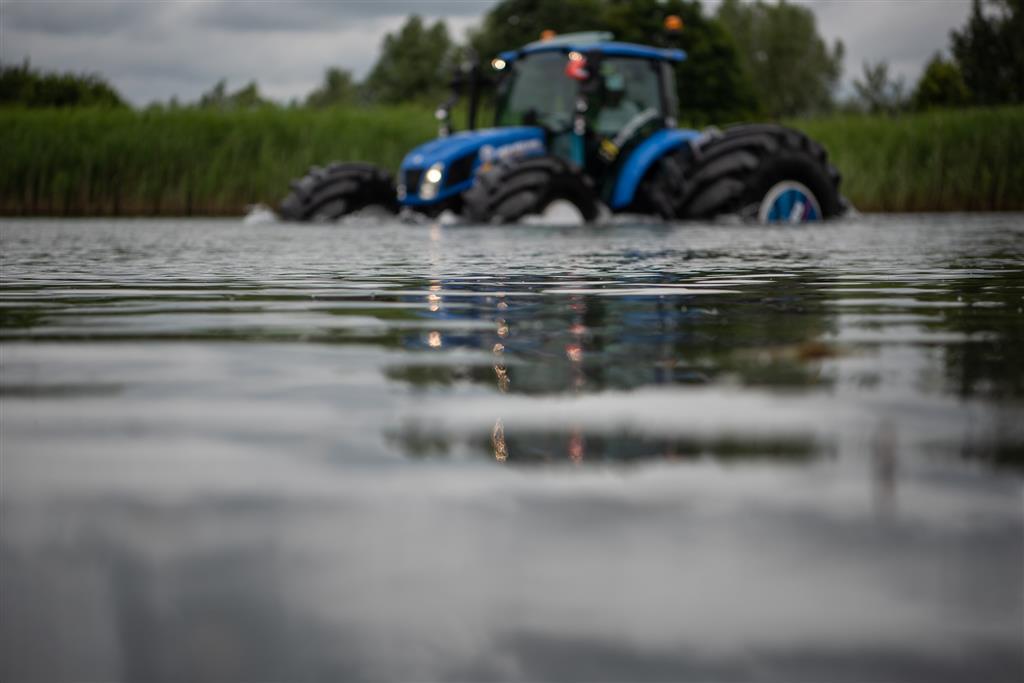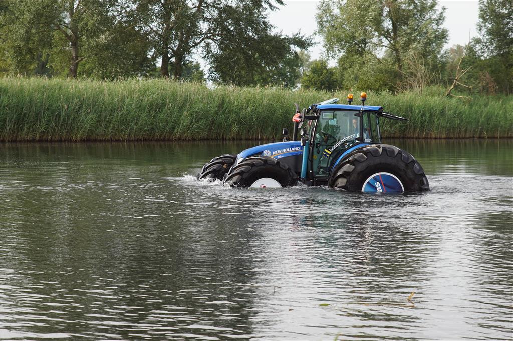 New Holland T5.85 neemt verfrissende duik: "Het gaat allemaal over drijfvermogen. De combinatie van volume en lucht in de gemonteerde banden maakte het mogelijk een trekker op het water te laten drijven. Stel je de lagedrukverdeling op de grond eens voor als de machine haar dagelijkse werk doet."