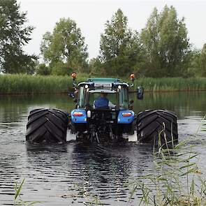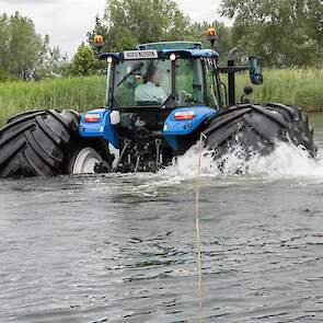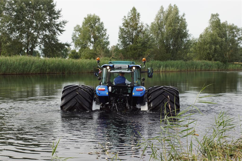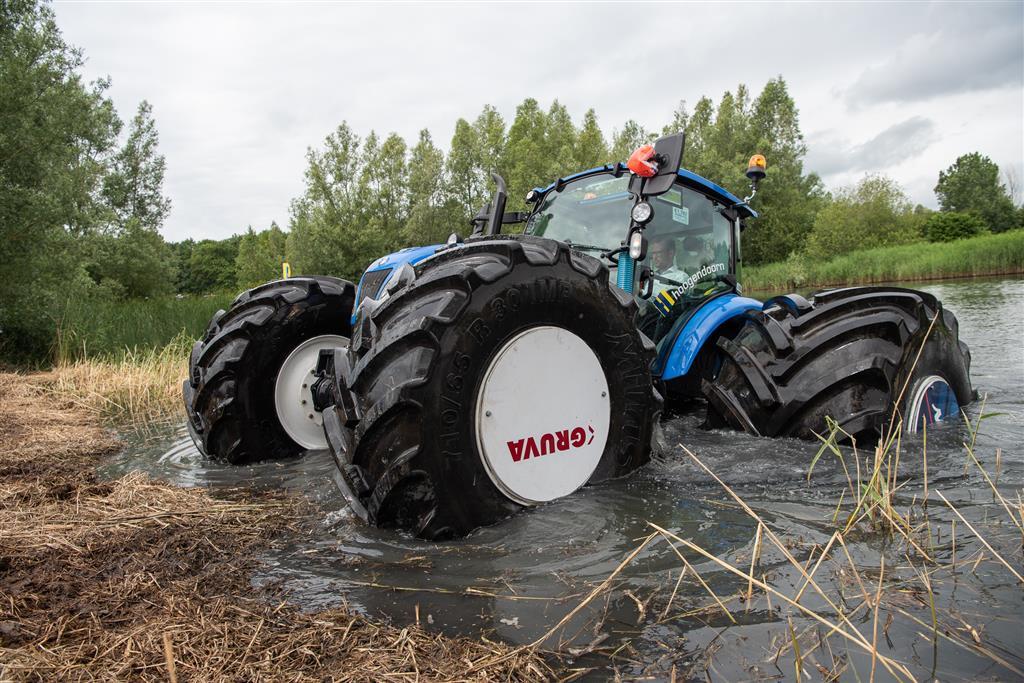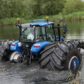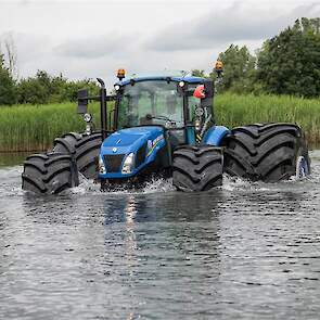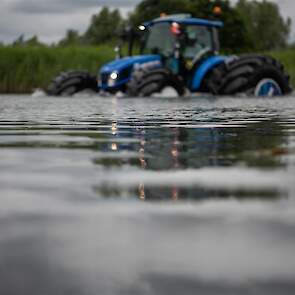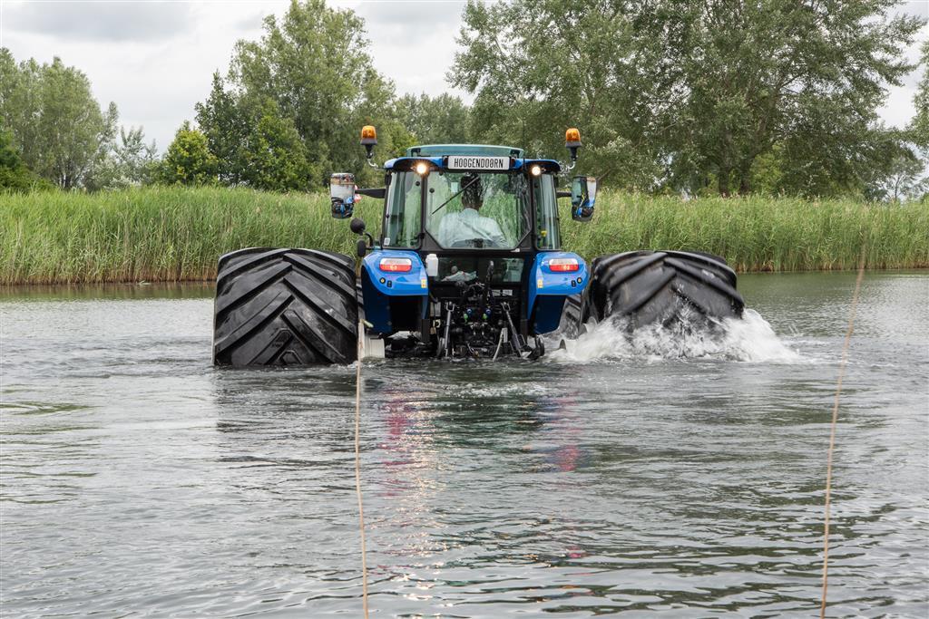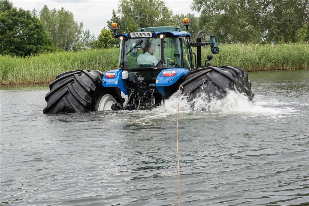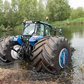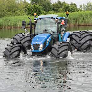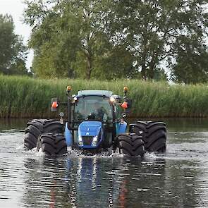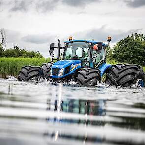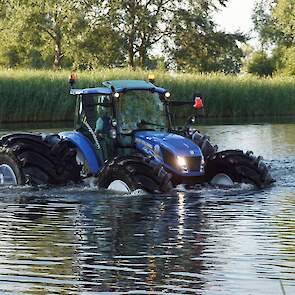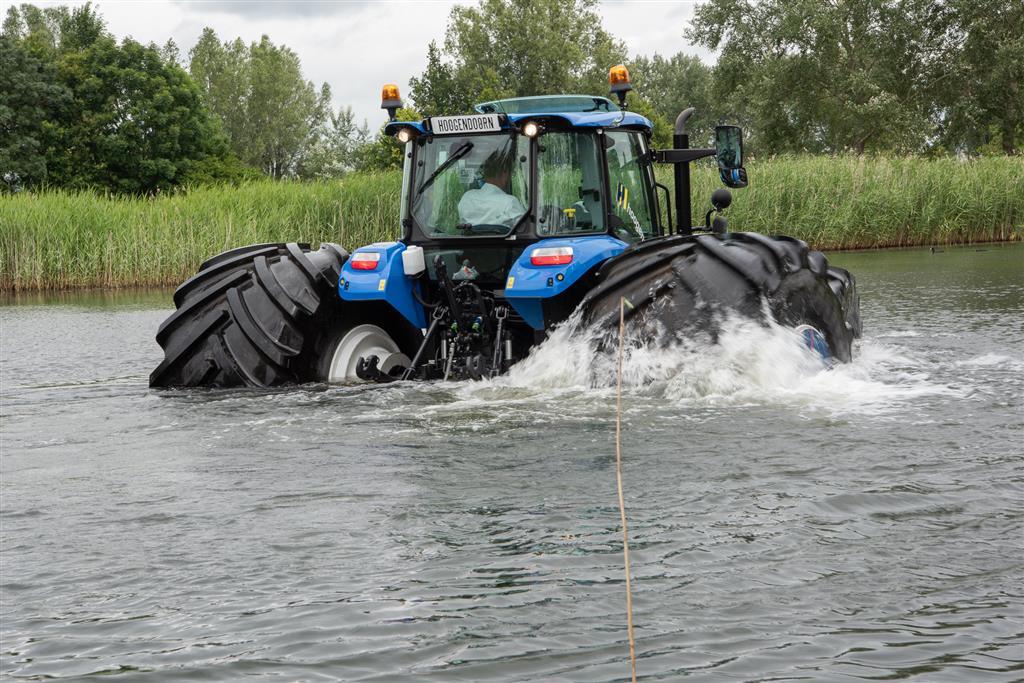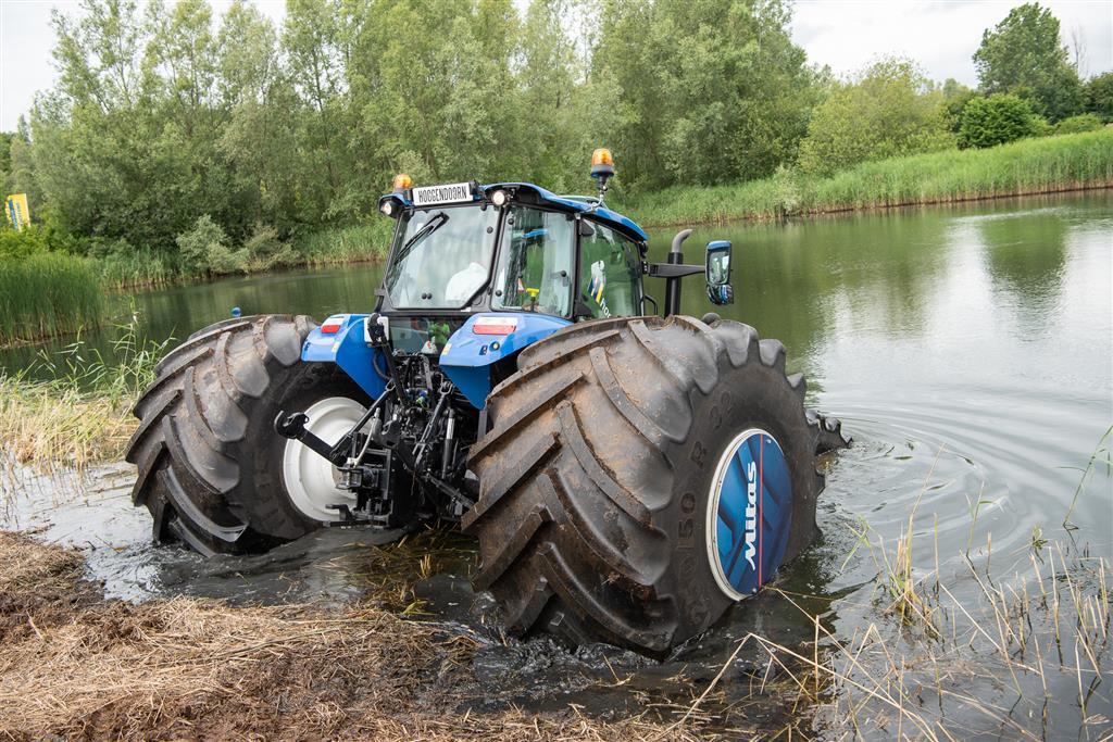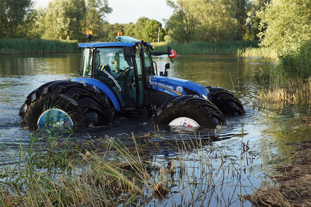 New Holland T5.85 neemt verfrissende duik: "Het gaat allemaal over drijfvermogen. De combinatie van volume en lucht in de gemonteerde banden maakte het mogelijk een trekker op het water te laten drijven. Stel je de lagedrukverdeling op de grond eens voor als de machine haar dagelijkse werk doet."