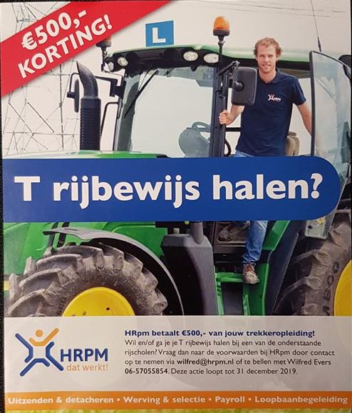 Nu maar hopen dat ze dat helpt, aldus Rik. Voor 2019 hebben we weer wat leuke acties voor onze leerlingen in petto. Zo wordt de "Trekker-merk jassen" van 2018 weer voortgezet, en zullen er weer menig John Deere-, Fendt-, MF-, New Holland-, Case IH-, Deutz- en overige merkjassen uitgedeeld worden. Leerlingen die zich op open dagen aanmelden voor de T-opleiding krijgen deze jas zodra ze geslaagd zijn voor het rij-examen, aldus Rik Harenberg. Maar er komt dit jaar ook een geheel nieuwe actie: de "CTR info- en powerdagen".