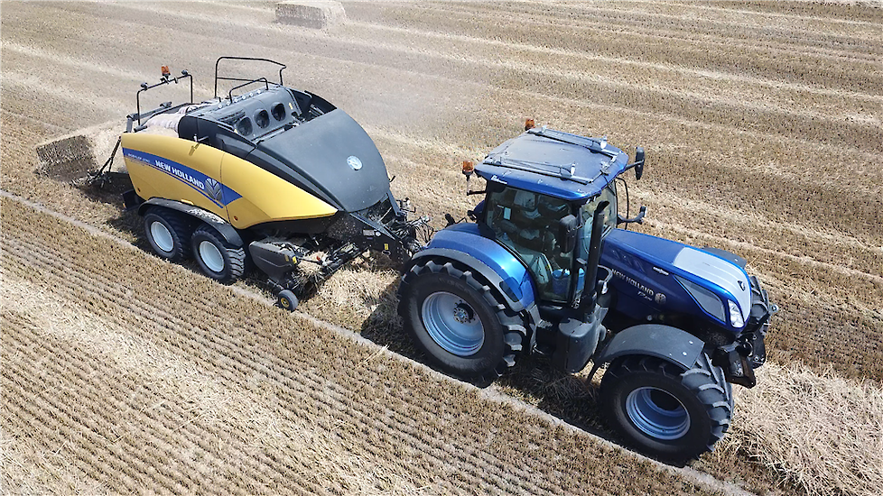 Persen met New Holland en NH-grootpakpers van Termote uit Philipine. De balen worden geladen door een JCB 531-70-verreiker en naar huis vervoerd met New Holland-tractoren en vrachtwagenaanhangwagens.