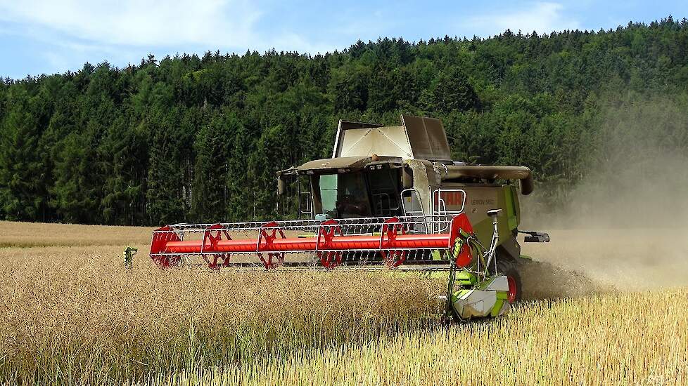 Koolzaad dorsen in Nordenbeck, Korbach (Duitsland) met Claas Lexion 560 en John Deere 6250R met Brantner Z18051 XXl.