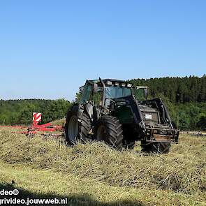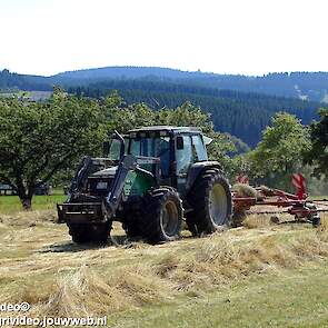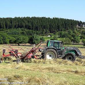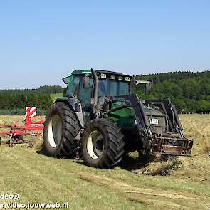 Forstbetrieb Wiederhold uit Winterberg (Duitsland) aan het gras/ hooi harken met een Valmet 8050 met een Pöttinger TOP 700 A-hark.