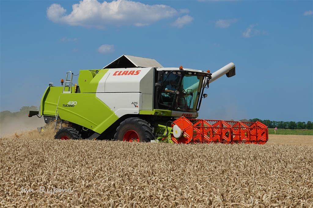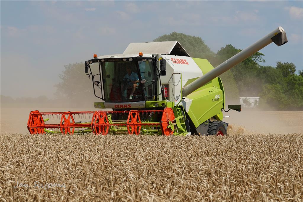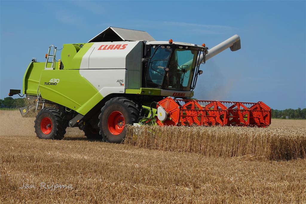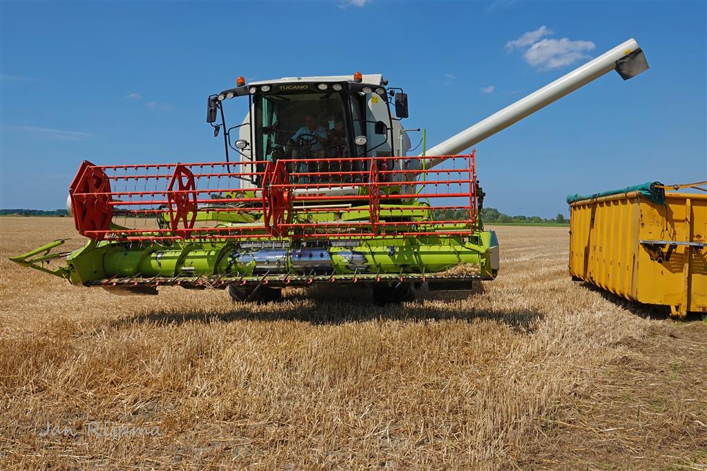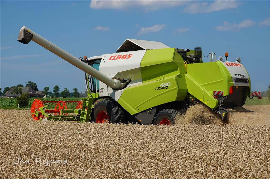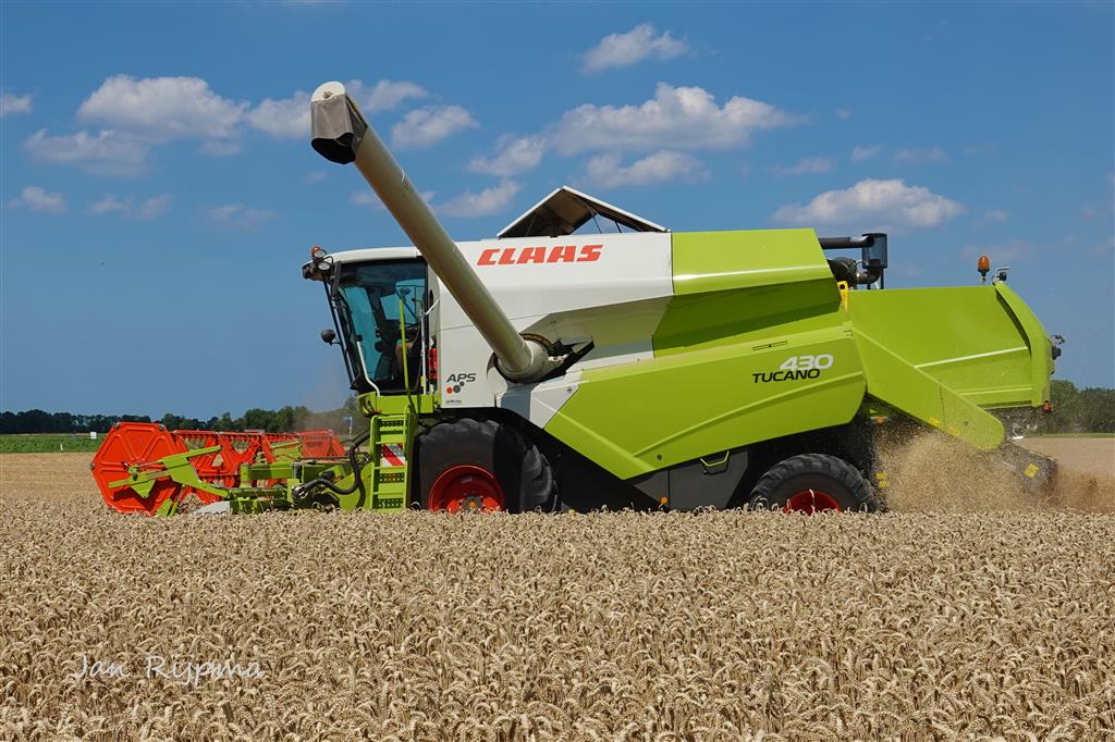 Hugo en Ron van Alphen HET BLAAU BINHUYS uit Warfhuizen met de Claas Tucano 430 en de APS-dorstrommel wintertarwe aan het combinen van de rassen Nordkap en Sacramento. Graantransport door Wit Siddeburen met de Ford Powerstar SLE 6640 en Miedema-kipper.