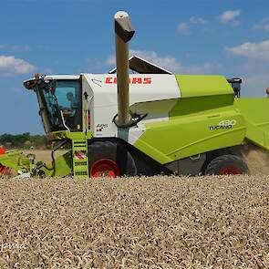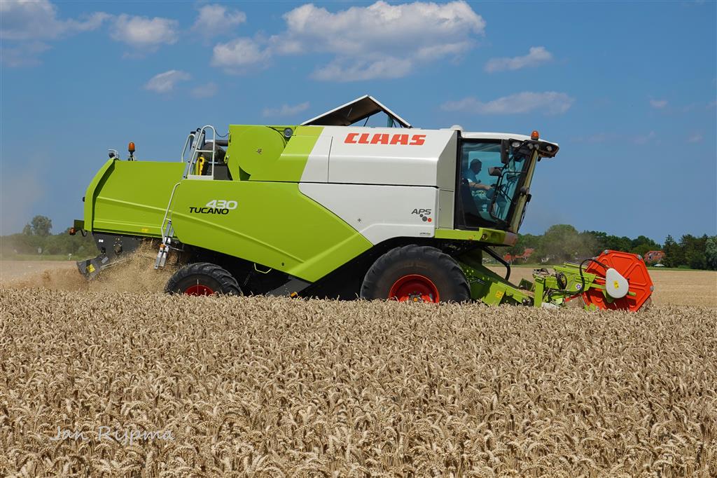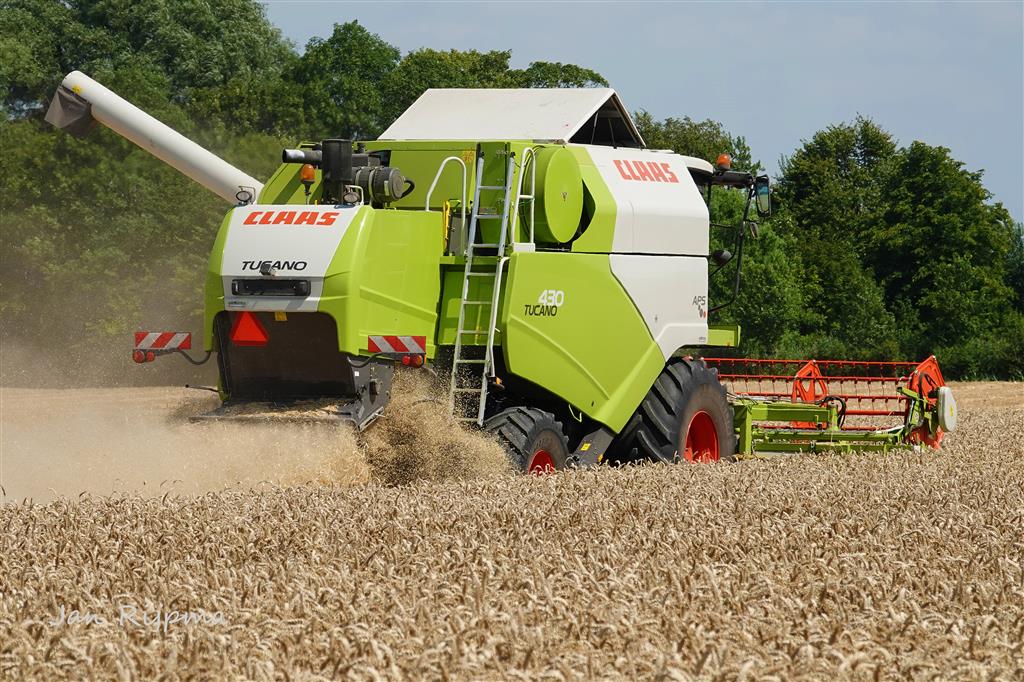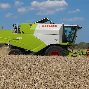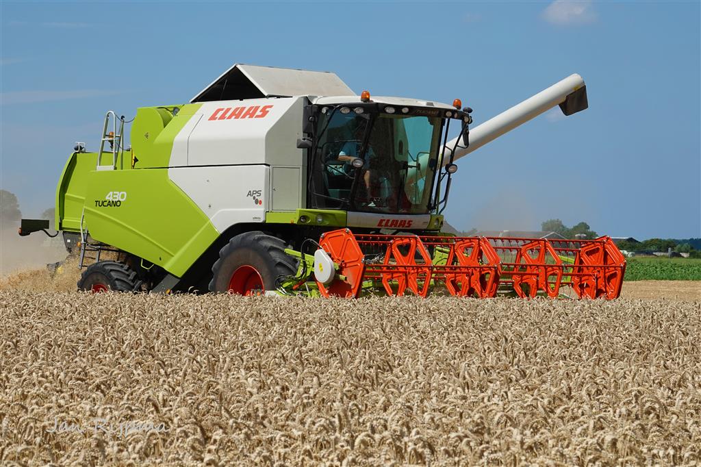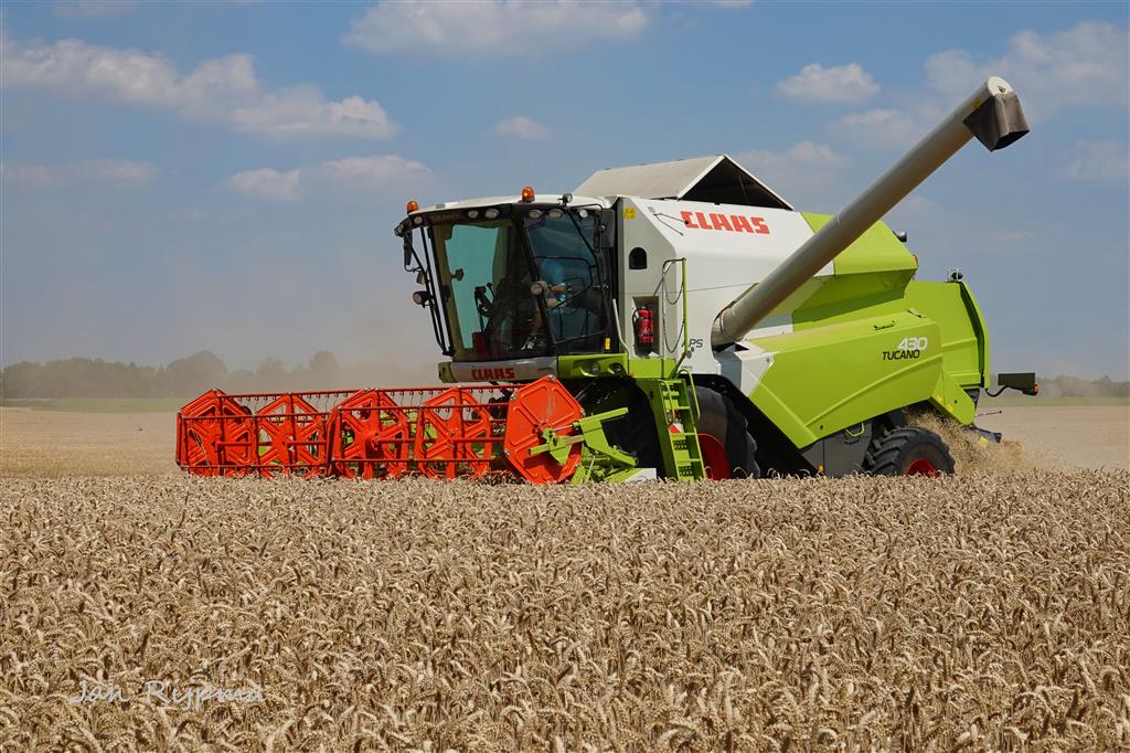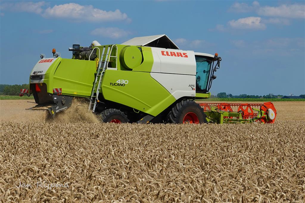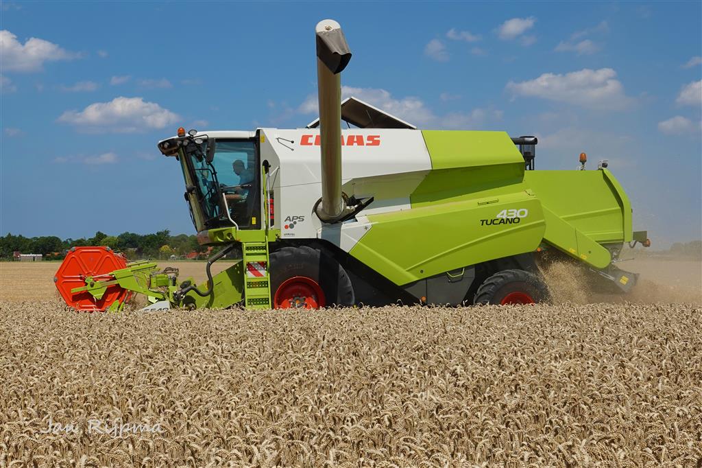 Hugo en Ron van Alphen HET BLAAU BINHUYS uit Warfhuizen met de Claas Tucano 430 en de APS-dorstrommel wintertarwe aan het combinen van de rassen Nordkap en Sacramento. Graantransport door Wit Siddeburen met de Ford Powerstar SLE 6640 en Miedema-kipper.