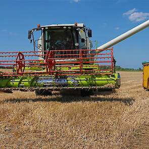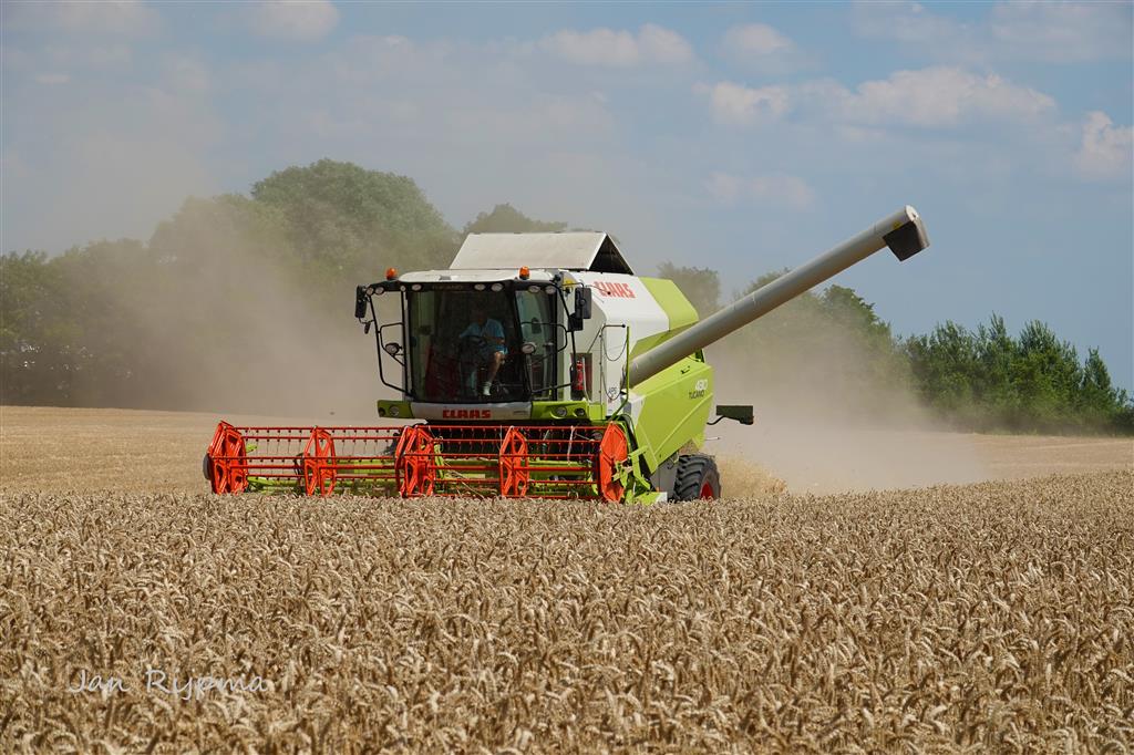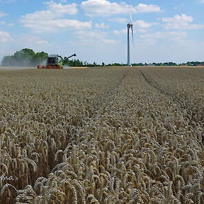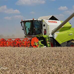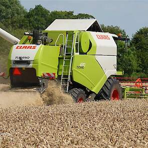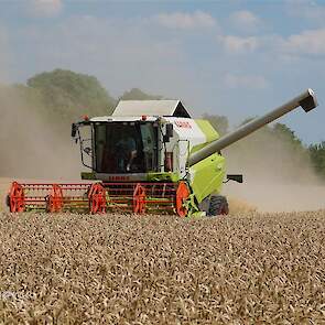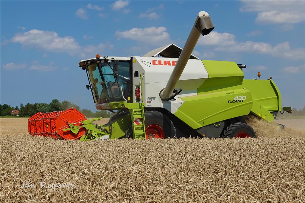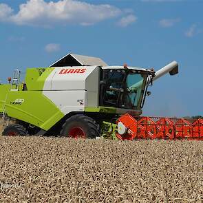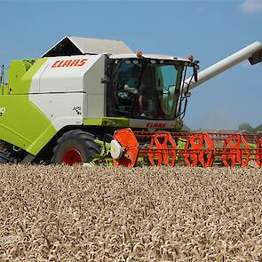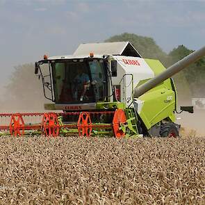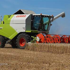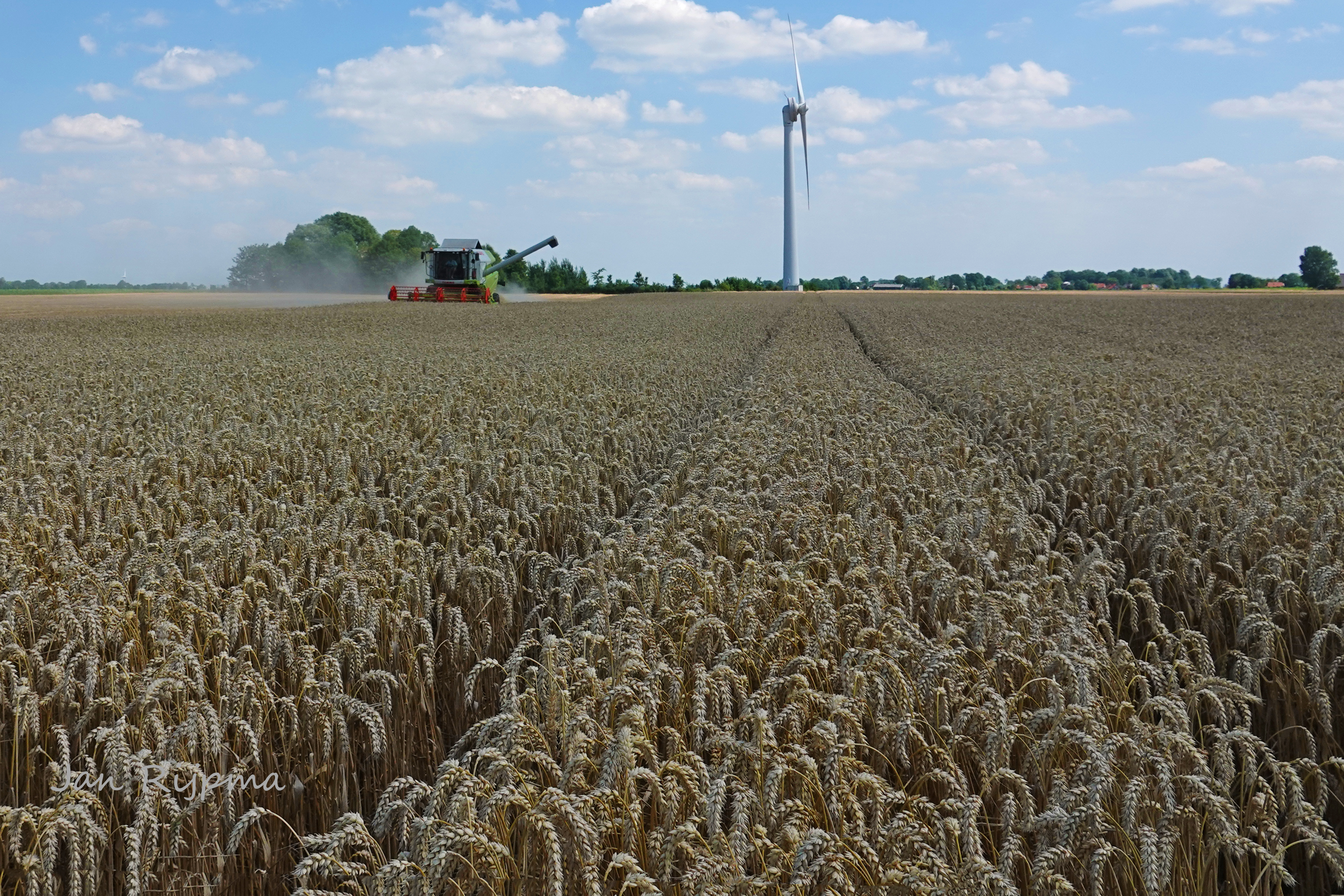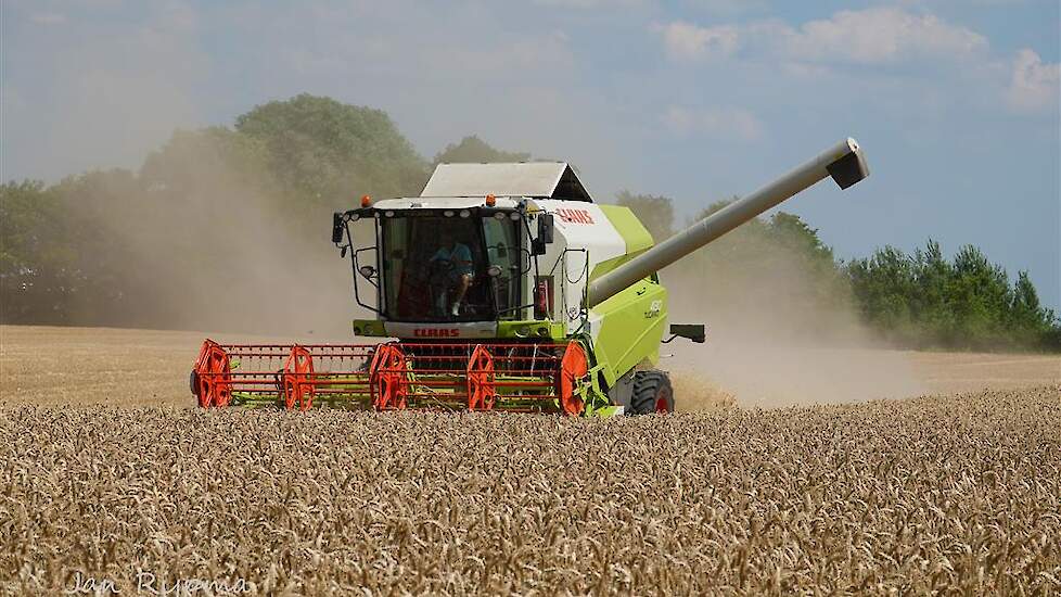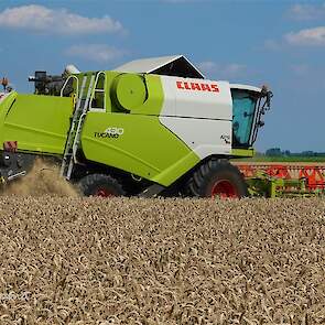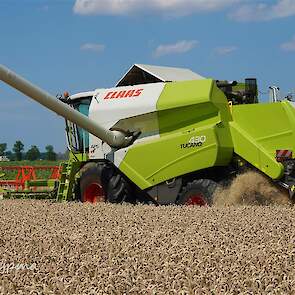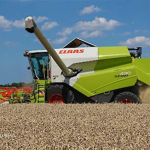 Hugo en Ron van Alphen HET BLAAU BINHUYS uit Warfhuizen met de Claas Tucano 430 en de APS-dorstrommel wintertarwe aan het combinen van de rassen Nordkap en Sacramento. Graantransport door Wit Siddeburen met de Ford Powerstar SLE 6640 en Miedema-kipper.