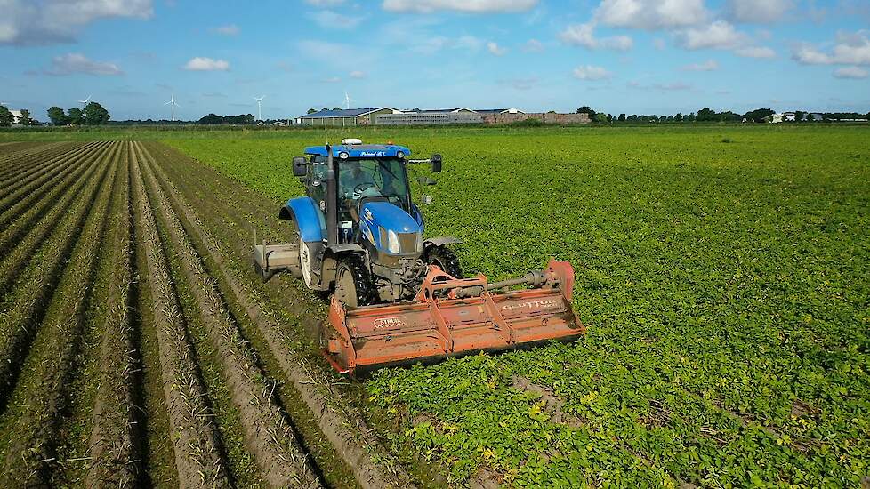 Aardappelen klappen en spuiten door loonbedrijf Poland uit Waarland (NH) met de New Holland T6020 met voorop een Struik-loofklapper en achterop een Loof-Does