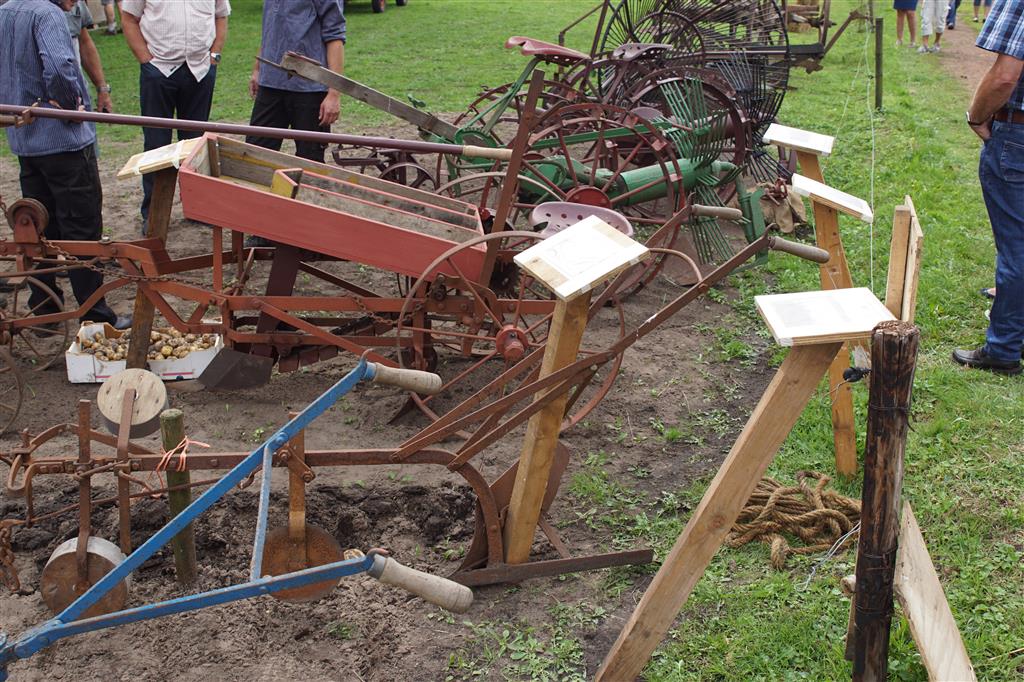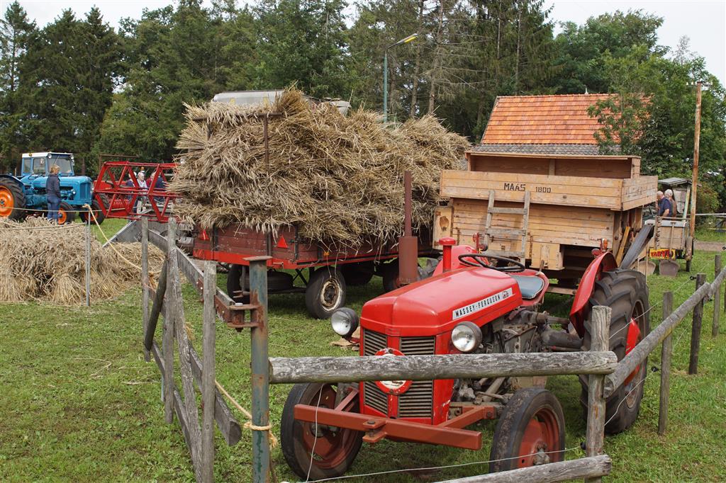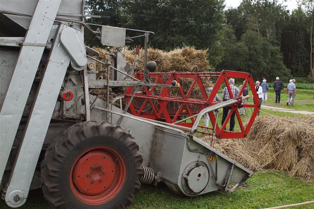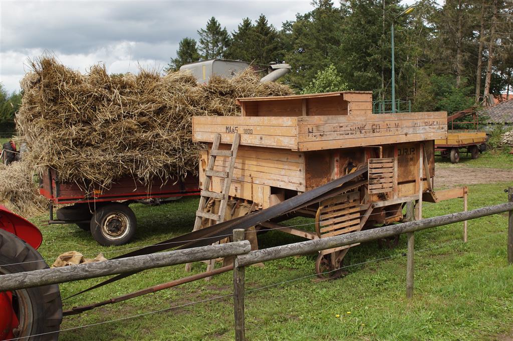 Als voorbereiding op de oogstdag werd vorige week het graan gemaaid. Een groot gedeelte werd met de Fahr-zelfbinder (jaren '30) gemaaid. De schoven werden in hokken gezet, zodat deze verder konden afrijpen en opdrogen. Deze zijn vrijdag op wagens geladen om op de oogstdag te kunnen dorsen. Ook de Claas SF uit 1962 werd van stal gehaald om ruimte te maken voor het binderen (wat eerder met de zeis gebeurde).