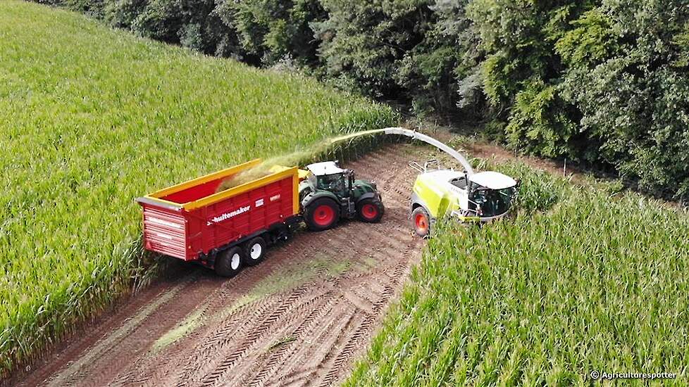 Hier zien we een Claas Jaguar 940 met Fendt's en New Holland's aan het hakselen in Wageningen.