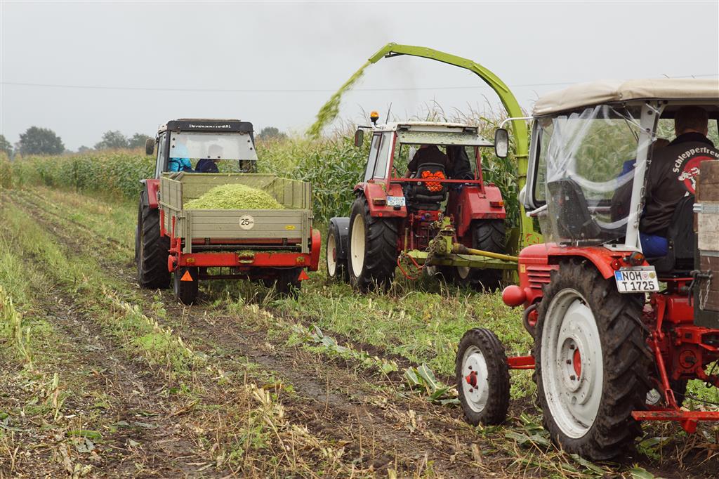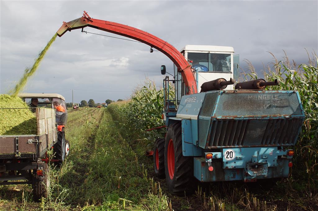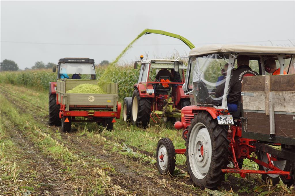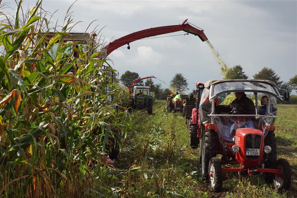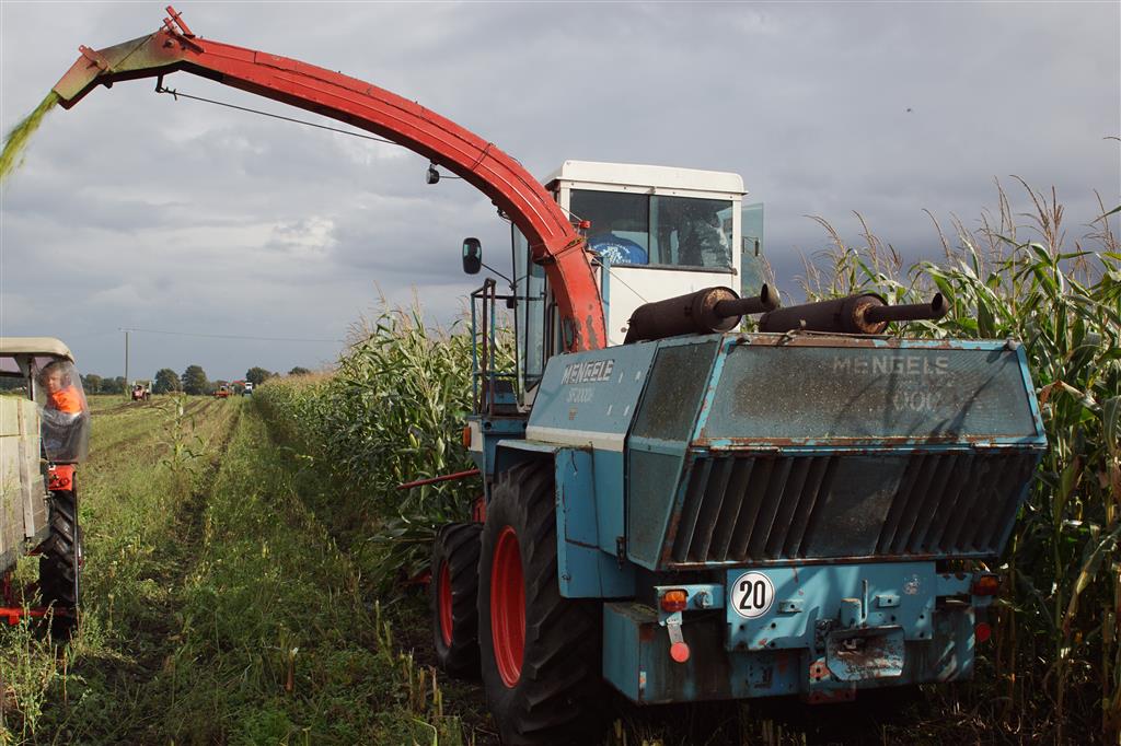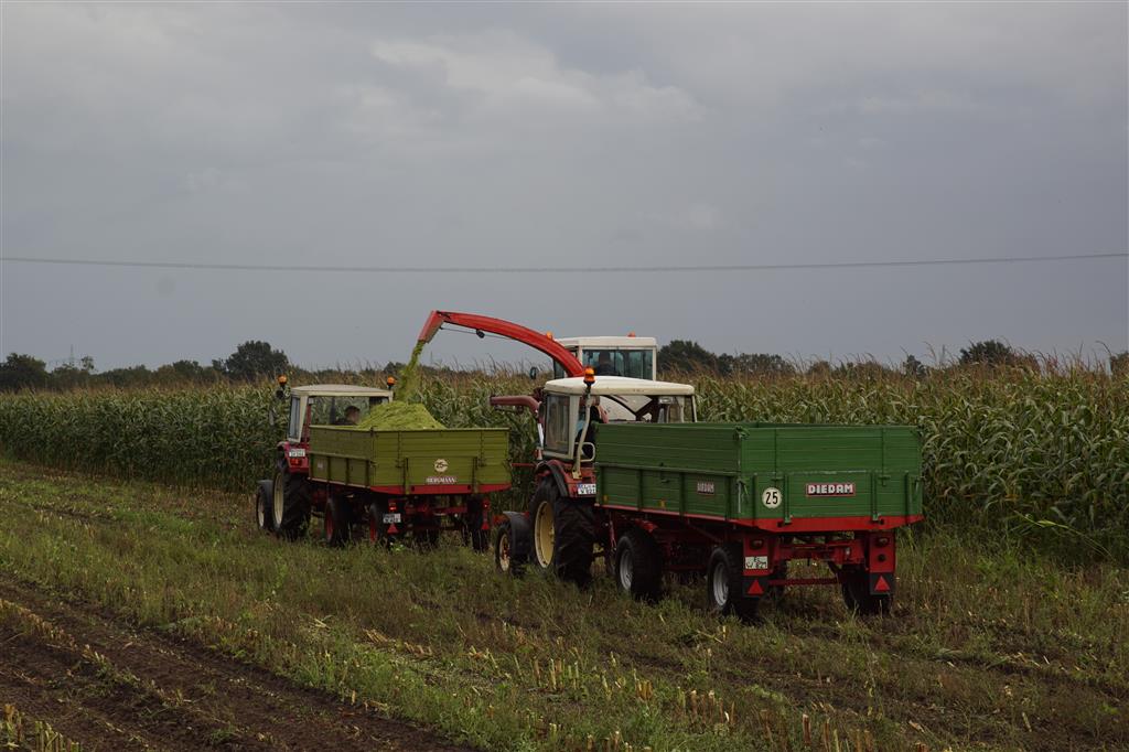 Tijdens deze maïshakseldemonstratiedag werken oude hakselaars in de maïs met behulp van oude trekkers en transportwagens. Nostalgisch geklede chauffeurs gaan terug in de tijd.