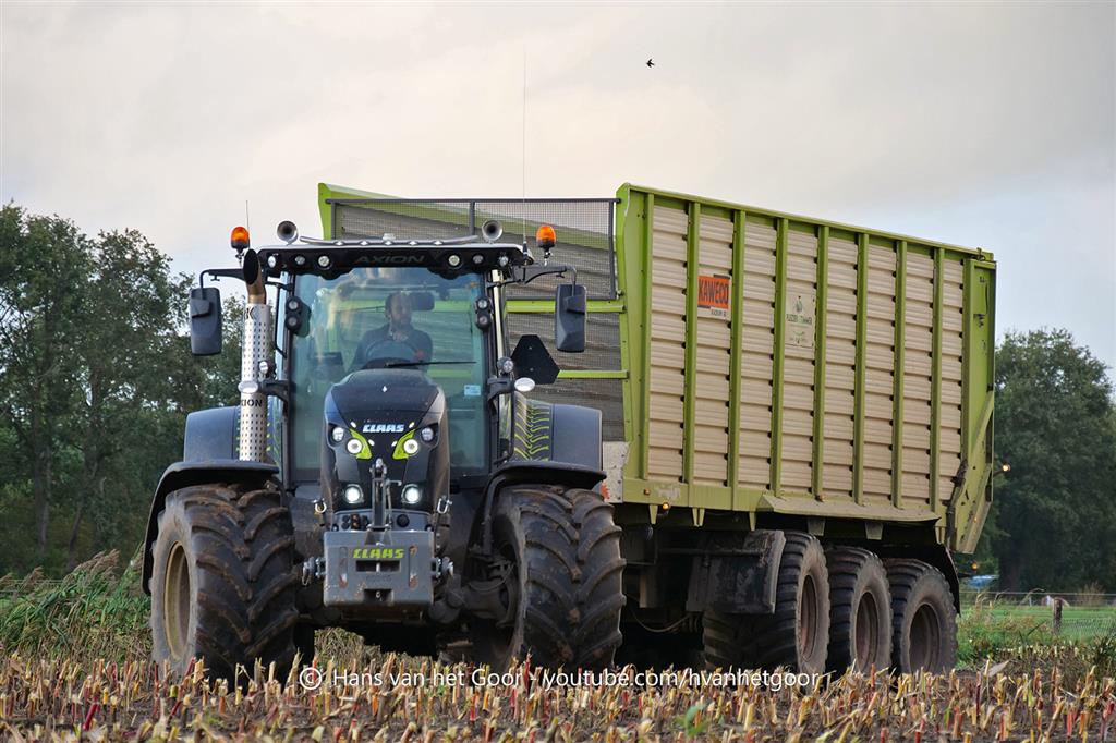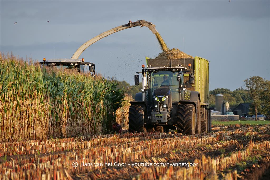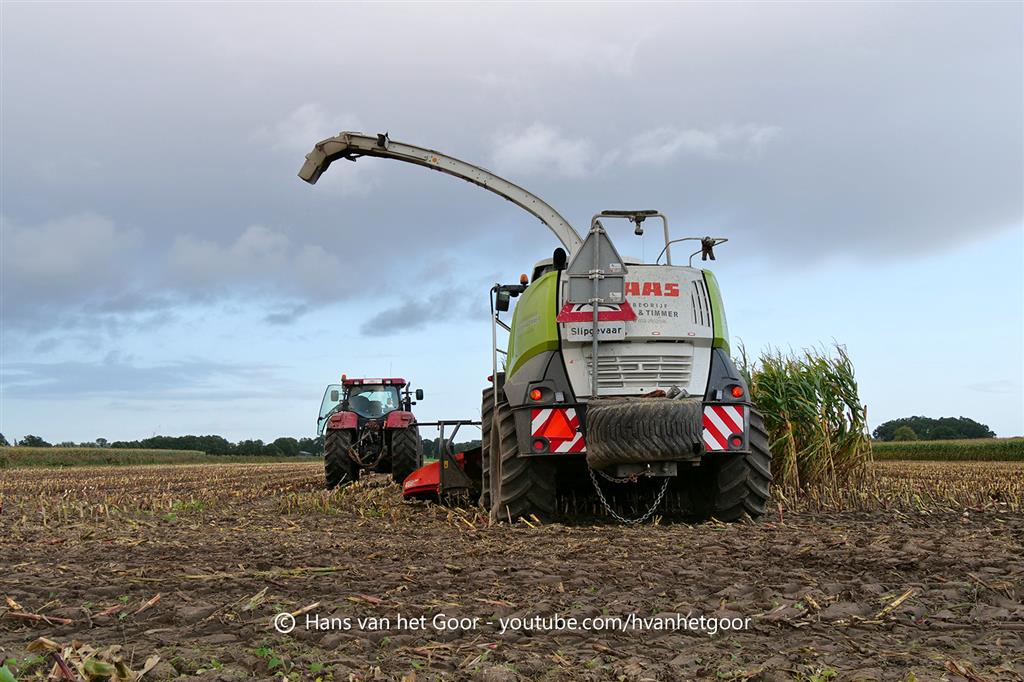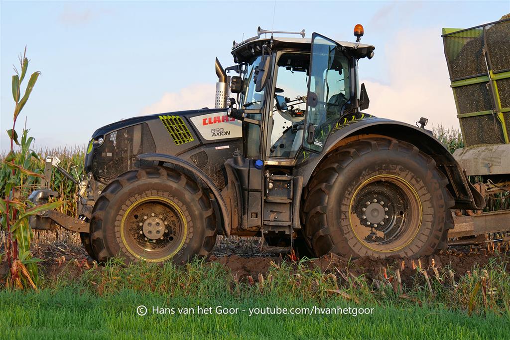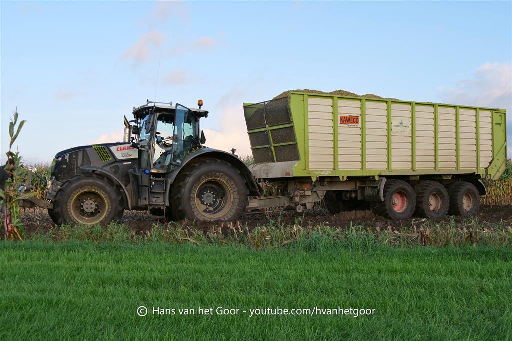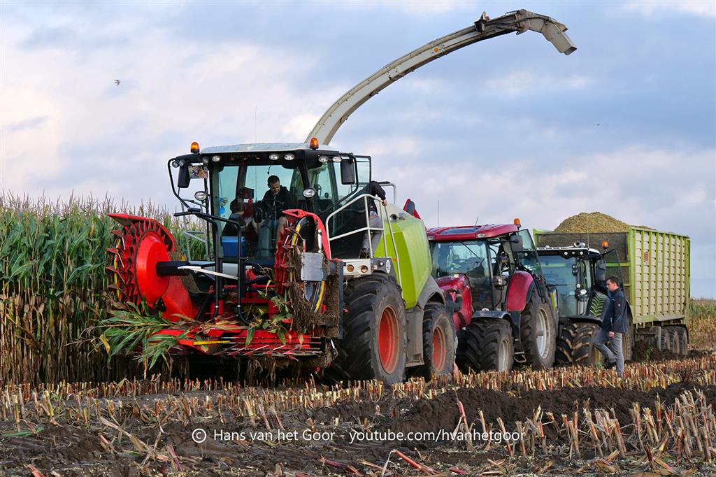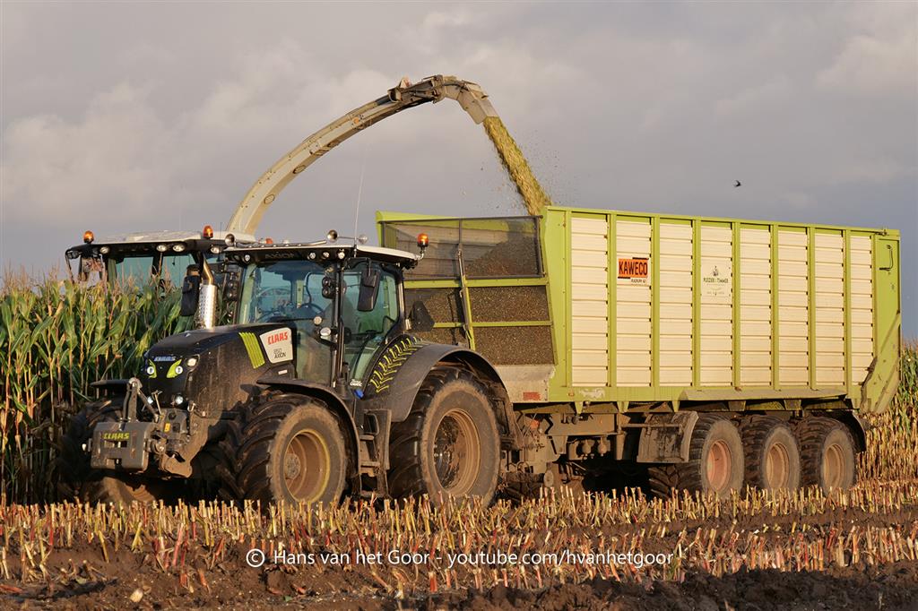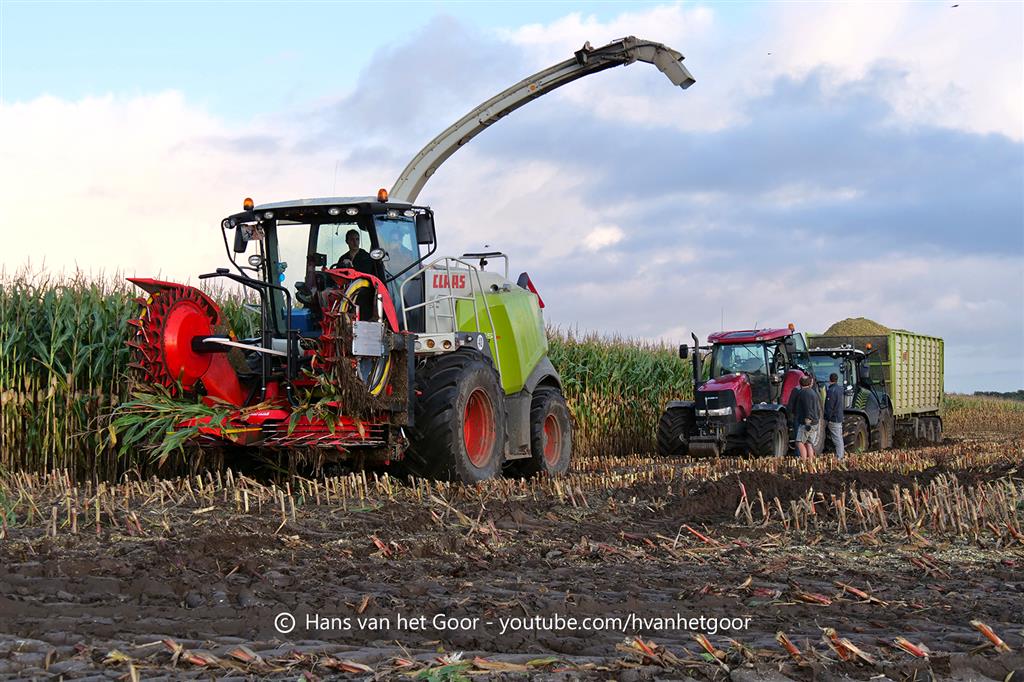 Na meer dan 60 mm regen in 24 uur, is het toch weer modderen in de mais bij Hoge Enk in de buurt van Elburg. We zien loonbedrijf Pleizier & Timmer met een Claas Jaguar 960/965 aan het worstelen tegen de elementen. De mais gaat naar een melkveebedrijf van Jan Bakker in Flevoland. Het transport wordt gedaan met diverse Claas Axion- en Case-trekkers, waaronder de mooie zwarte Claas Axion 850 Black Edition.