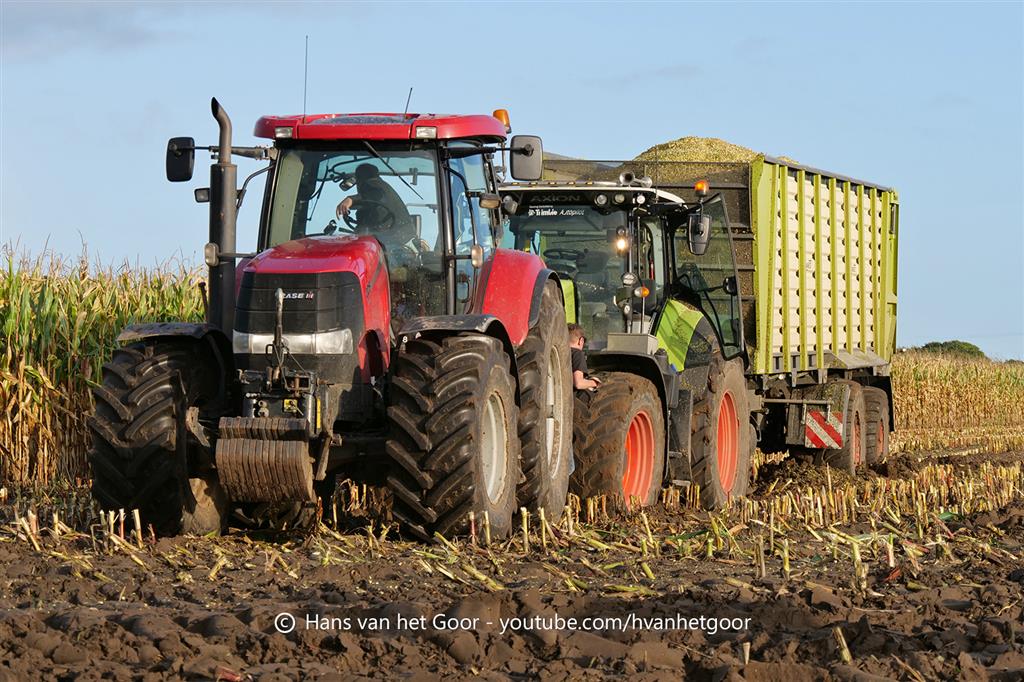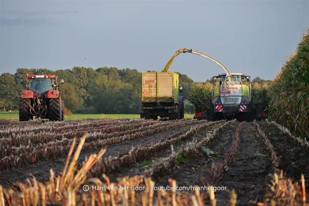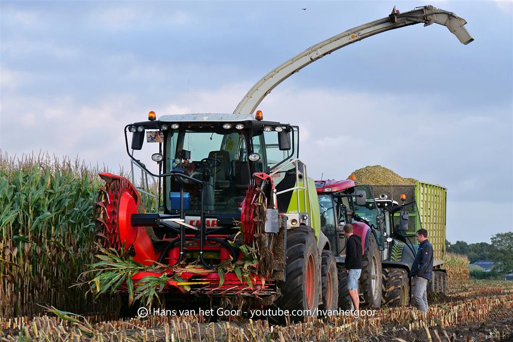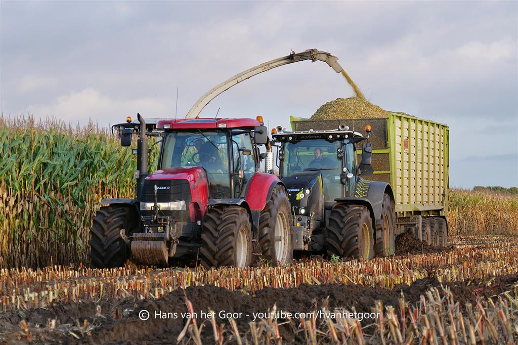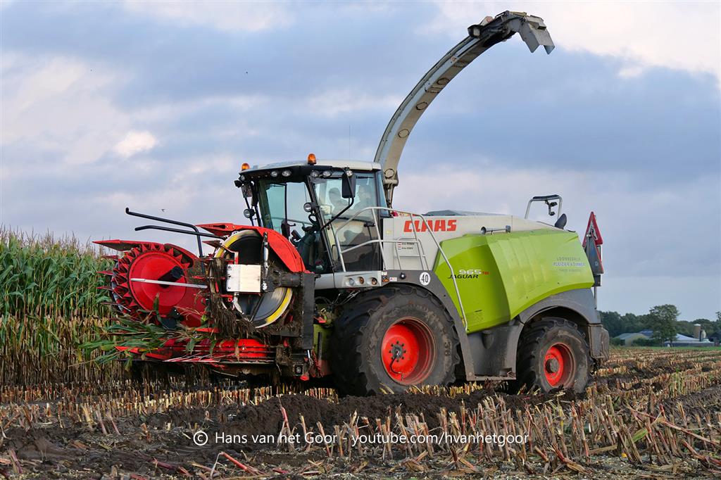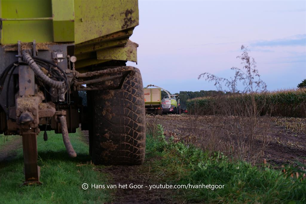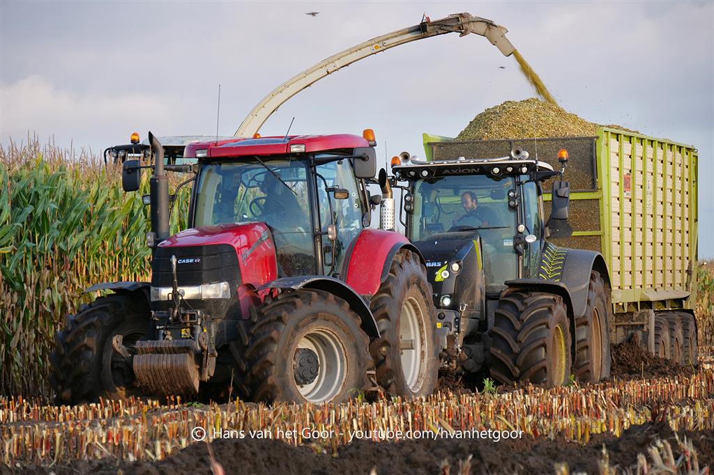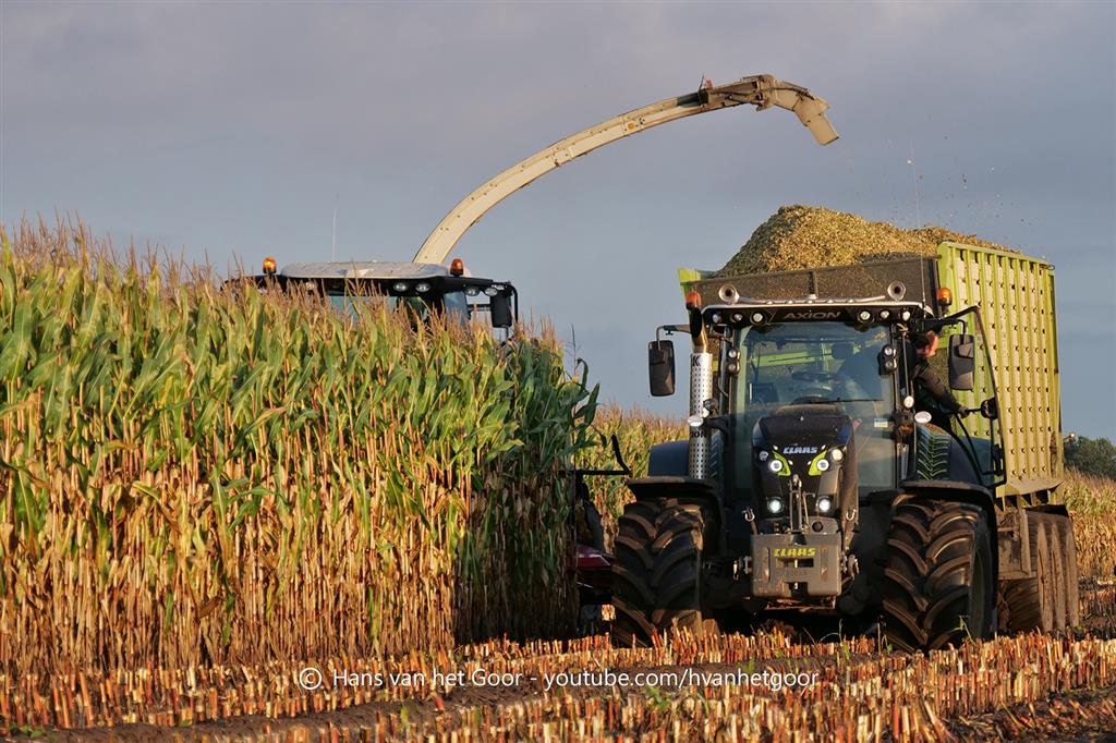 Na meer dan 60 mm regen in 24 uur, is het toch weer modderen in de mais bij Hoge Enk in de buurt van Elburg. We zien loonbedrijf Pleizier & Timmer met een Claas Jaguar 960/965 aan het worstelen tegen de elementen. De mais gaat naar een melkveebedrijf van Jan Bakker in Flevoland. Het transport wordt gedaan met diverse Claas Axion- en Case-trekkers, waaronder de mooie zwarte Claas Axion 850 Black Edition.