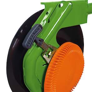 Met de nieuwe RoTeC Control zaaischijf wordt de zeer gelijkmatige en nauwkeurig gecontroleerde dieptegeleiding bereikt met de dieptegeleidingsrol Control 10 met een contactoppervlak van 10 mm breed of de dieptegeleidingsrol Control 25 met een contactoppervlak van 25 mm breed. Omdat de dieptegeleider bij Amazone direct aan de zijkant van het kouter wordt gemonteerd, werkt dit principe zeer betrouwbaar en nauwkeurig. Met de dieptegeleidingsschijven of -rollen kan de basisinstelling van de zaaidiepte snel, eenvoudig en comfortabel met zaaischijfdruk worden ingesteld. Indien nodig, kan deze zonder gereedschap middels een arretering op het kouter in drie standen aan wisselende bodemomstandigheden worden aangepast.