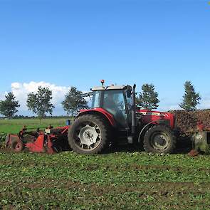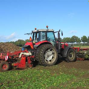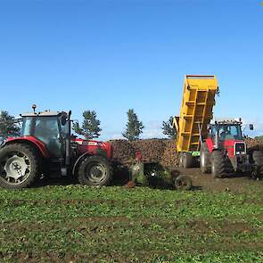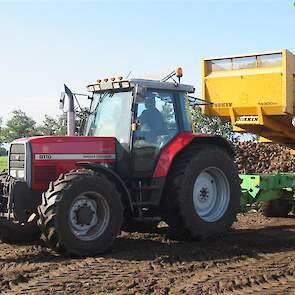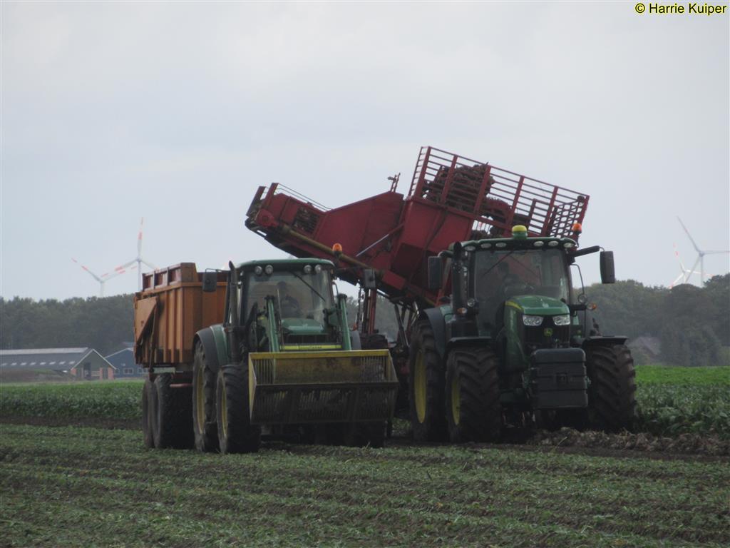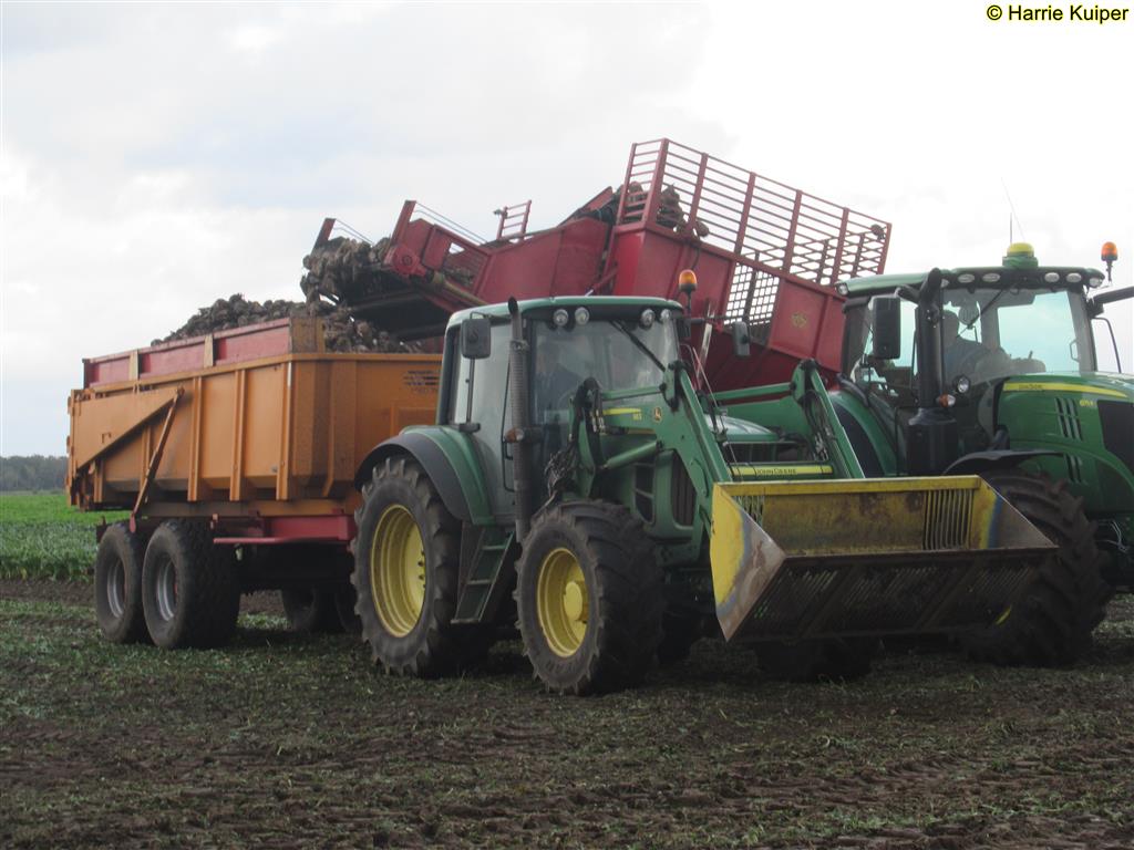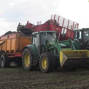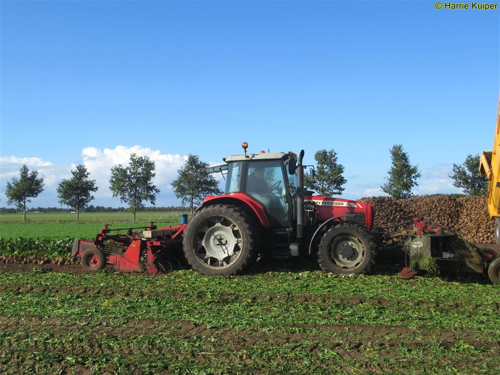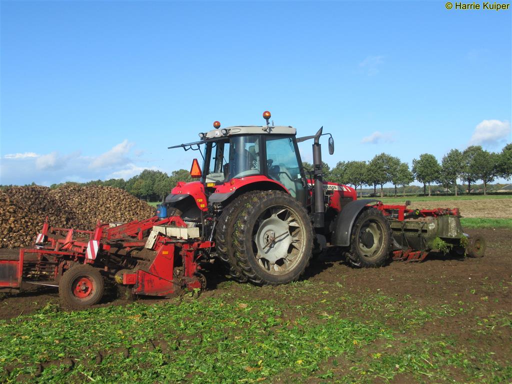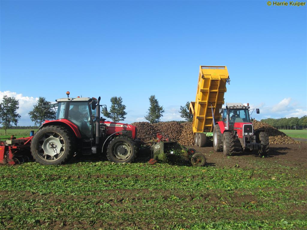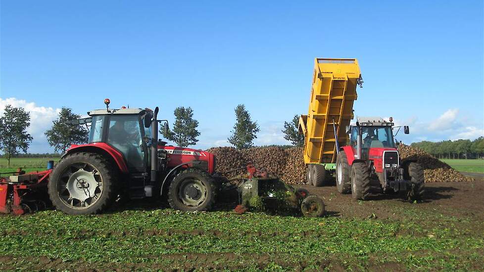 Massey Ferguson van Lammert Potze uit de Maten aan het bieten rooien achter Roswinkel. De lader met John Deere is van een collega-boer. Met bieten rooien werken ze altijd samen.