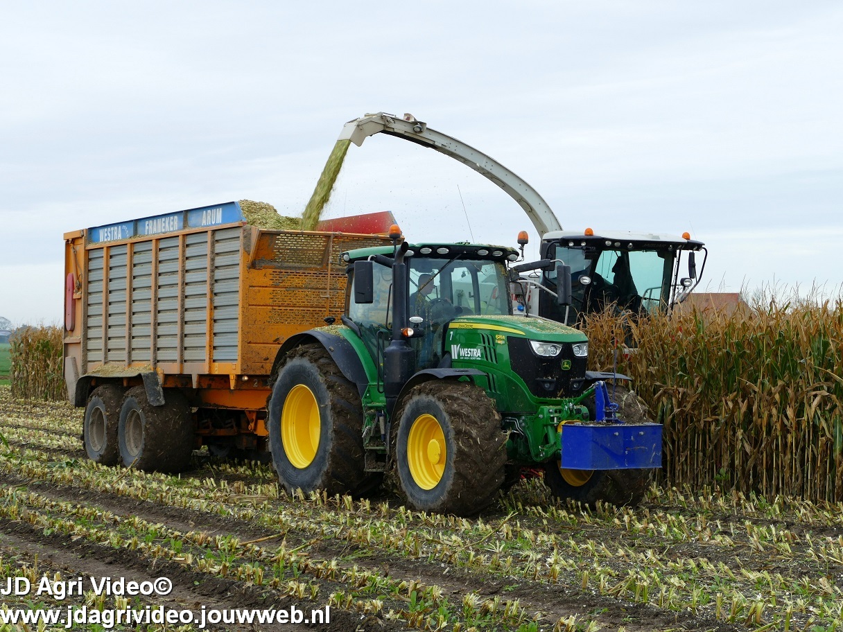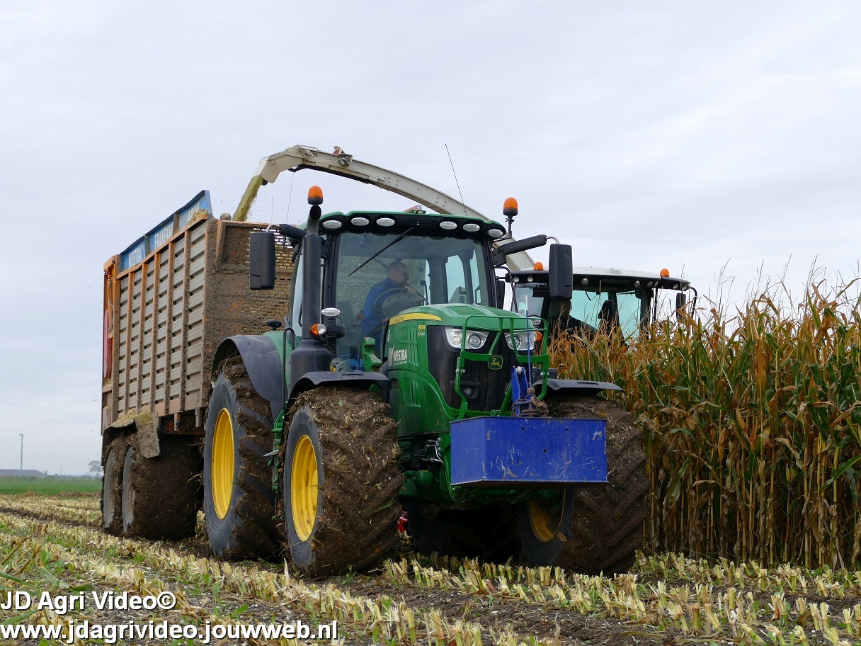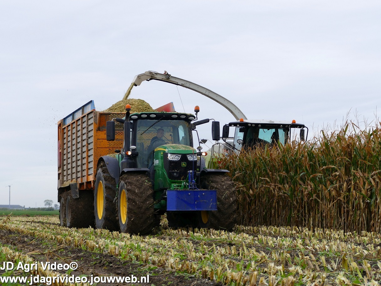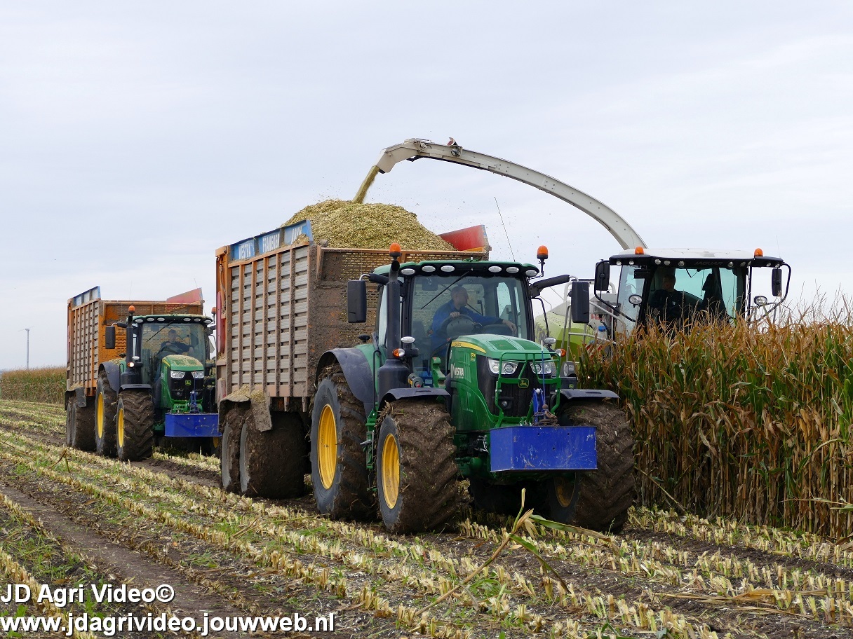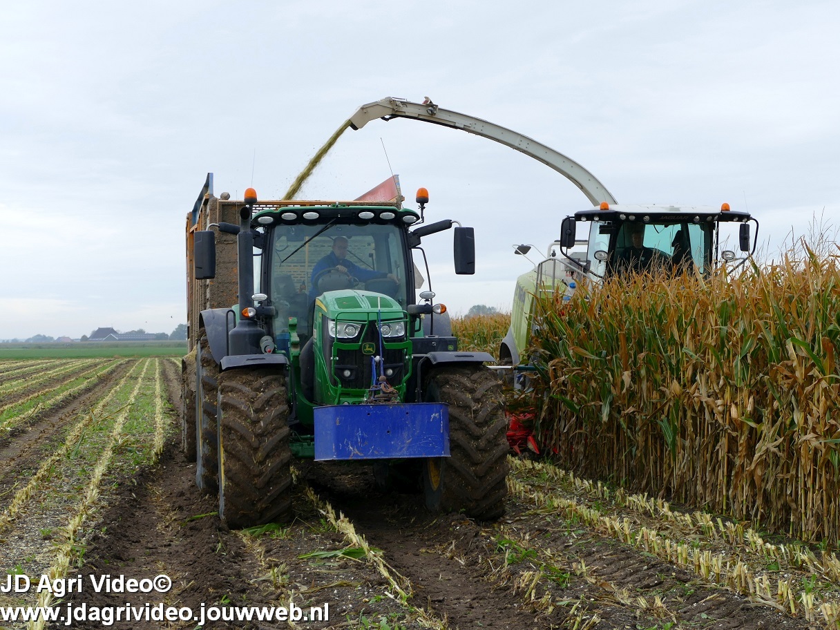 Mais hakselen in Tzum (FR) met een Claas Jaguar 930 en twee maal John Deere 6215R met Veenhuis Super Silagewagen. Op de kuil twee maal Volvo L70H.