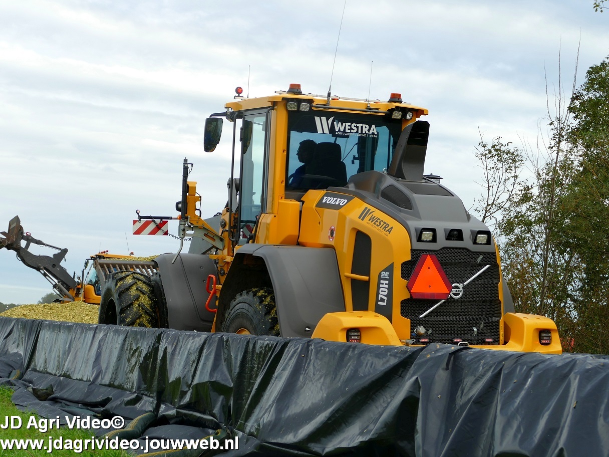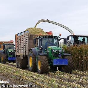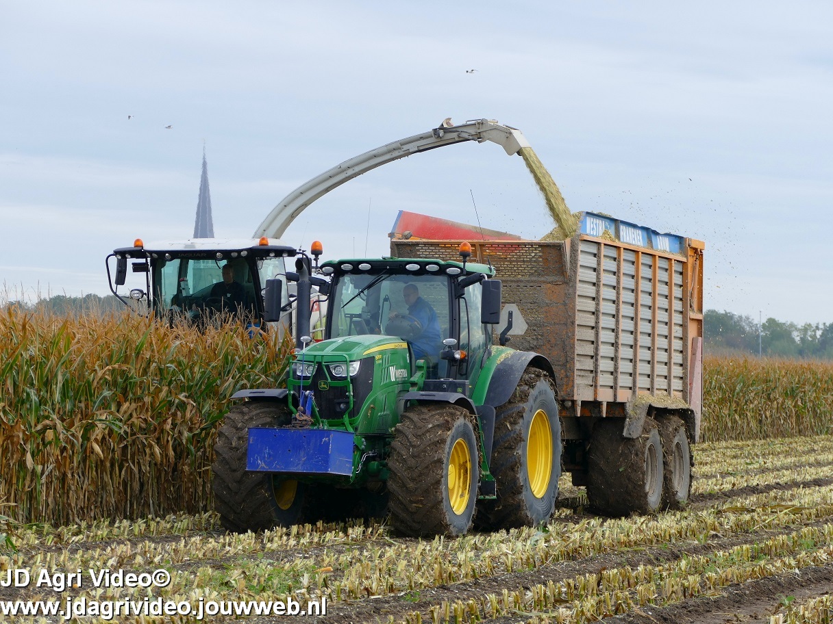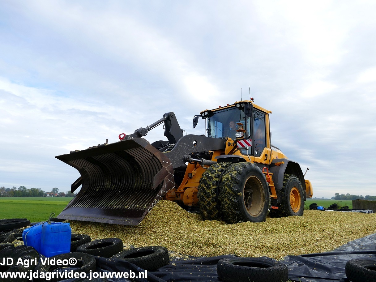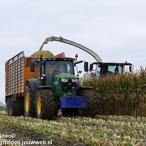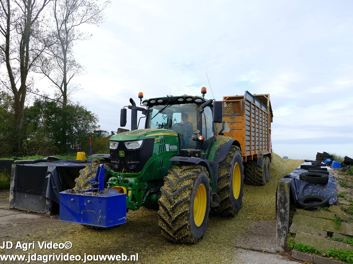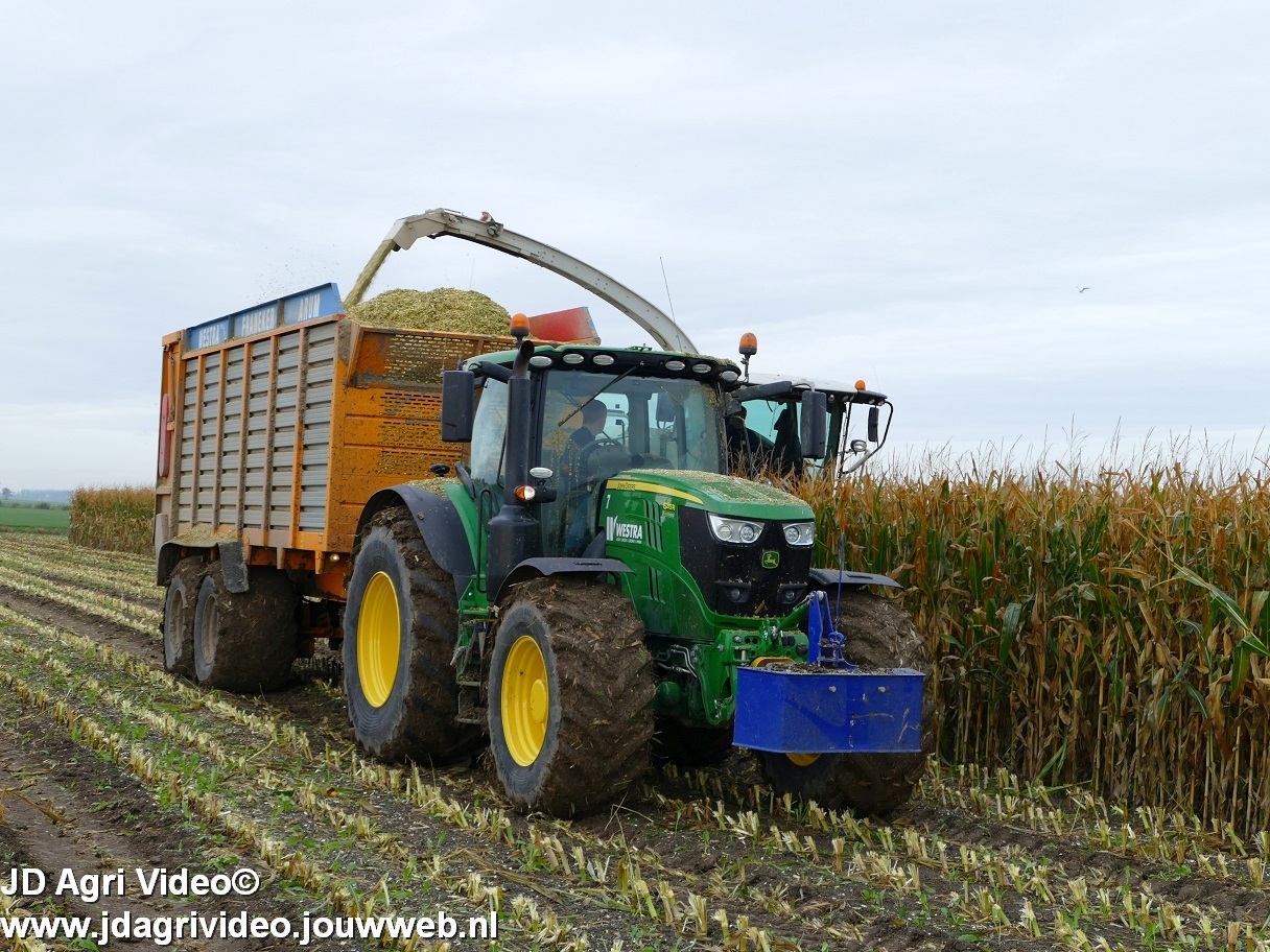 Mais hakselen in Tzum (FR) met een Claas Jaguar 930 en twee maal John Deere 6215R met Veenhuis Super Silagewagen. Op de kuil twee maal Volvo L70H.