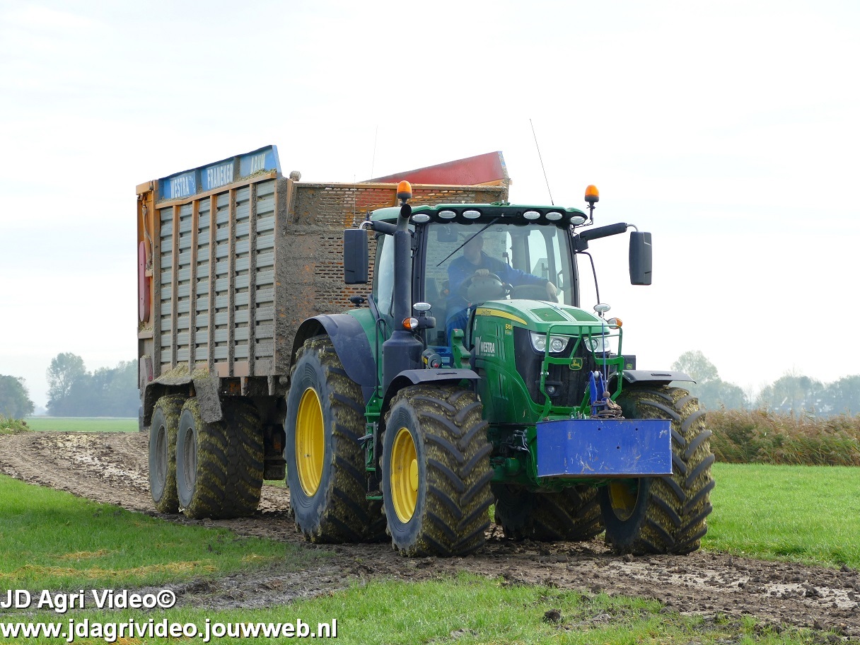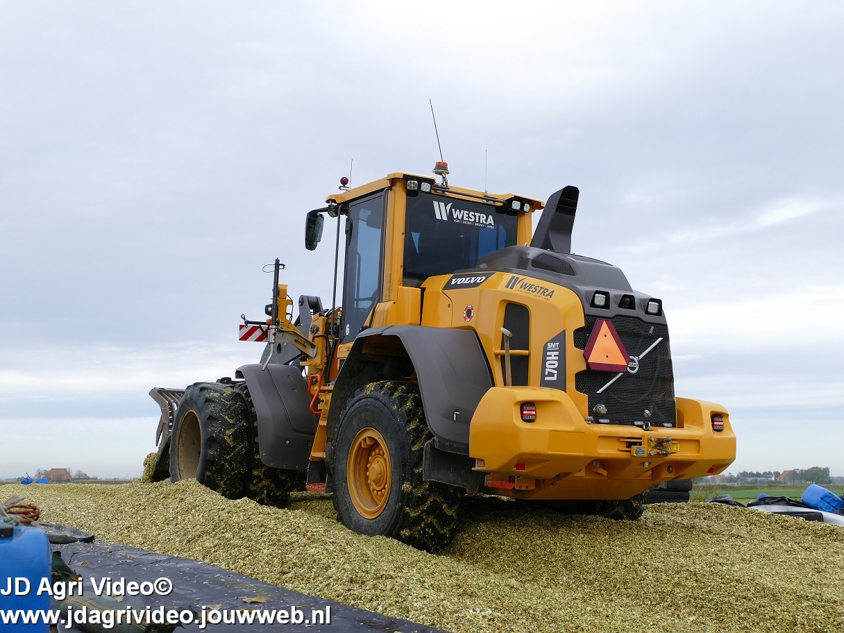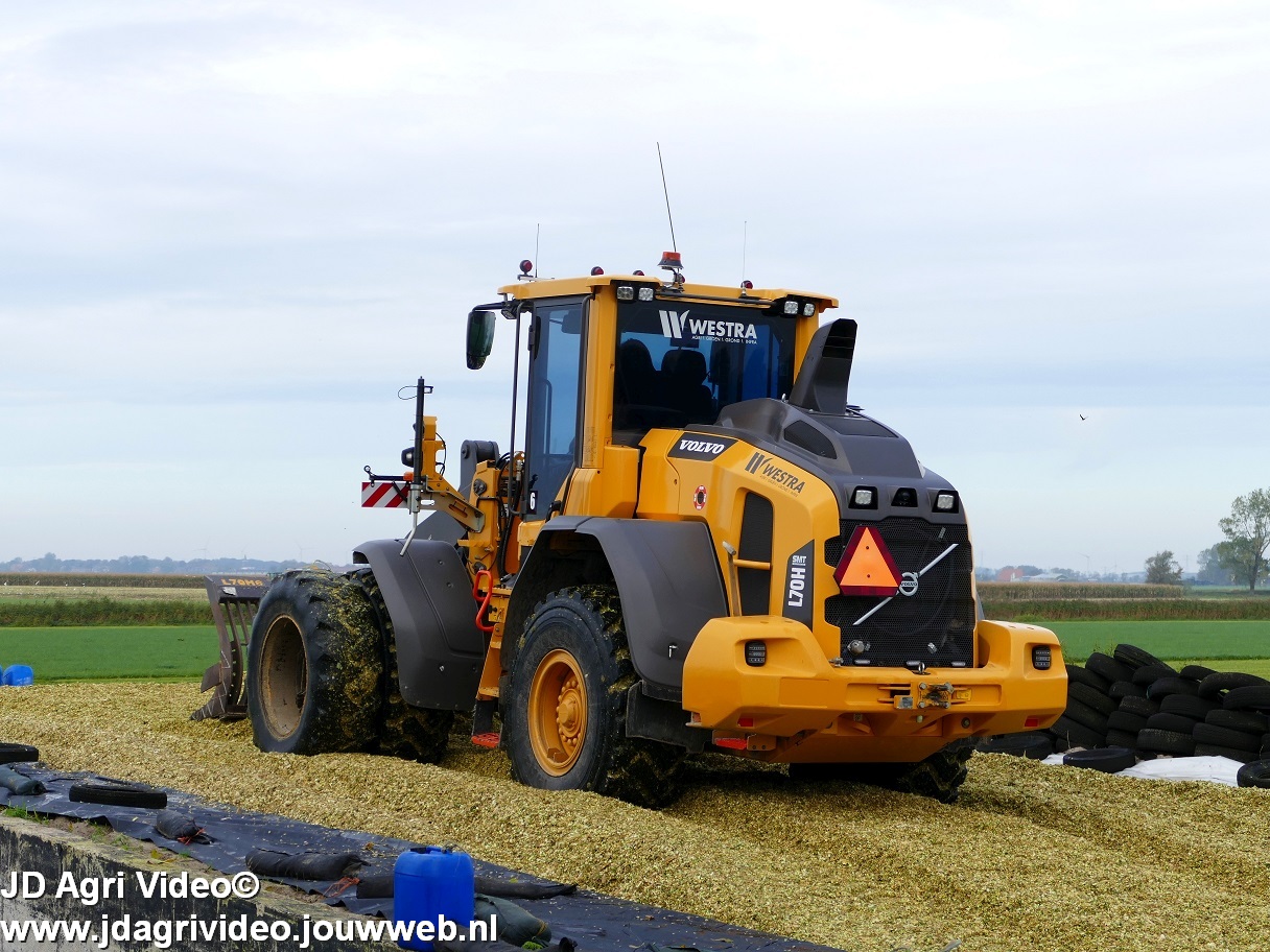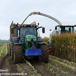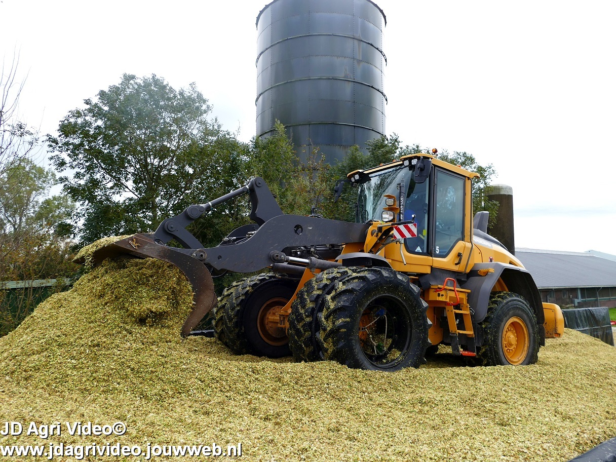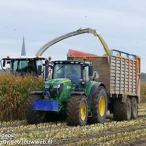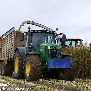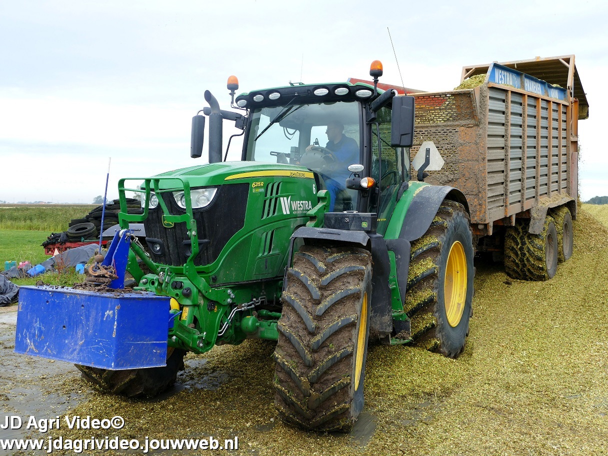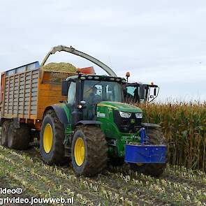 Mais hakselen in Tzum (FR) met een Claas Jaguar 930 en twee maal John Deere 6215R met Veenhuis Super Silagewagen. Op de kuil twee maal Volvo L70H.