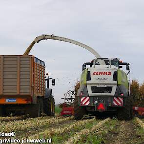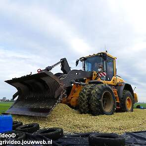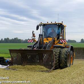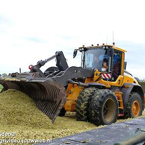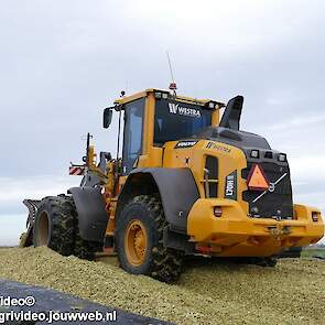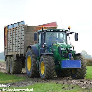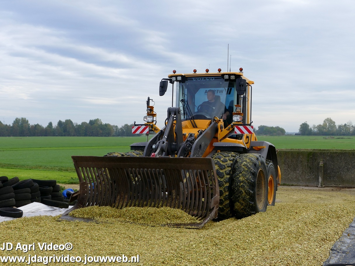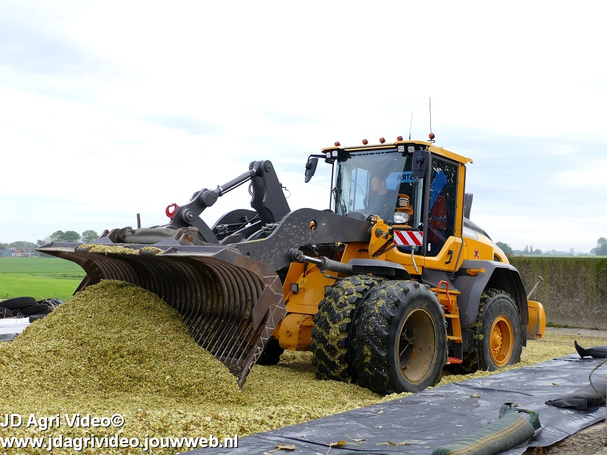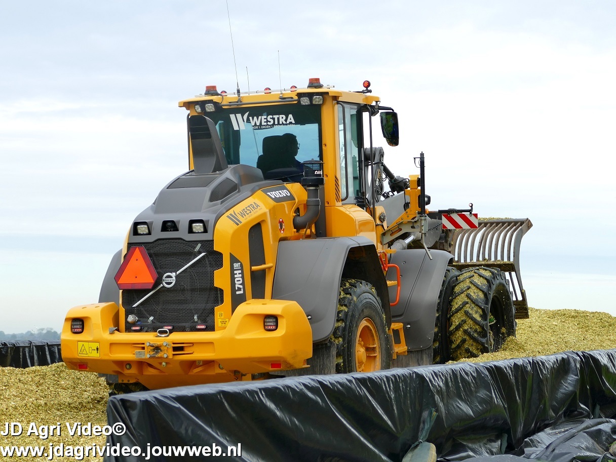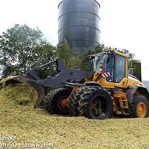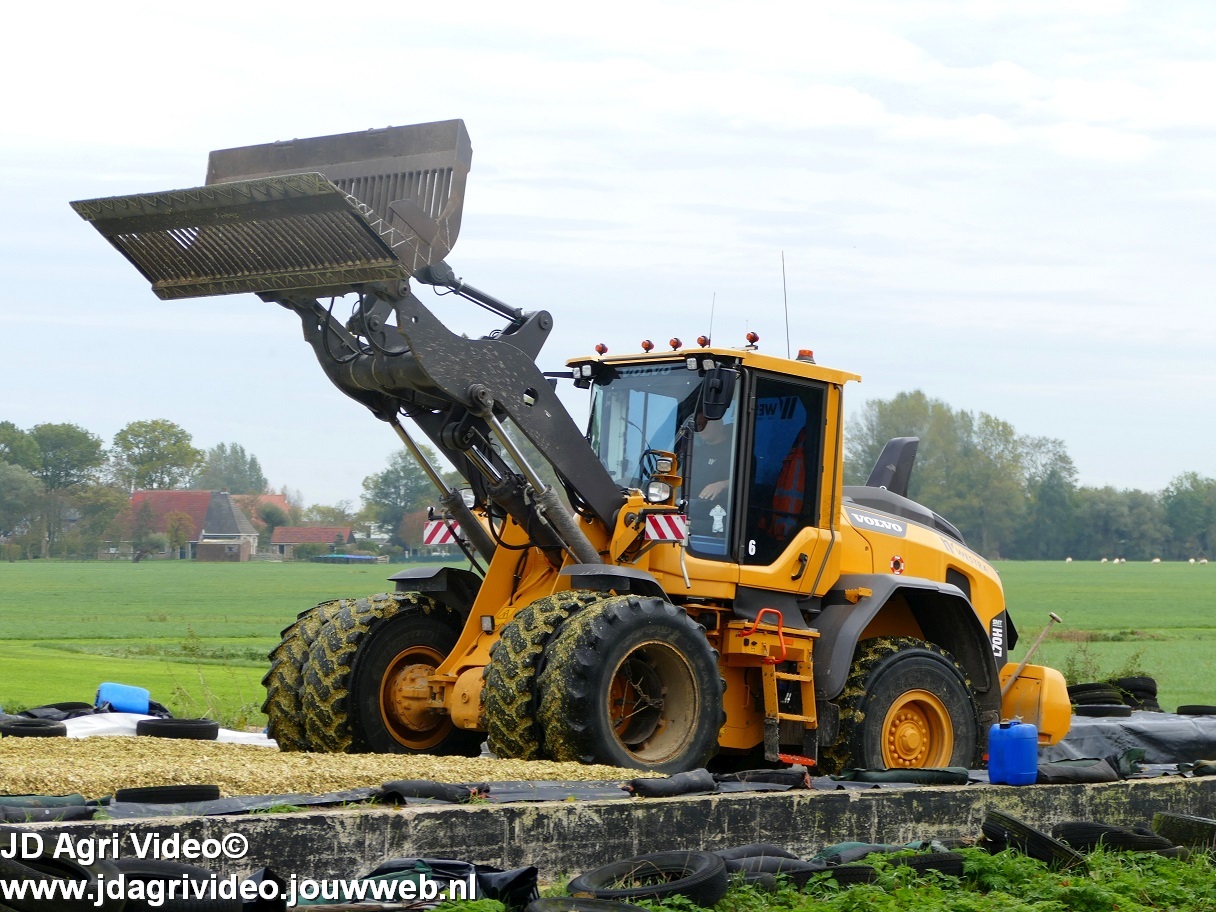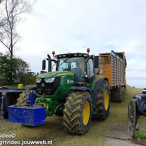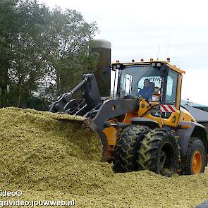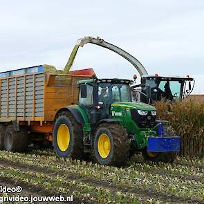 Mais hakselen in Tzum (FR) met een Claas Jaguar 930 en twee maal John Deere 6215R met Veenhuis Super Silagewagen. Op de kuil twee maal Volvo L70H.