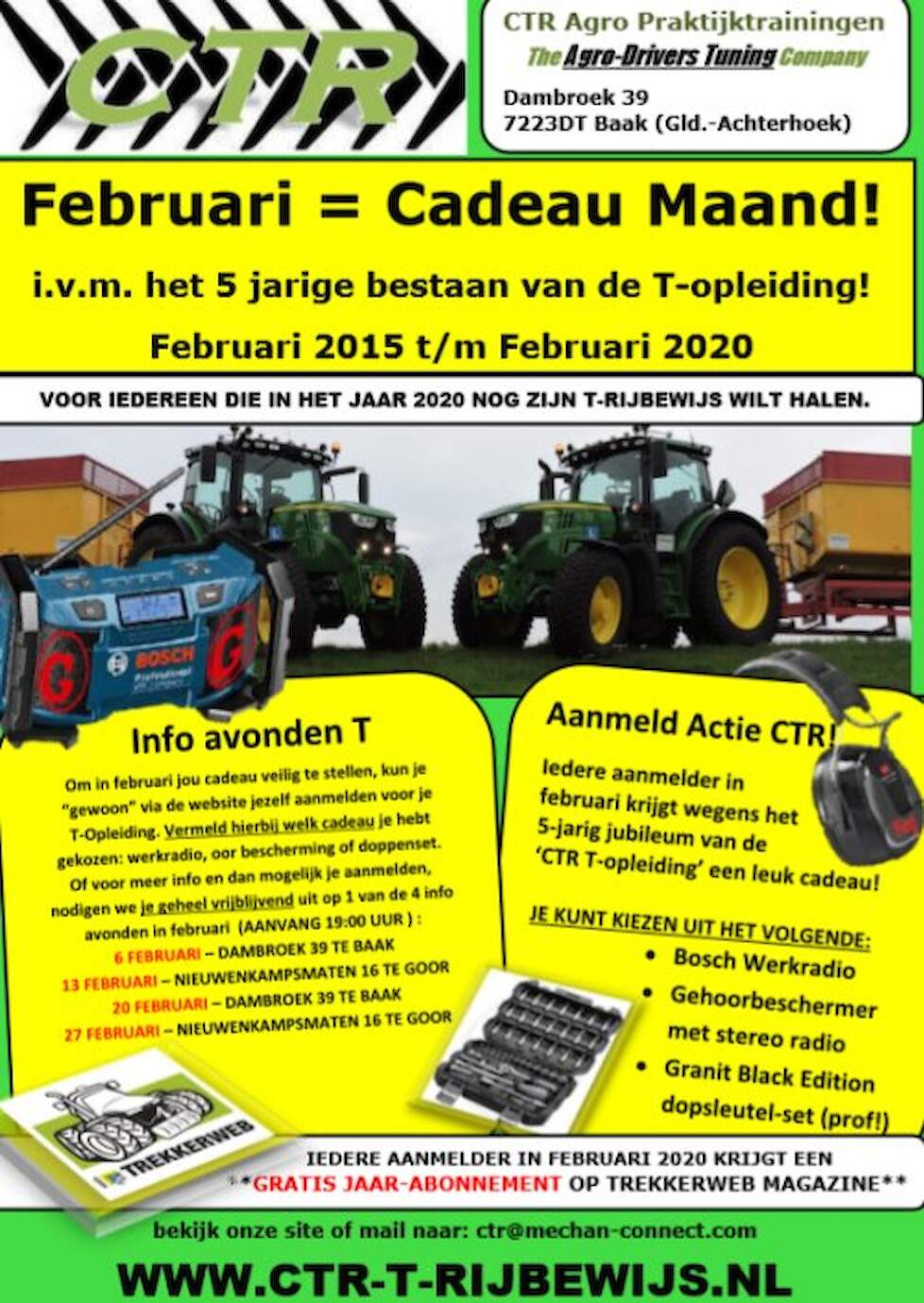 Om dit 5-jarig jubileum te vieren hebben we hier op Trekkerweb een klein foto-overzicht van 5 jaar CTR. En om dit samen met de huidige en nieuwe leerlingen te vieren, biedt het CTR in februari een keuze van mooie en nuttige cadeaus. Alle huidige leerlingen en de nieuwe leerlingen die zich in de 'cadeaumaand' februari aanmelden voor de T-opleiding krijgen een gratis jaarabonnement op Trekkerweb magazinecadeau. Tevens kunnen de nieuwe aanmelders in februari nog kiezen uit een extra cadeau: een Granit Bosch werkradio, een Fliegl gehoorbeschermer met stereo radio of een Granit black edition dopsleutelset.Al deze cadeaus worden aangeboden door het moederbedrijf 'Mechan-Connect Group BV', dealer van o.a. Granit en Fliegl. Deze aanbieding geldt voor iedereen die in 2020 zijn T-Rijbewijs wil halen. Je bent er echt niet te vroeg bij, want de eerste aanmeldingen voor december 2020 zijn al binnen. Hoe eerder je erbij bent, hoe zekerder het is dat je in de week dat je 16 wordt je T-Rijbewijs kunt halen. Dus pak deze kans.