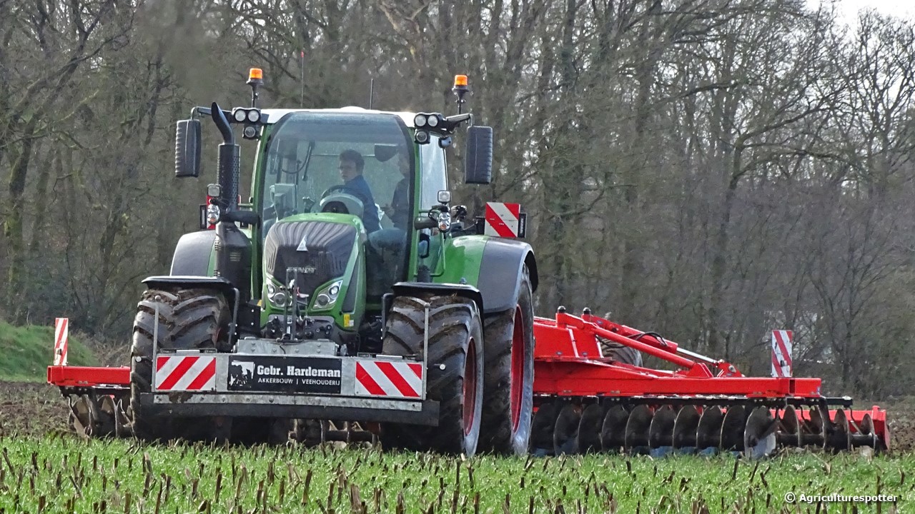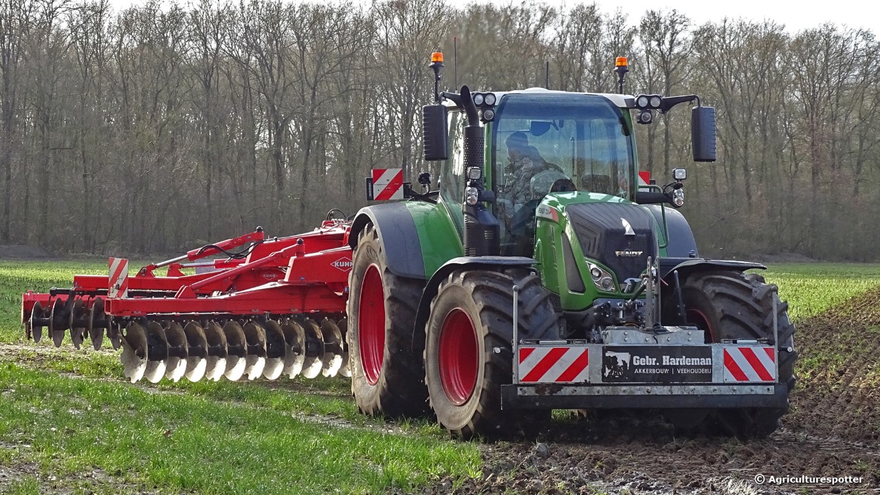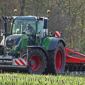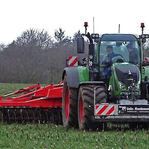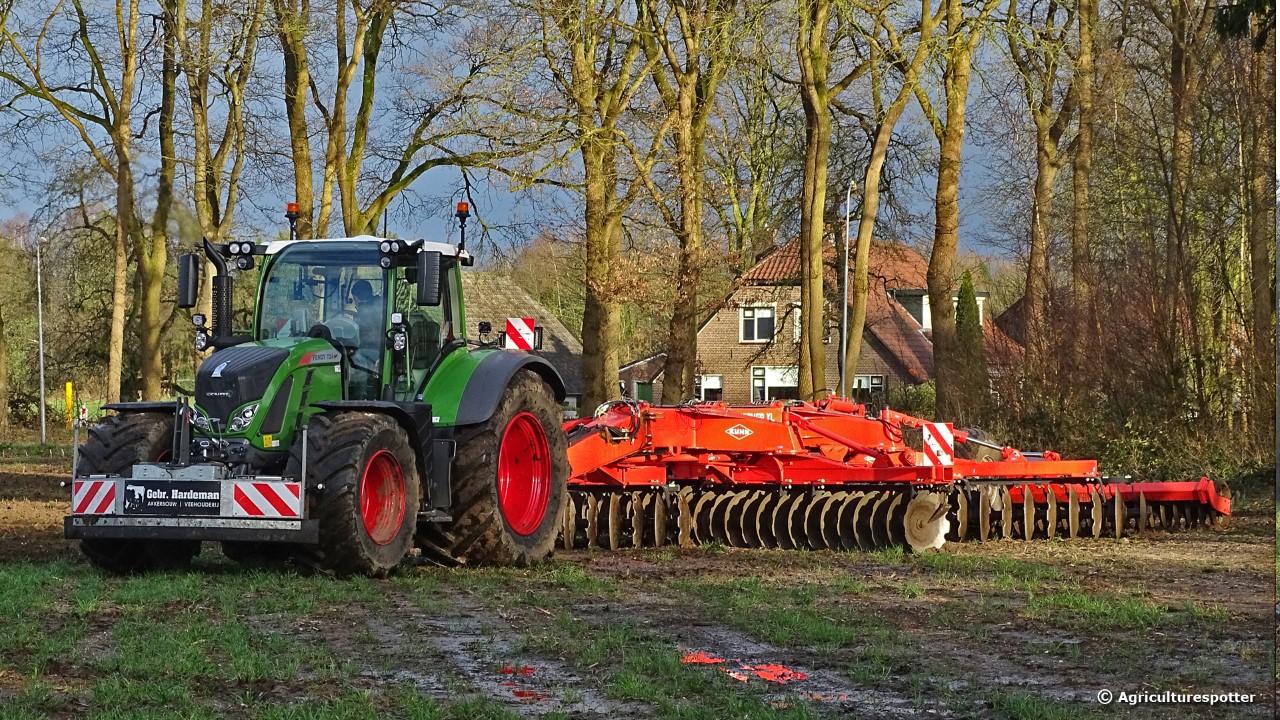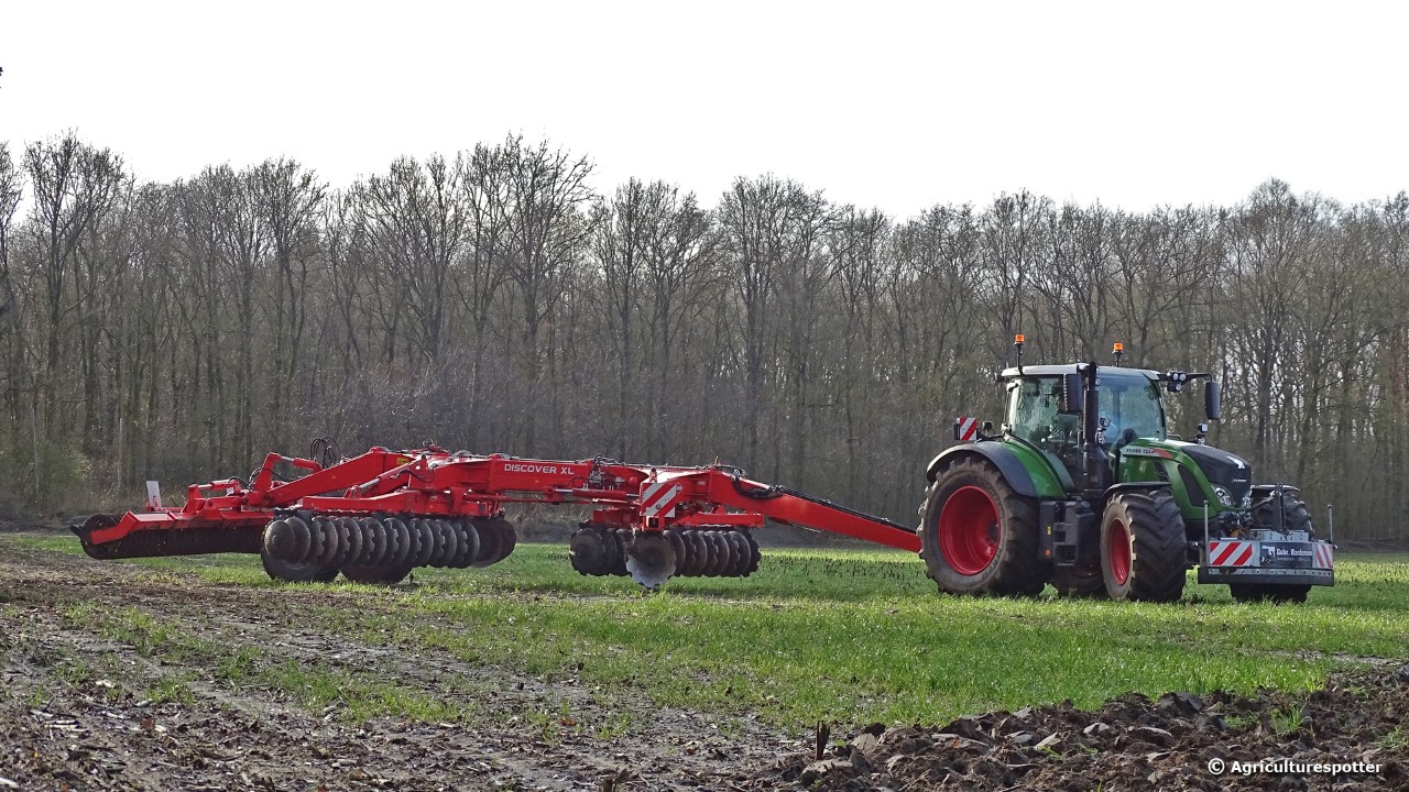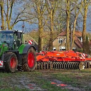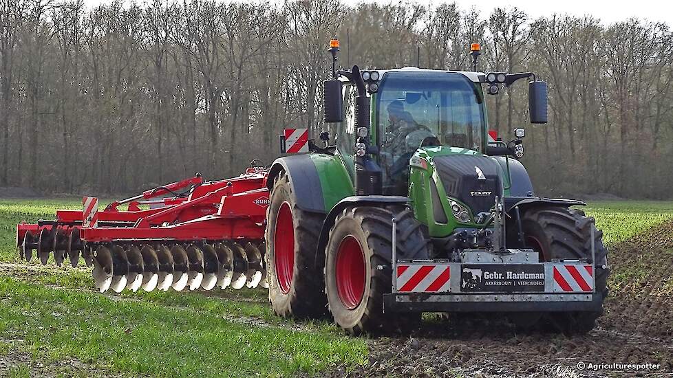 Gebr. Hardeman maisstoppelland aan het schijveneggen met een Fendt 724 Green Nature en Kuhn Discover XL.