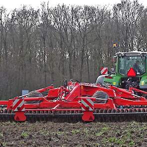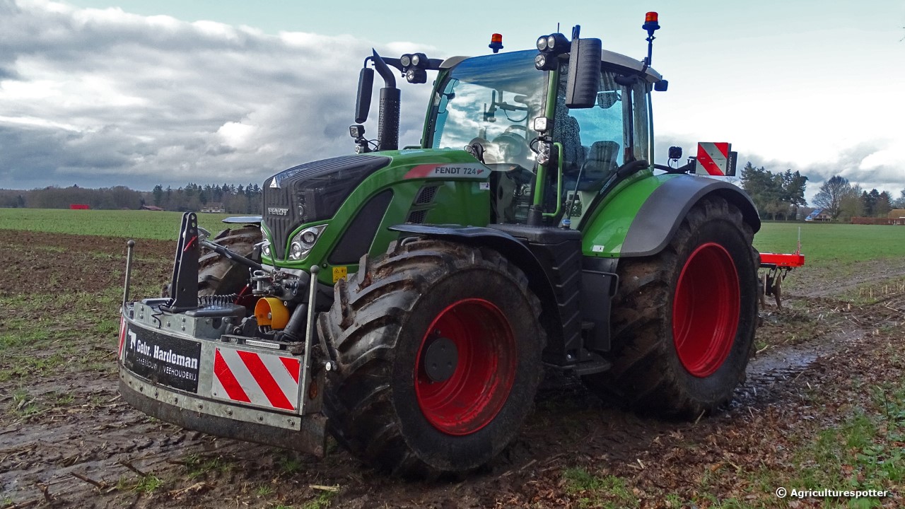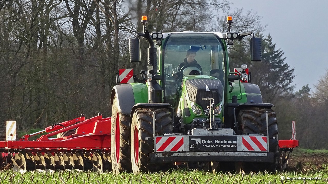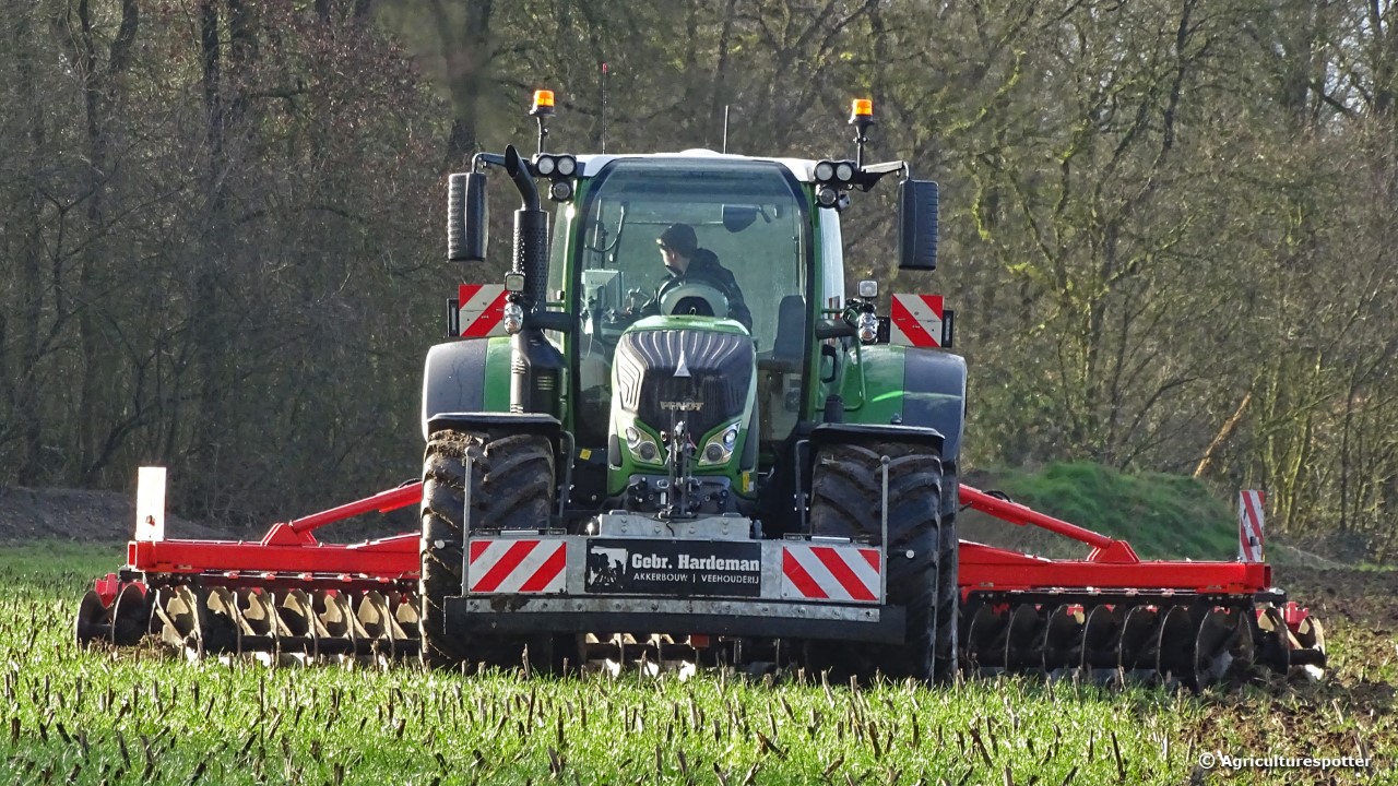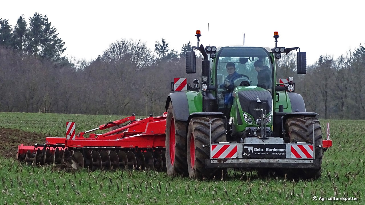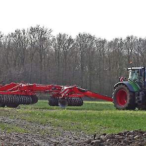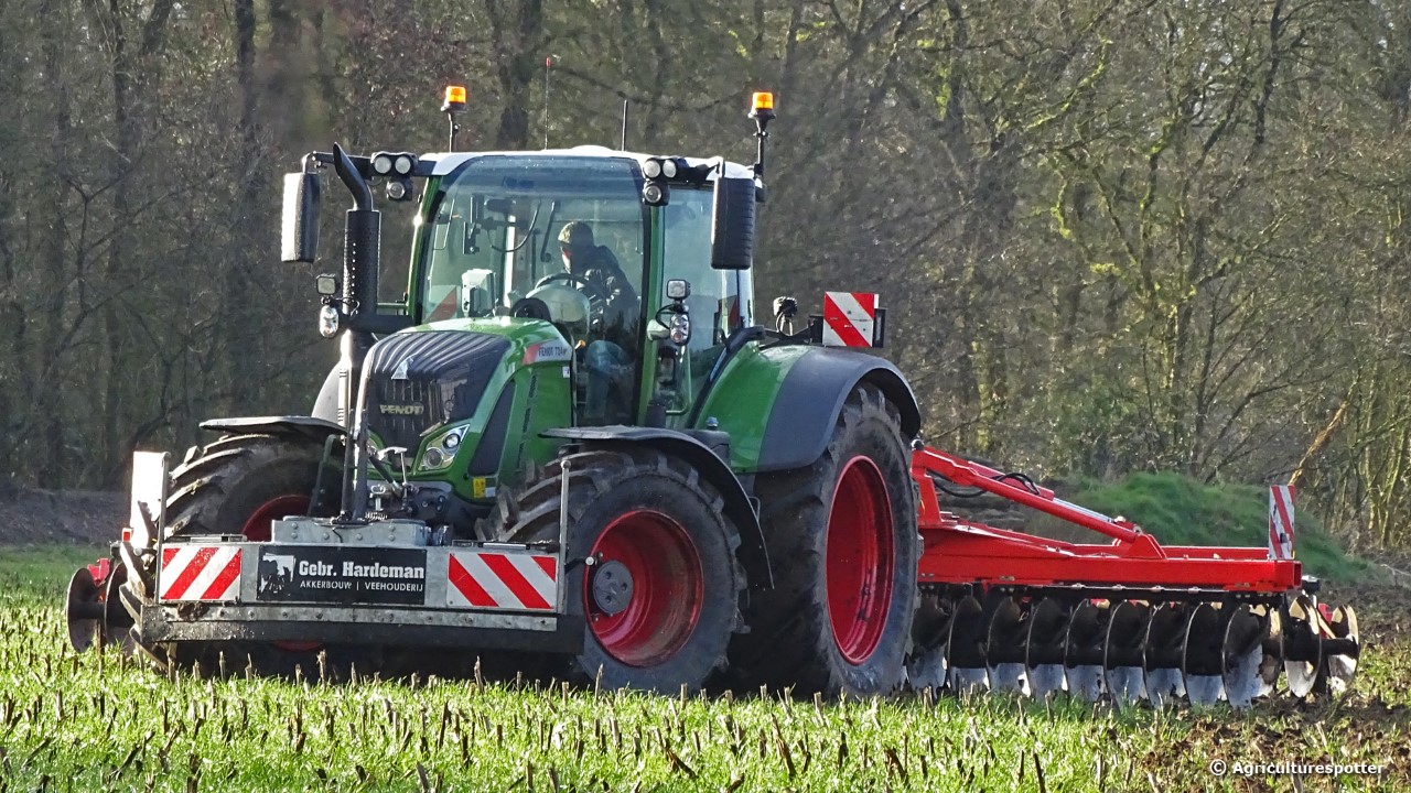 Gebr. Hardeman maisstoppelland aan het schijveneggen met een Fendt 724 Green Nature en Kuhn Discover XL.