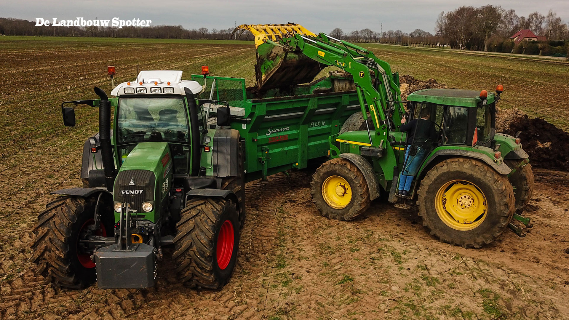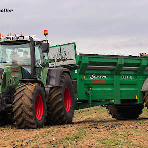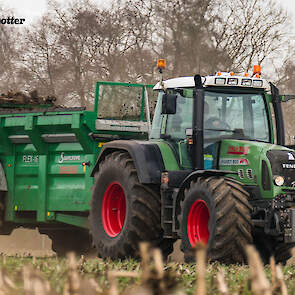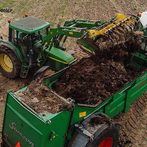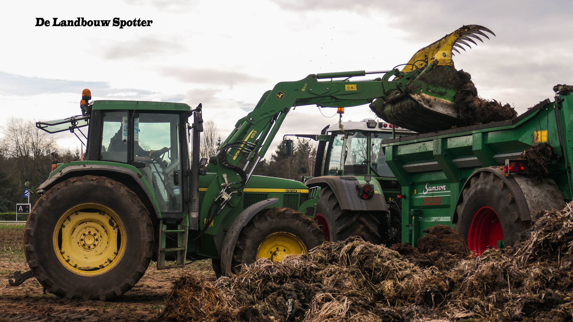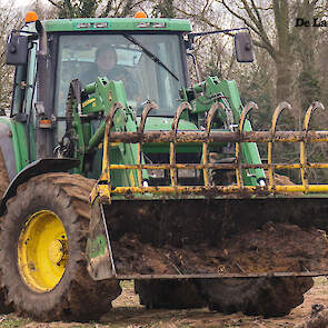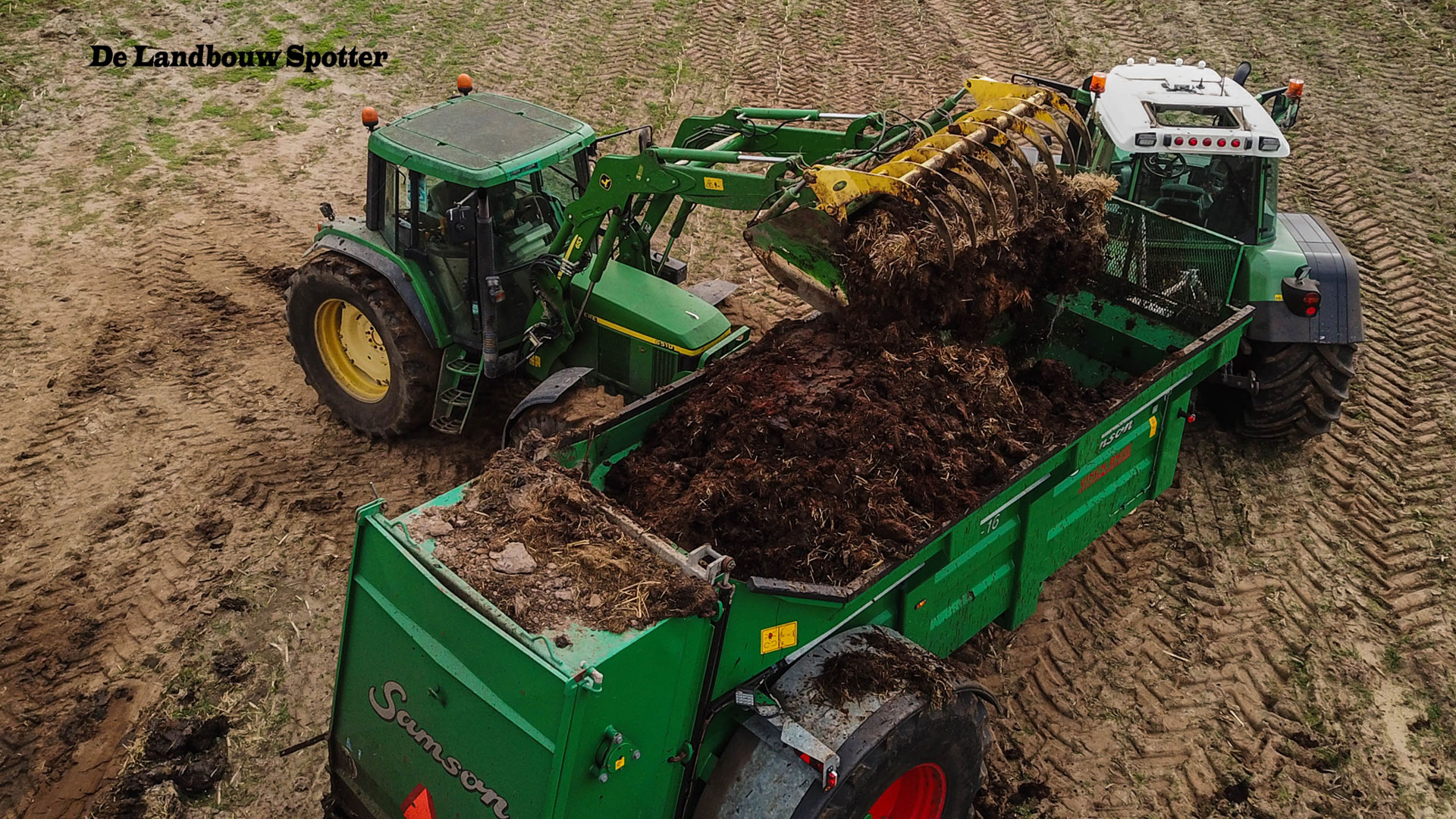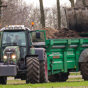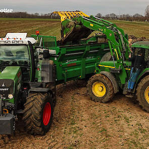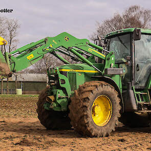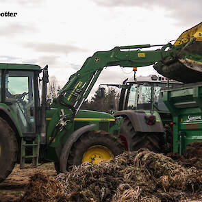 Een John Deere 6510 met voorlader vult de combinatie met de vaste mest.