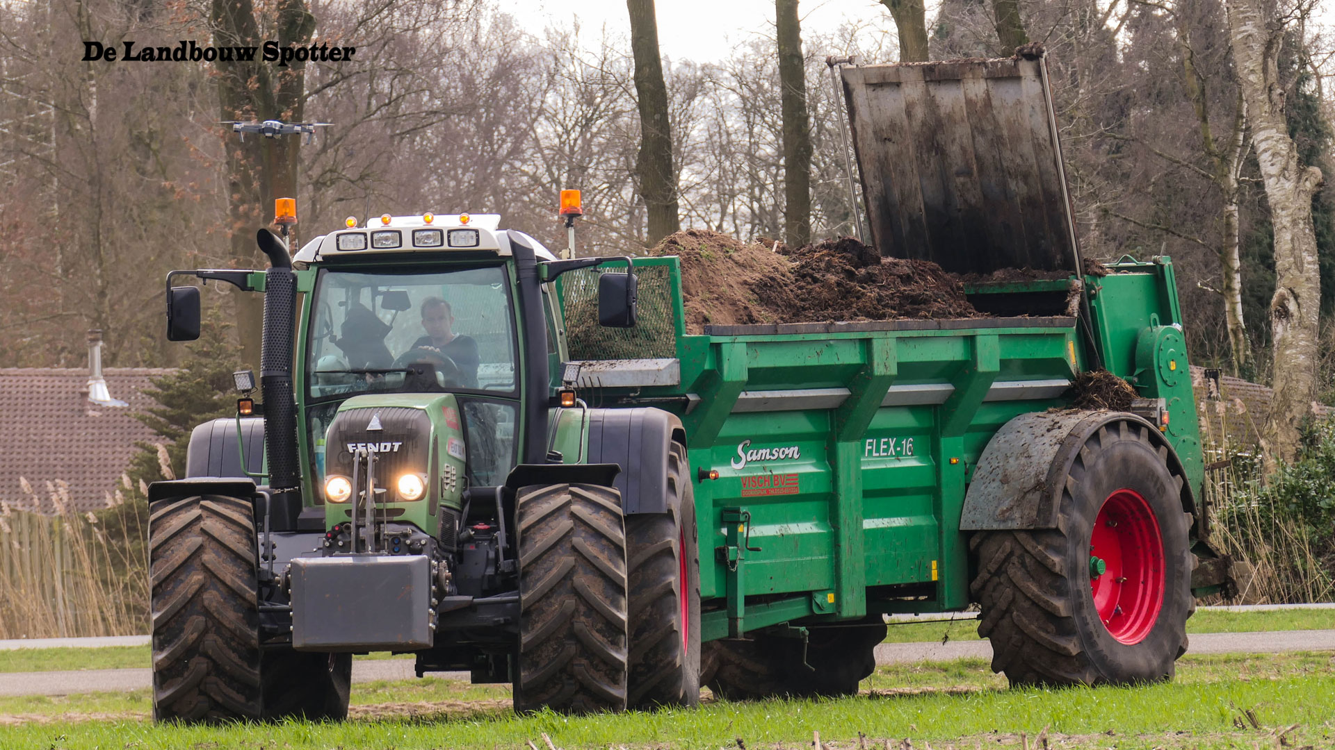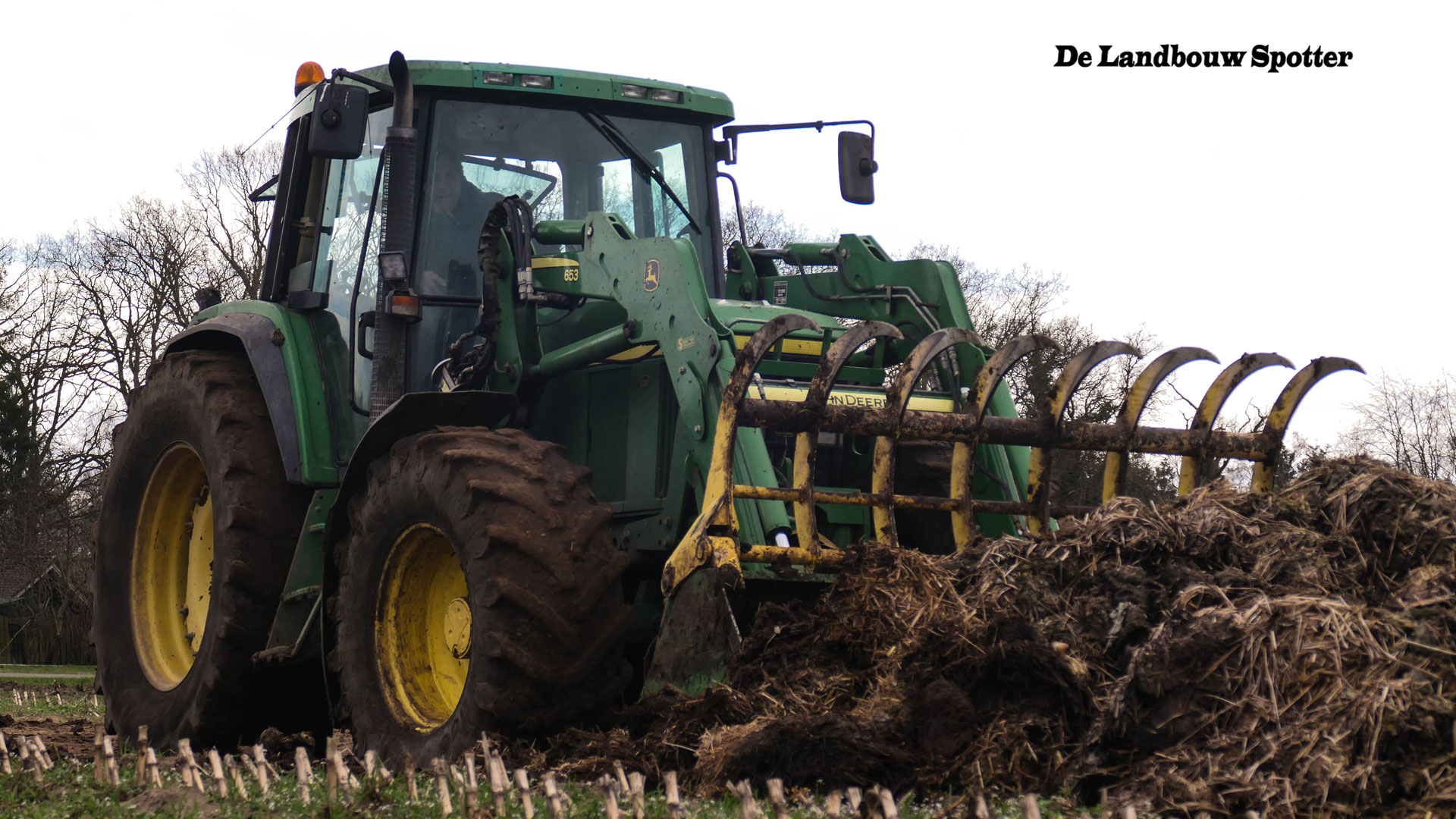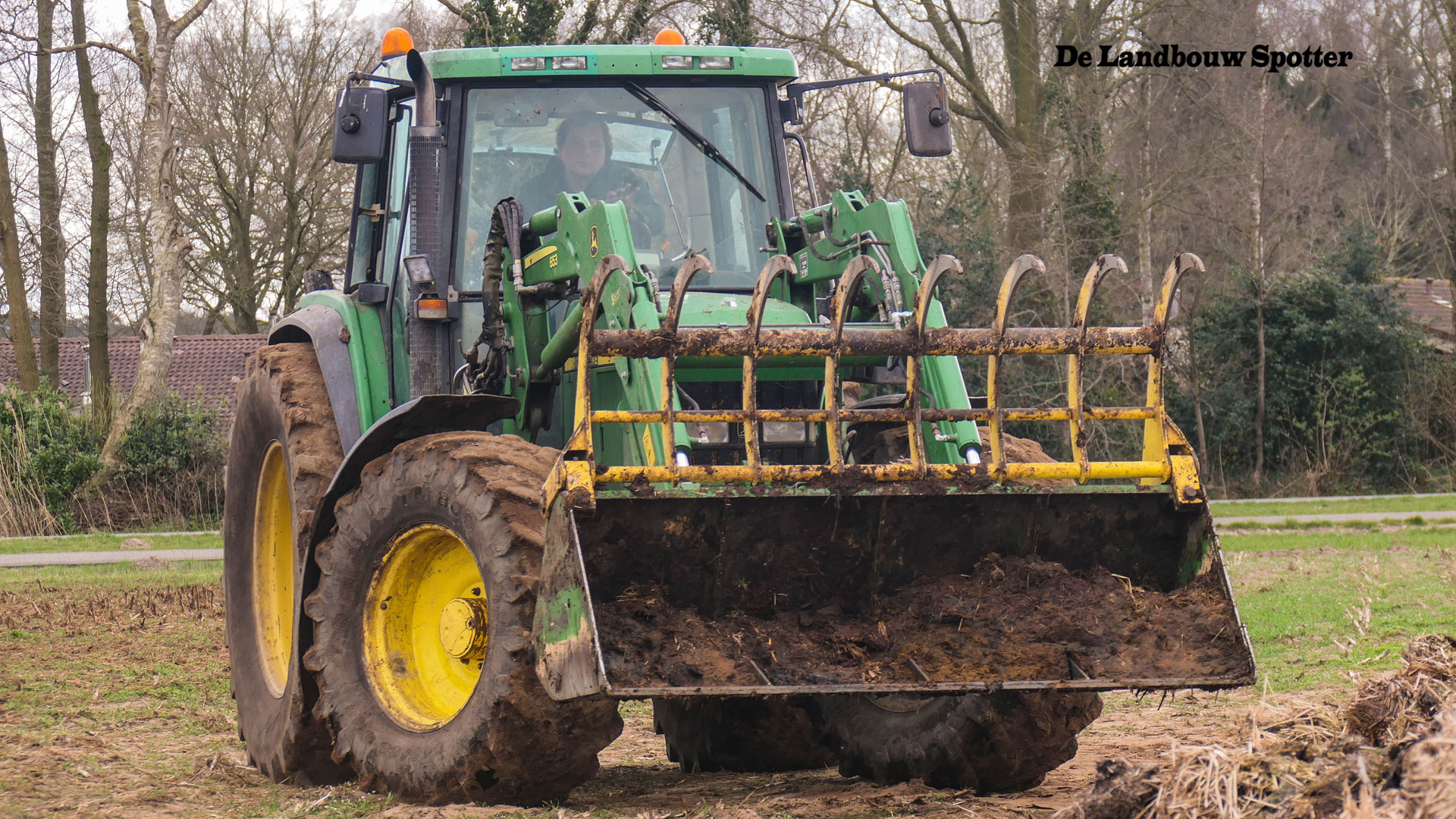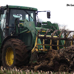 Een John Deere 6510 met voorlader vult de combinatie met de vaste mest.