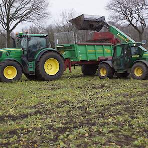 Een John Deere 3400-verreiker vult de Strautmann-wagen.
