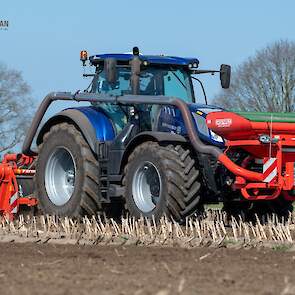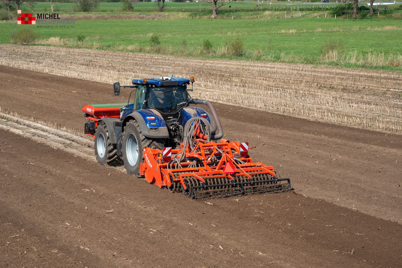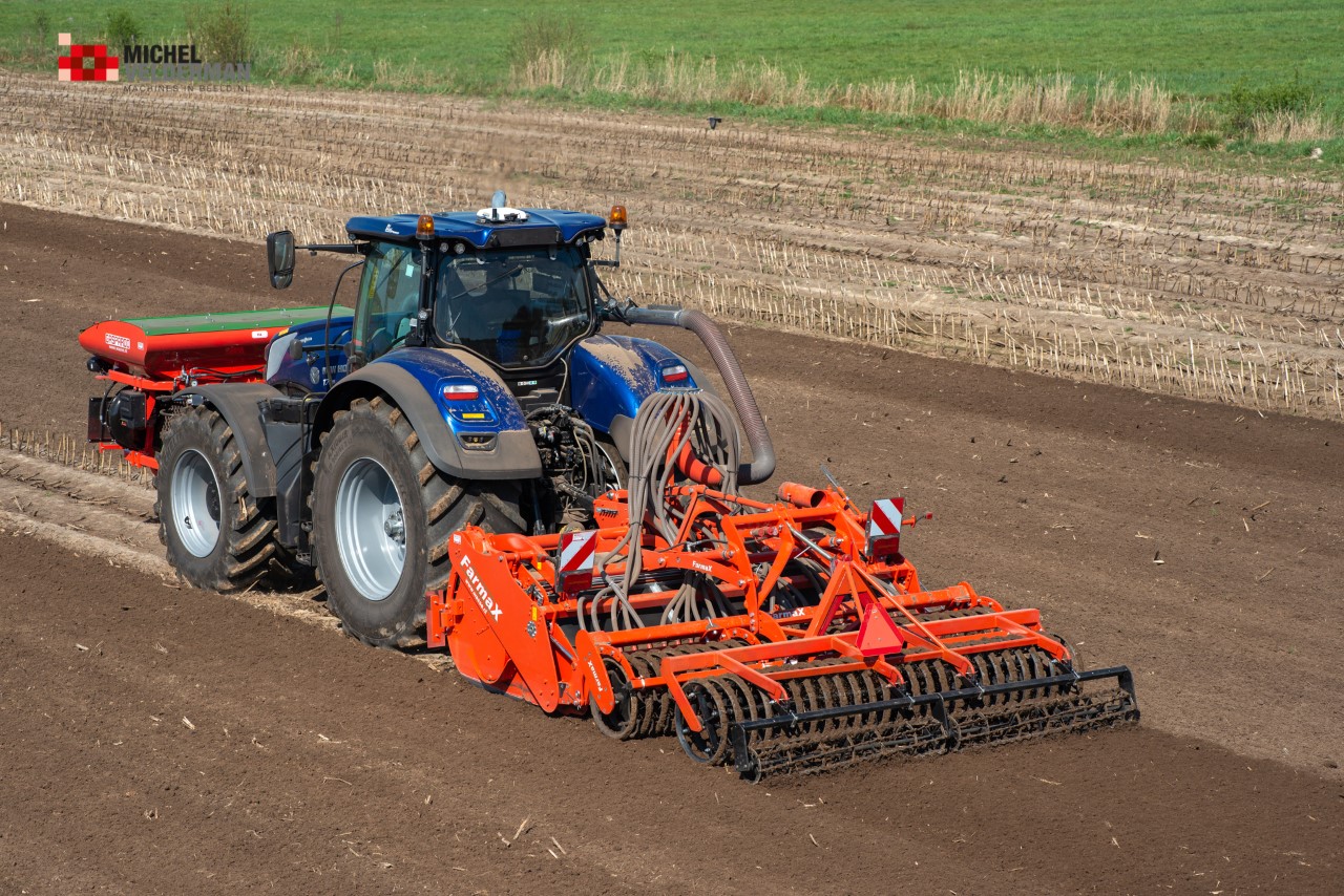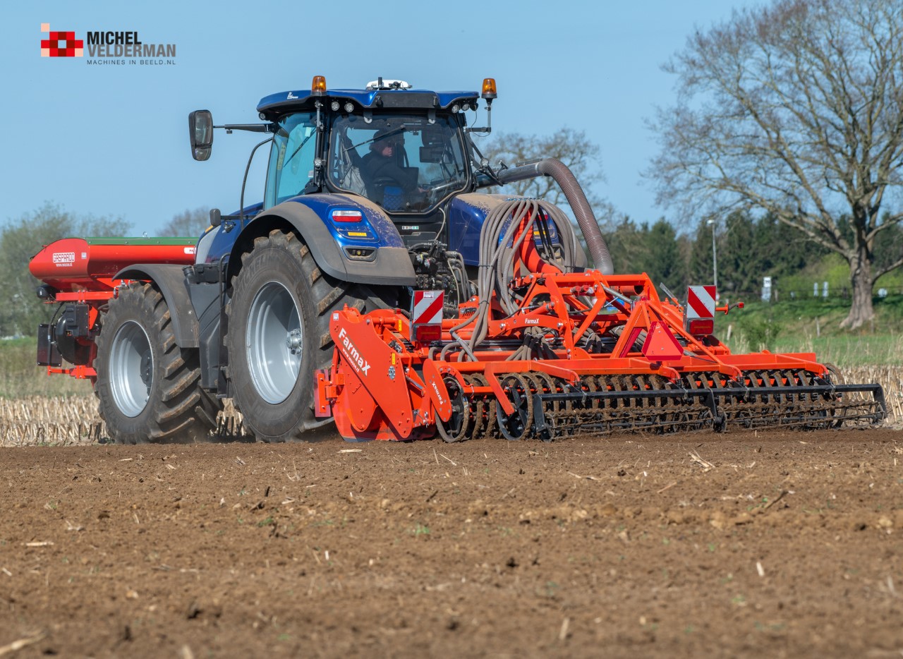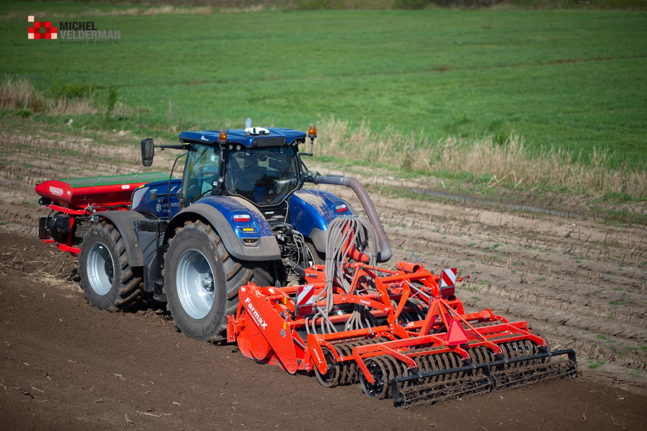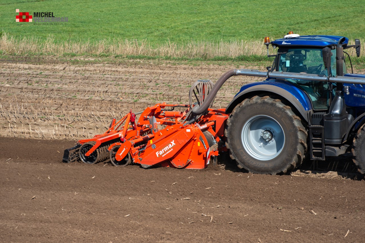 Farmax spit-zaaicombinatie van loonbedrijf Muller aan het werk. Voor de spitmachine een New Holland Blue Power 7.315 HD.