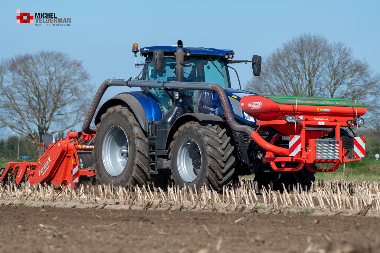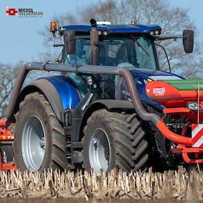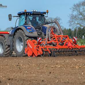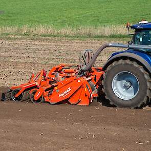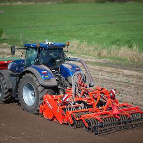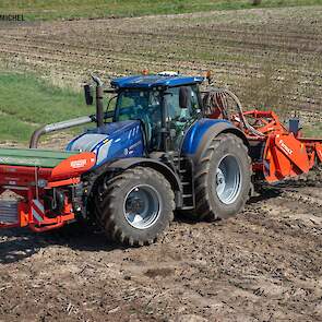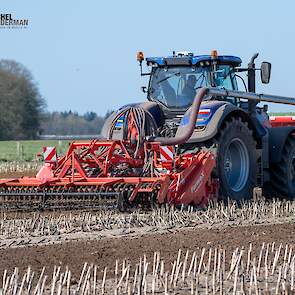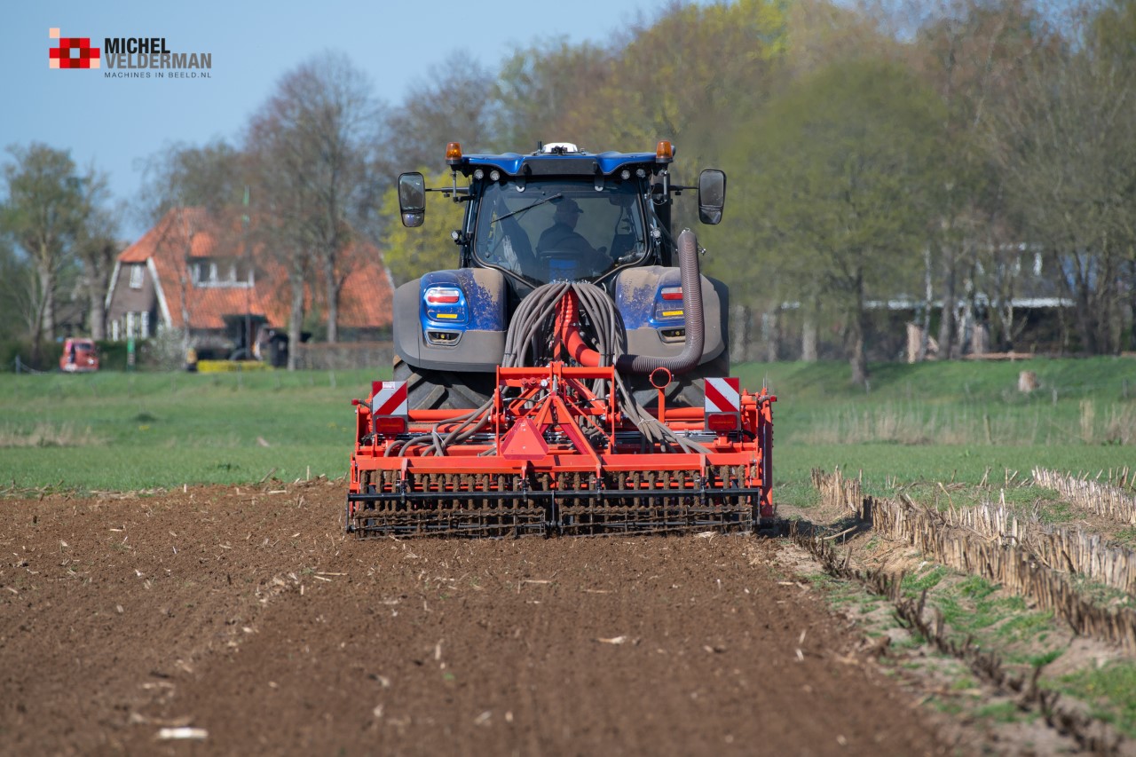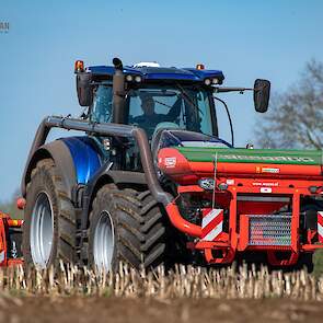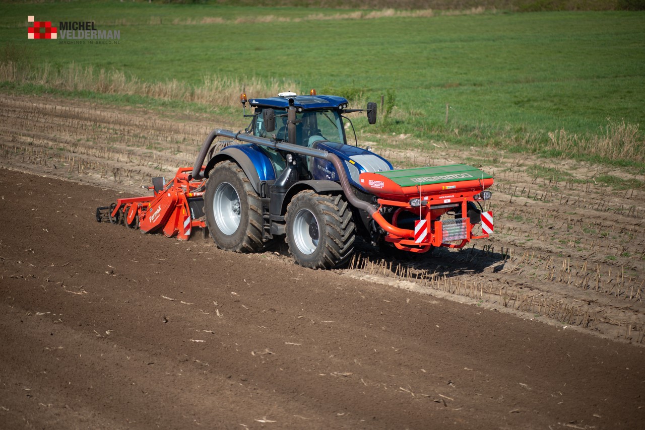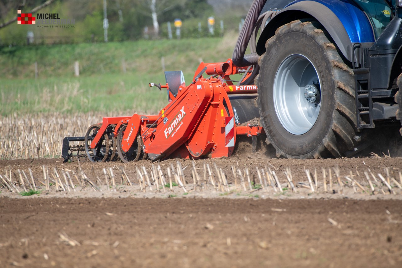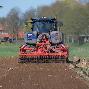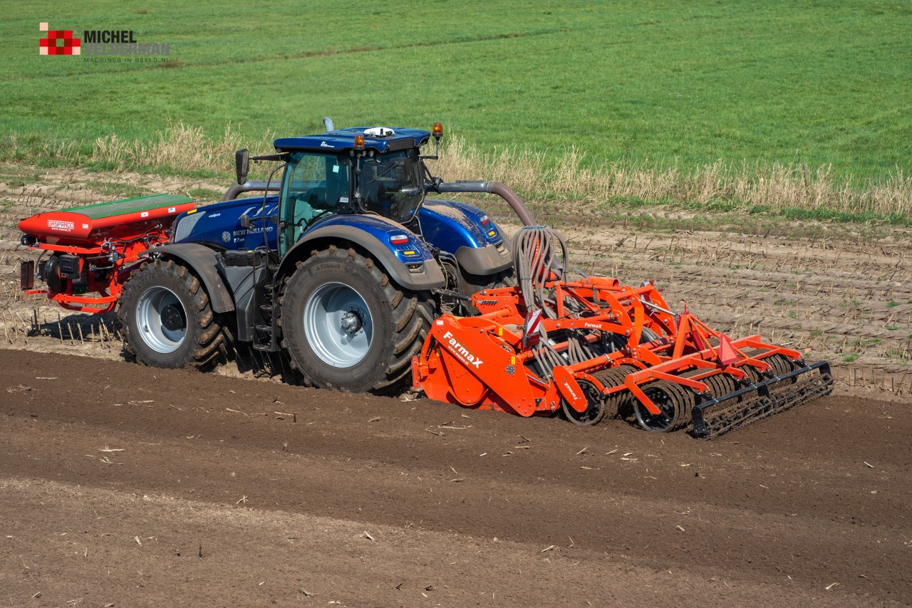 Farmax spit-zaaicombinatie van loonbedrijf Muller aan het werk. Voor de spitmachine een New Holland Blue Power 7.315 HD.