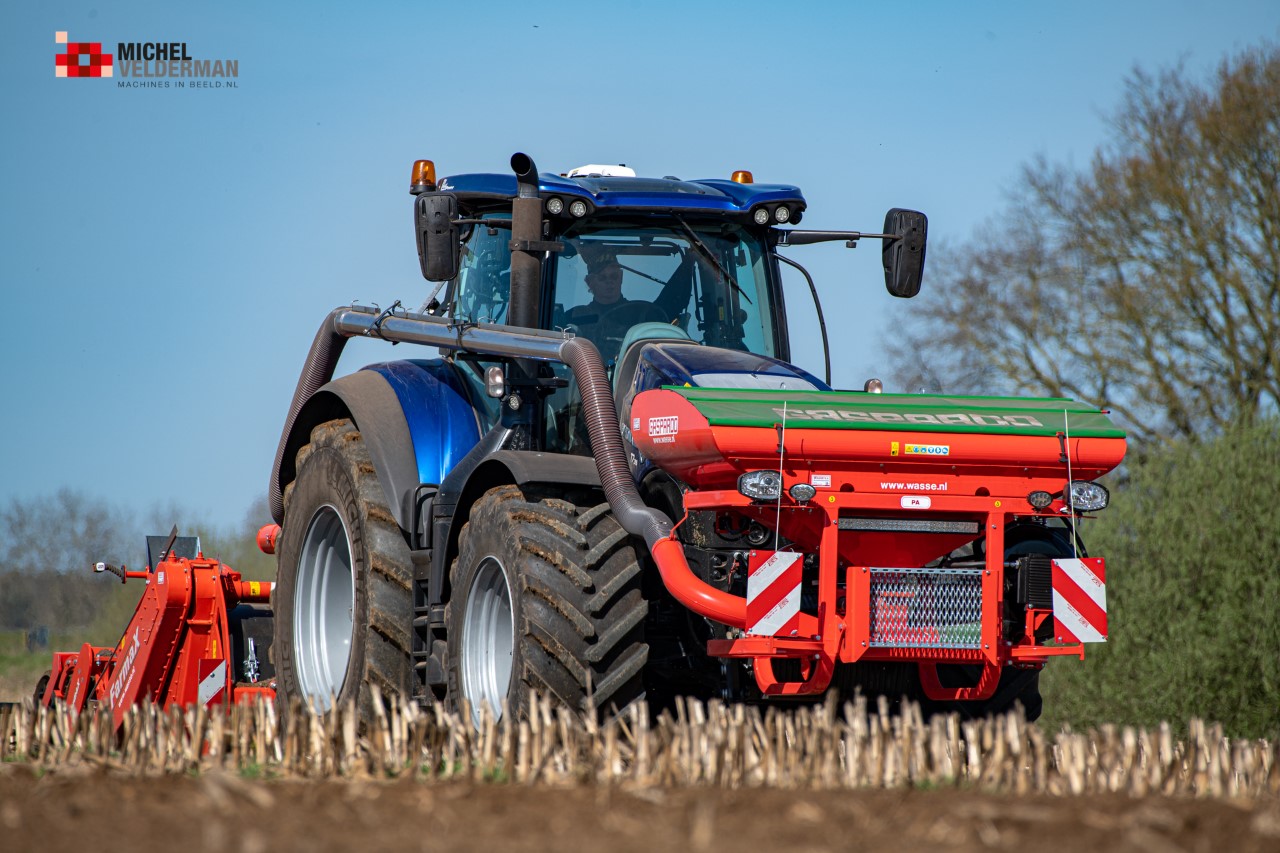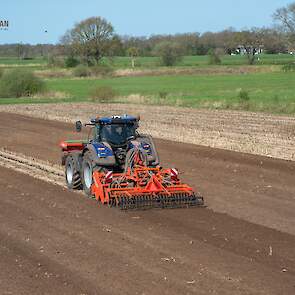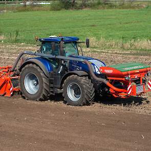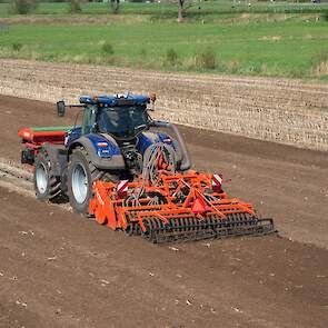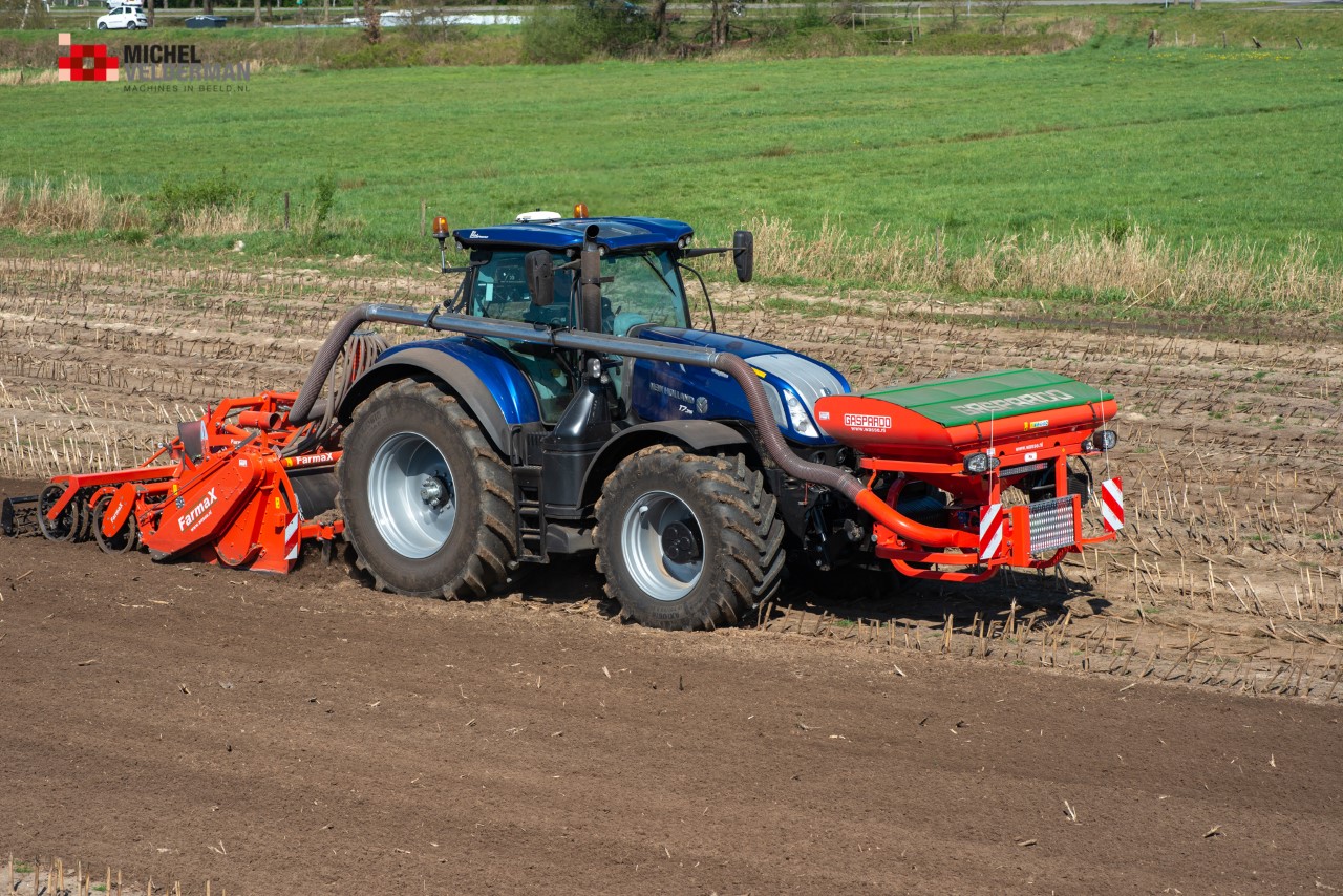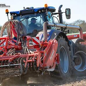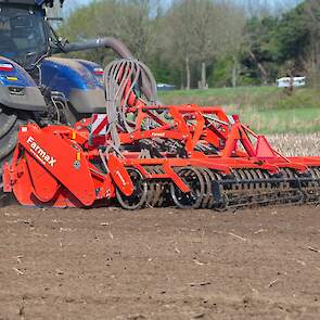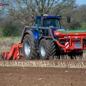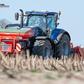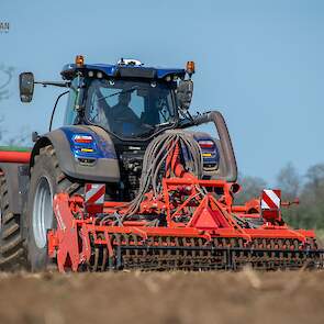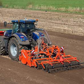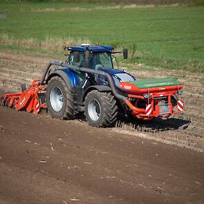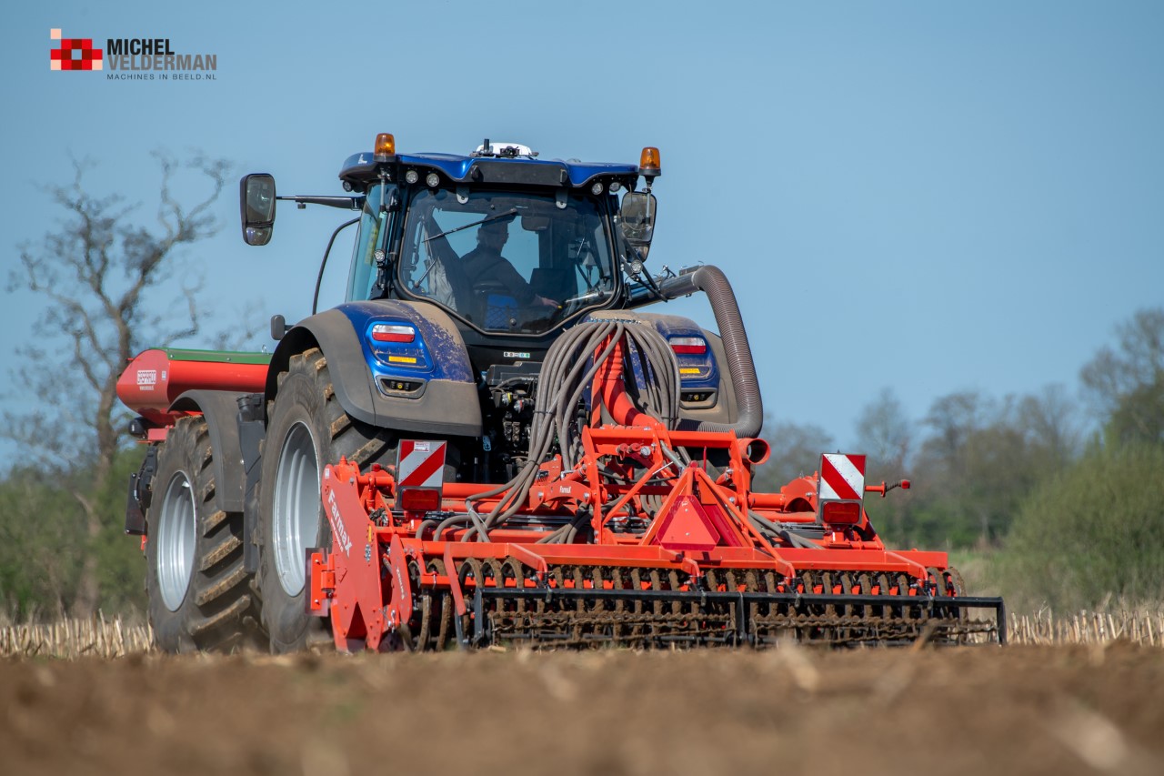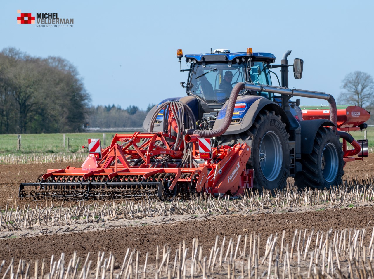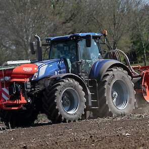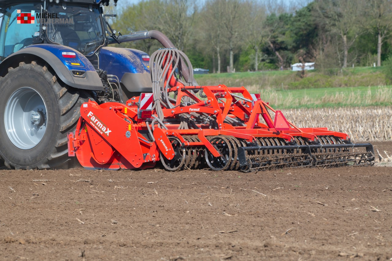 Farmax spit-zaaicombinatie van loonbedrijf Muller aan het werk. Voor de spitmachine een New Holland Blue Power 7.315 HD.
