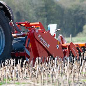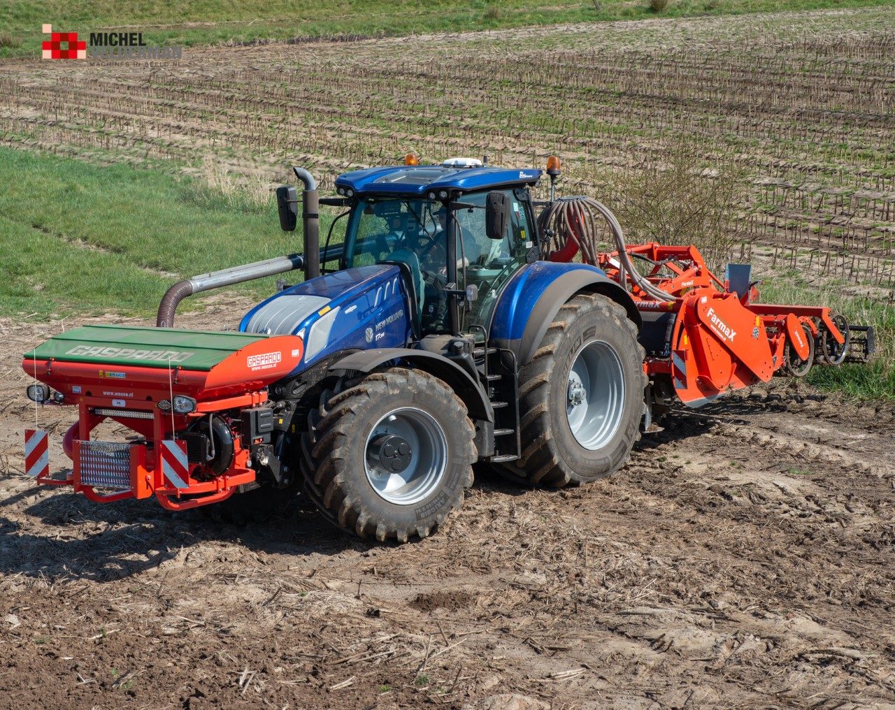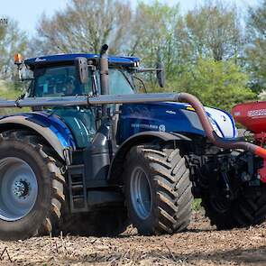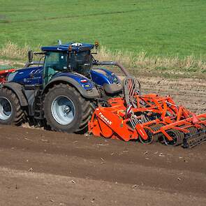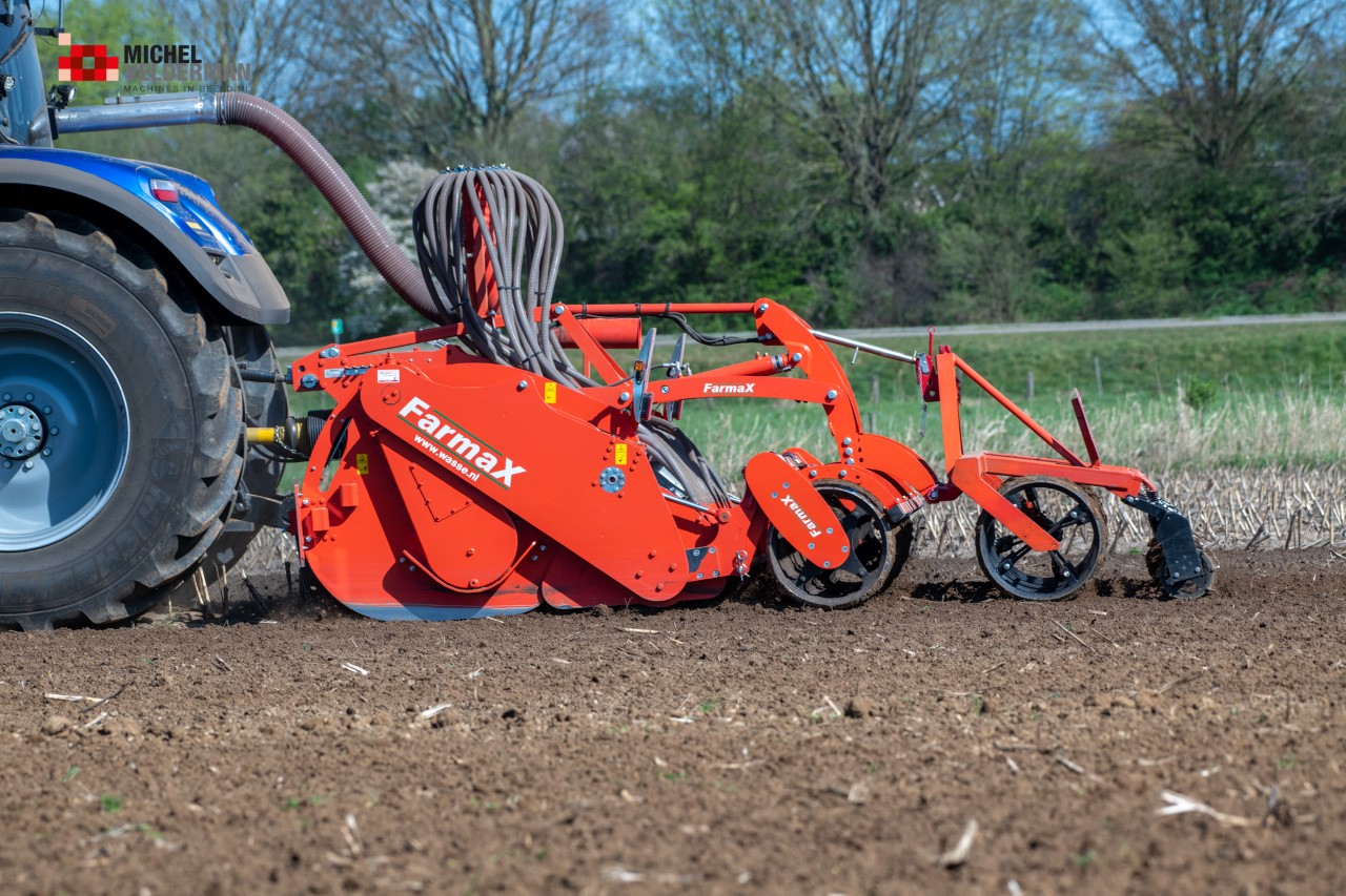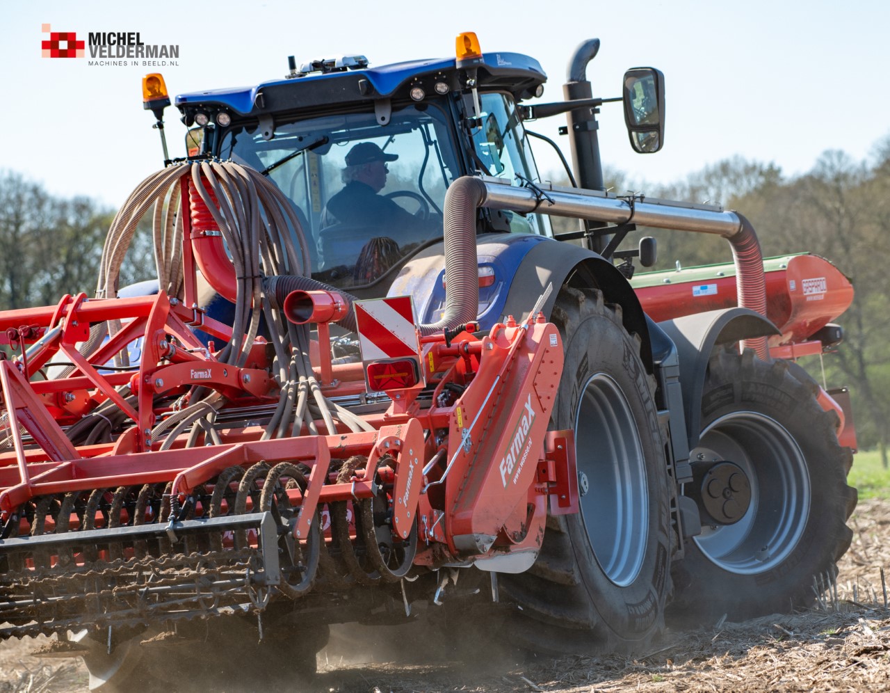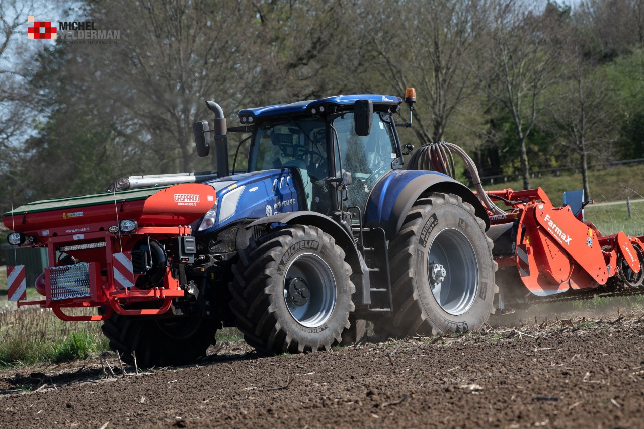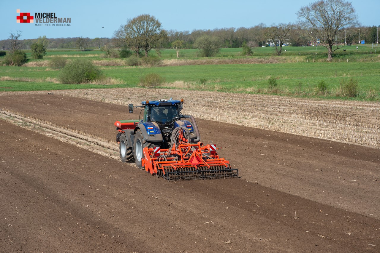 Farmax spit-zaaicombinatie van loonbedrijf Muller aan het werk. Voor de spitmachine een New Holland Blue Power 7.315 HD.
