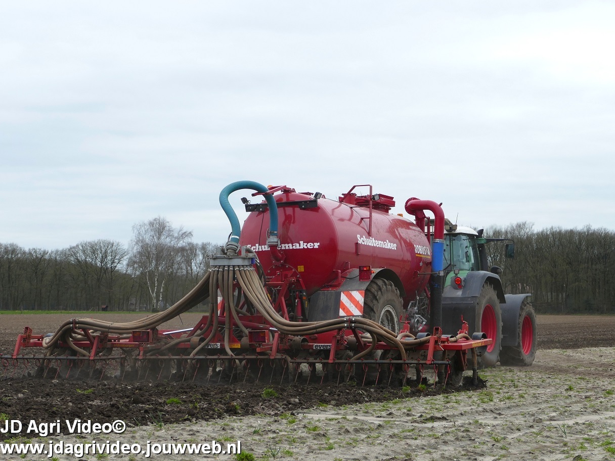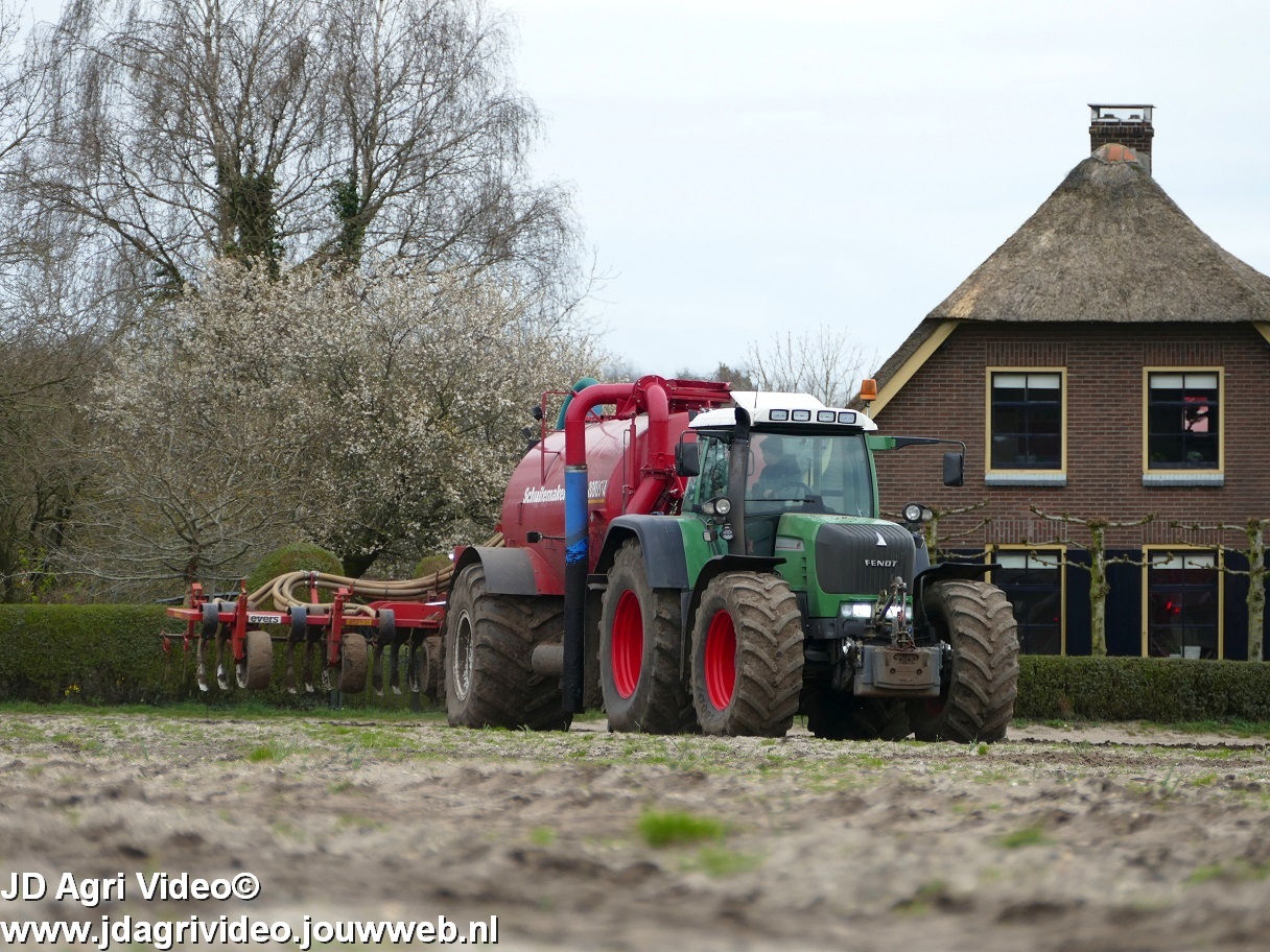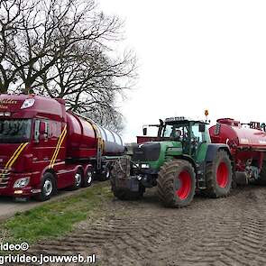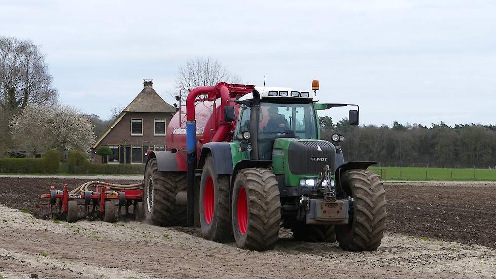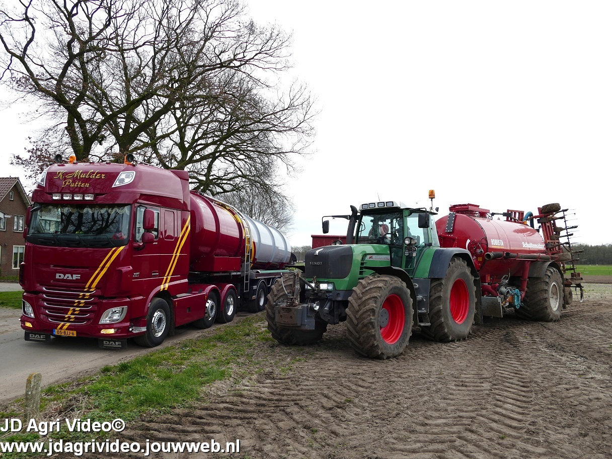 Loonbedrijf Hans Versteeg uit Uddel aan het bouwland bemesten met digestaat, gebruikmakend van een Fendt 930 Vario TMS met Schuitemaker Robusta-mesttank en Evers-bouwlandbemester. Voor het transport een DAF XF 460 van K. Mulder uit Putten.