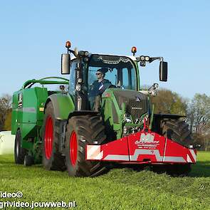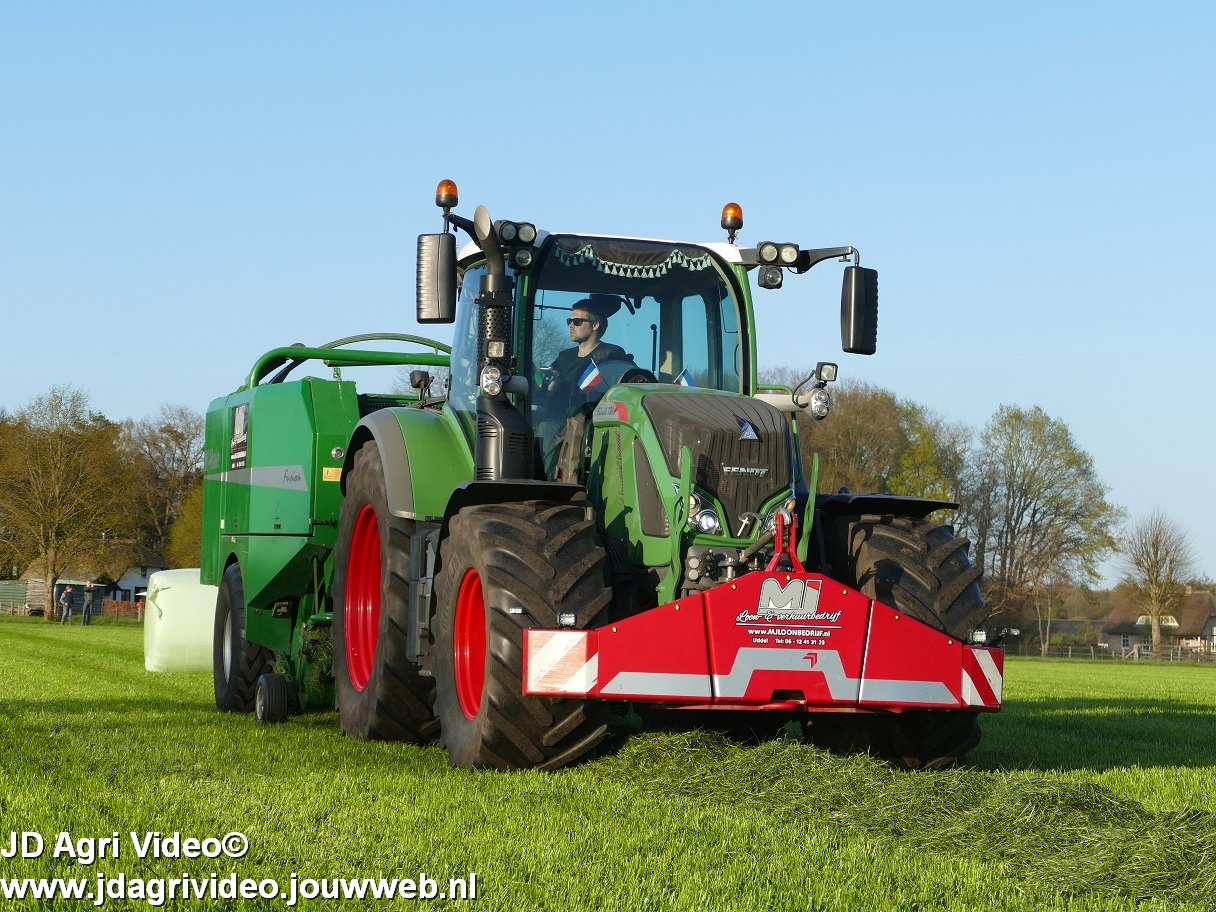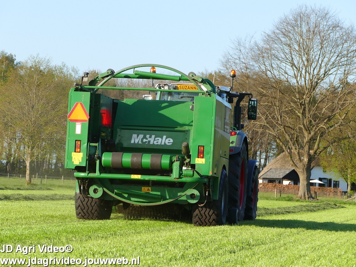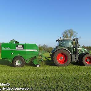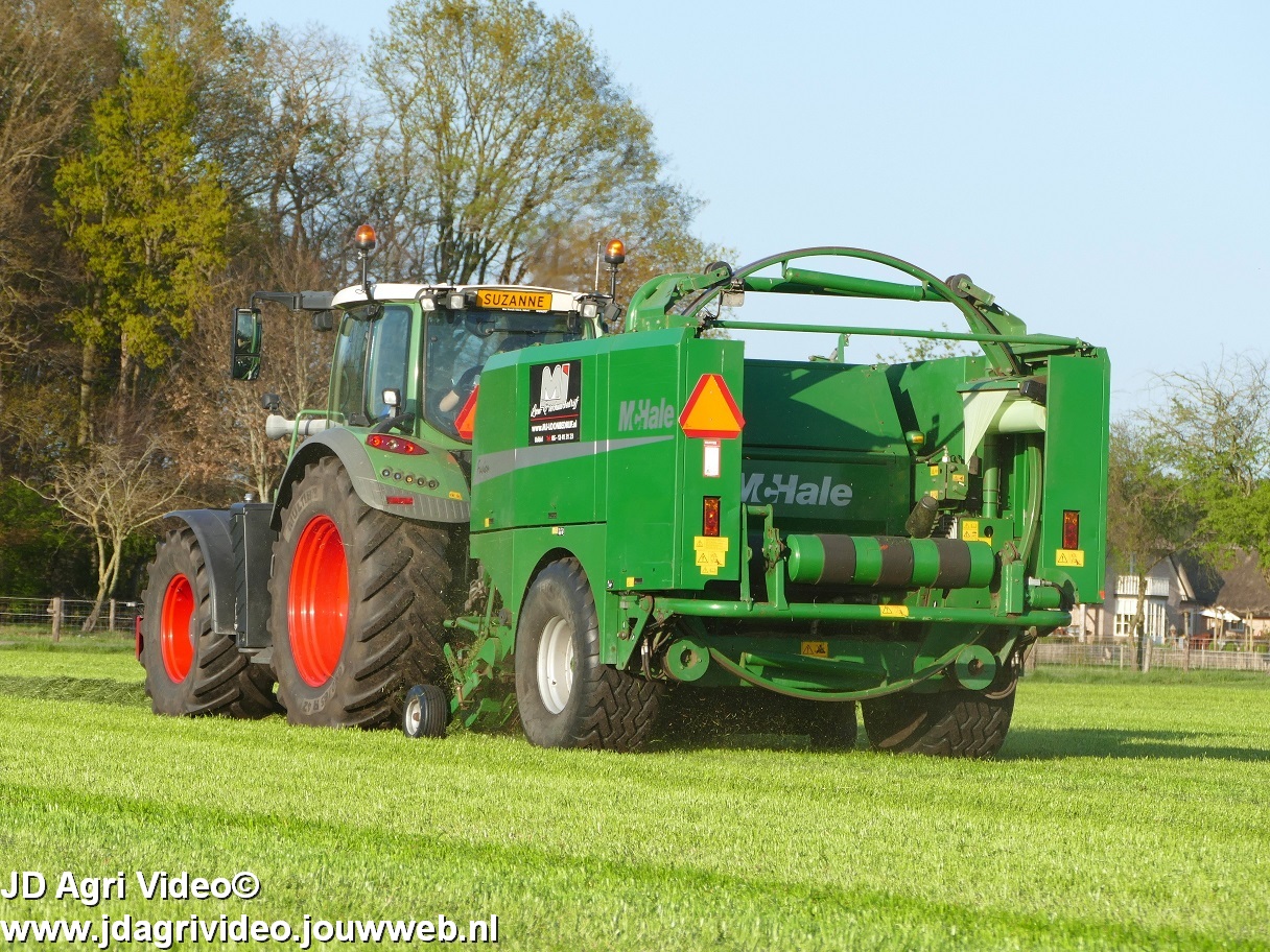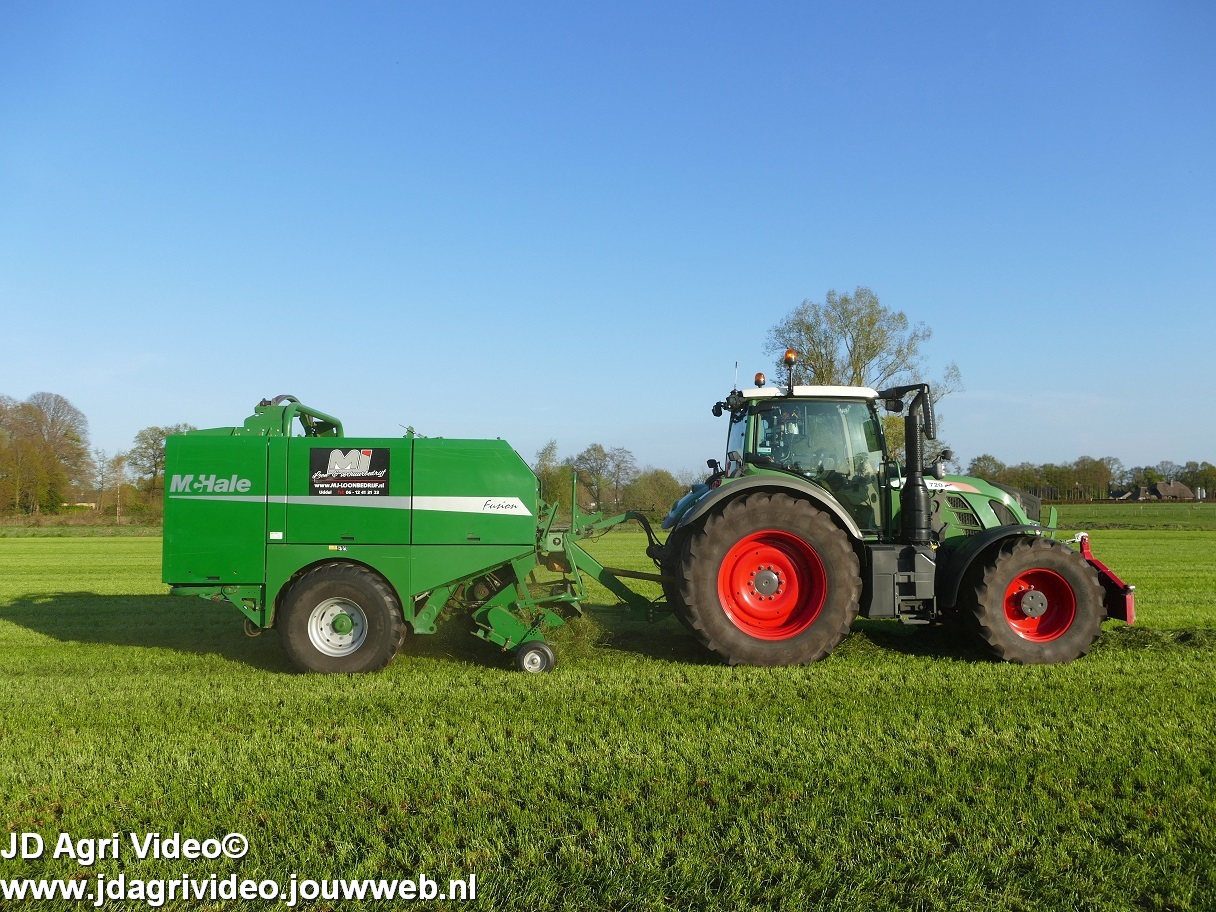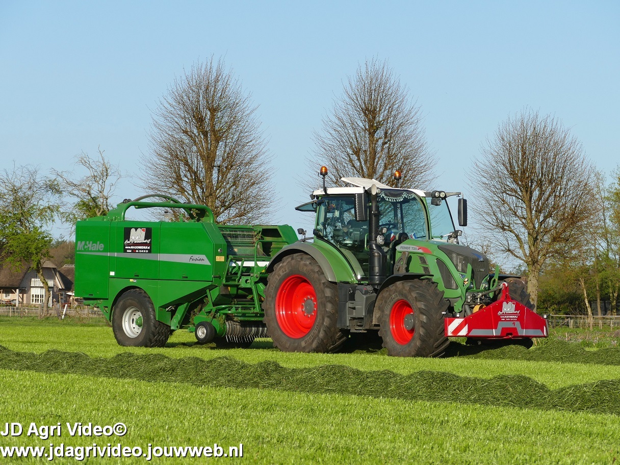 Loon-/ verhuurbedrijf MJ uit Uddel (GD) is hier de eerste balen aan het persen en wikkelen met een Fendt 720 Vario met een McHale Fushion-pers/ wikkelcombinatie.