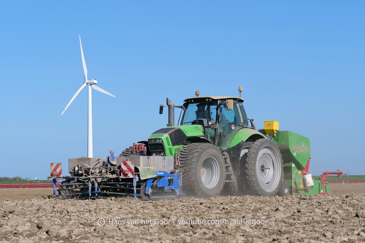 Aardappels poten in één werkgang door Akkerbouwbedrijf Stegeman uit Biddinghuizen. De Deutz-Fahr Agrotron TTV 630 is voorop voorzien van een VSS Agro-zaaibedbereider. Achterop een vierrijer Baselier-pootmachine met hakenfrees en aanaardkap. Als toegift nog enkele beelden van de Flevolandse tulpen.