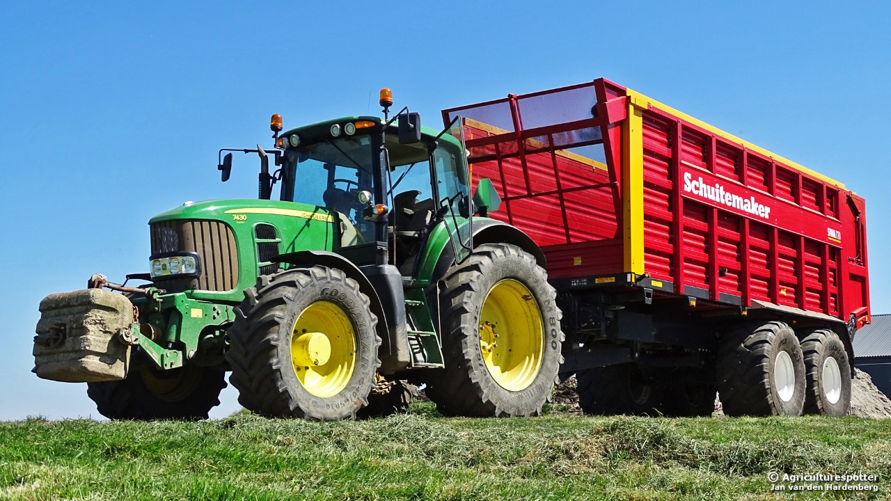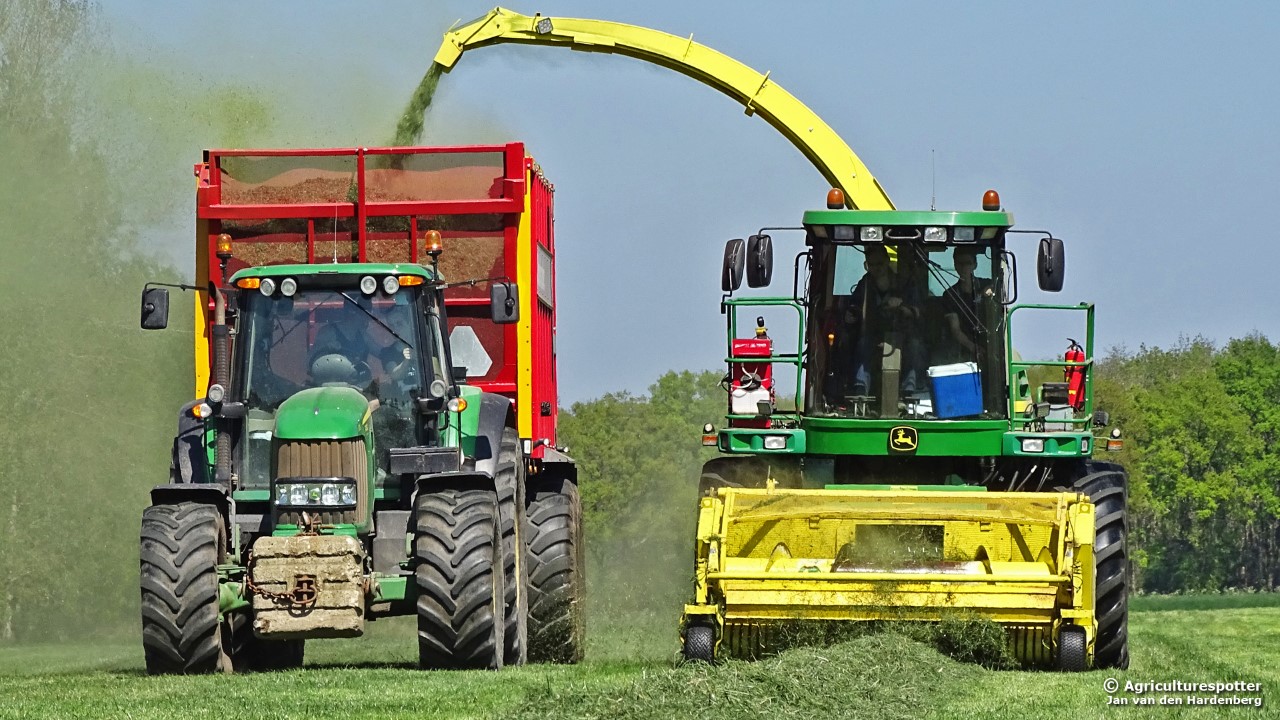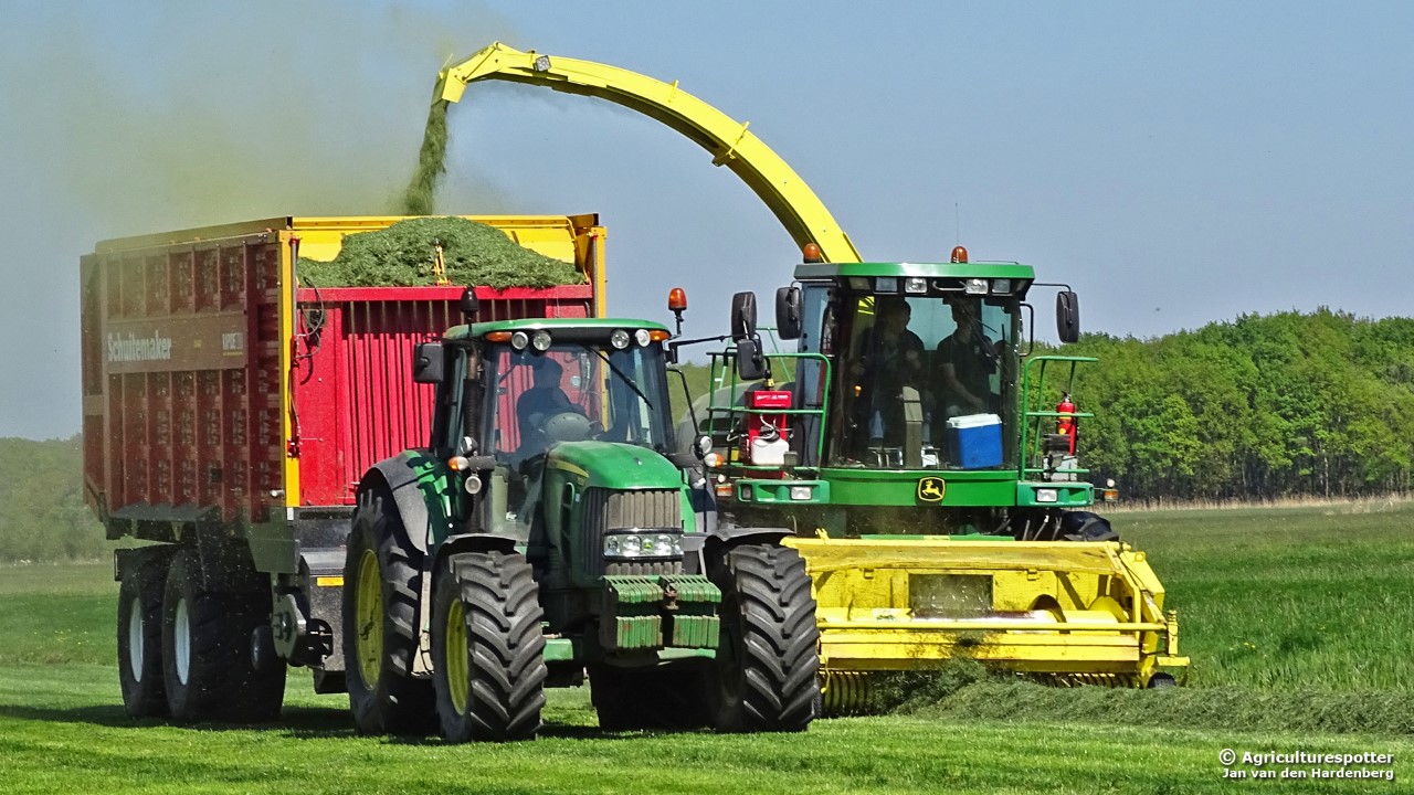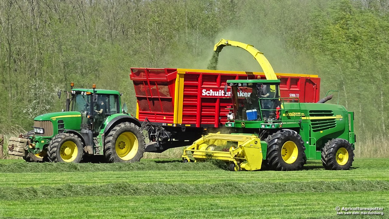 J. de Heus aan het gras hakselen met John Deere 7400, 7430, 7530 en een Claas Xerion 3800 Trac VC met Holaras op de kuilbult.