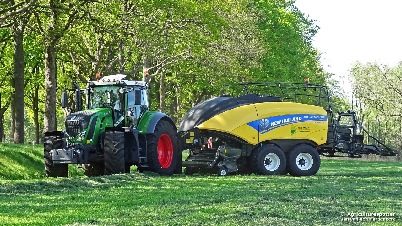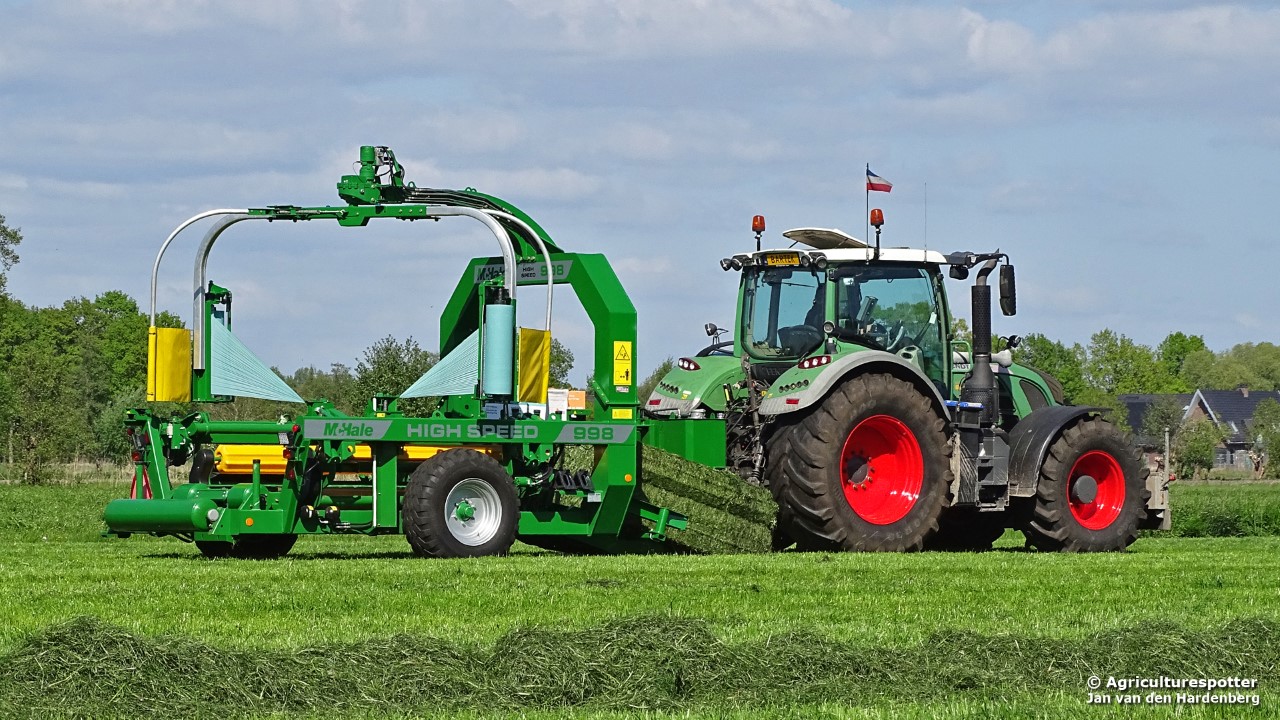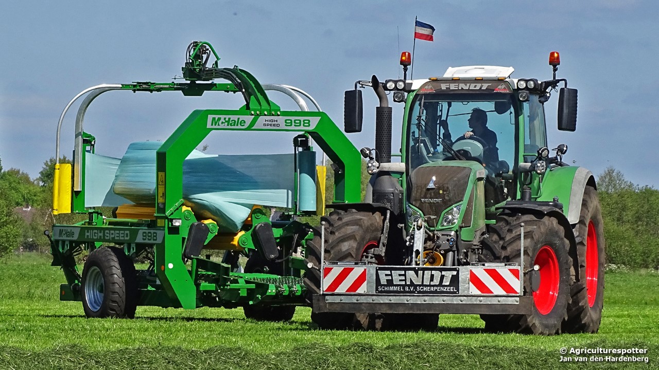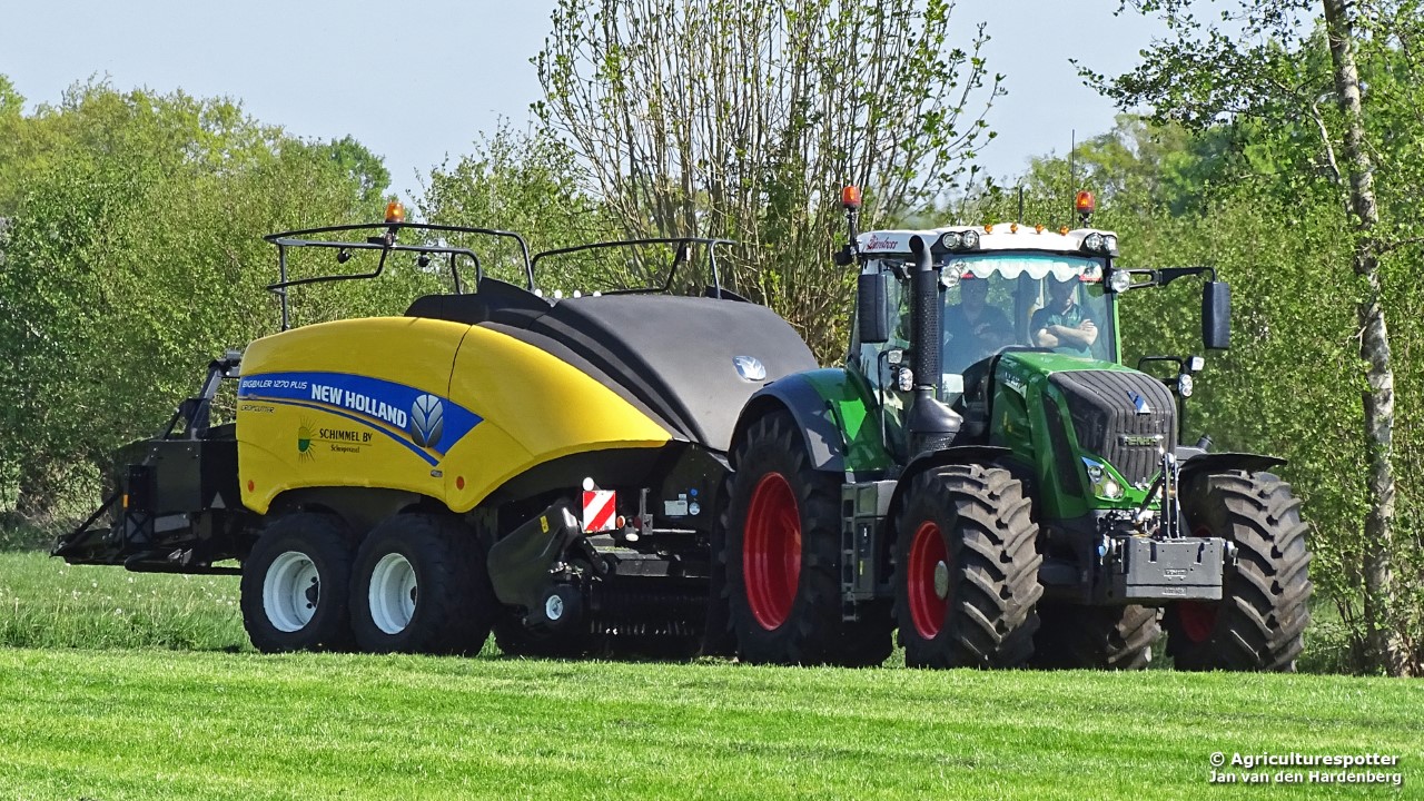 Balen persen en wikkelen in Ederveen (GD) met de nieuwe Fendt 828 Vario Nature Green en een New Holland Bigbaler 1270 Plus-balenpers en een Fendt 724 Vario met een McHale 998 High Speed-wikkelaar van loon&grondverzetbedrijf Schimmel BV.