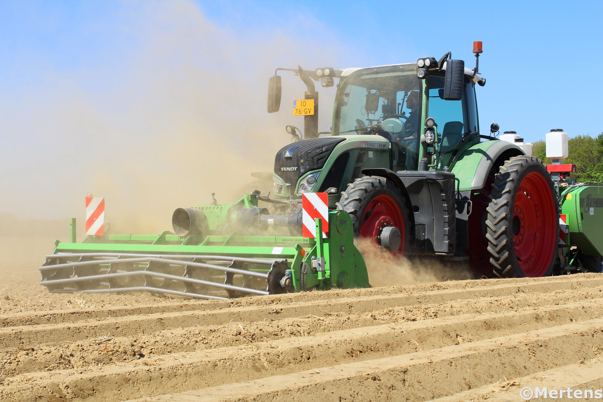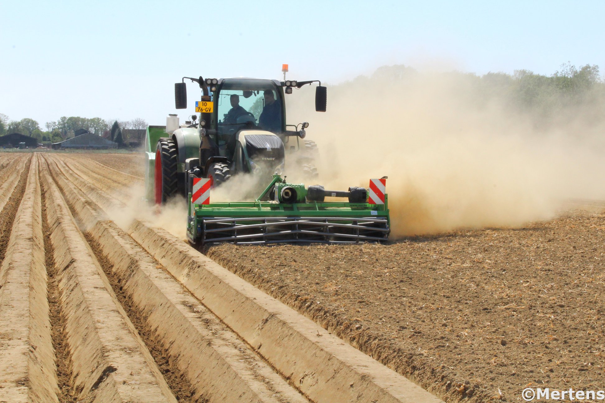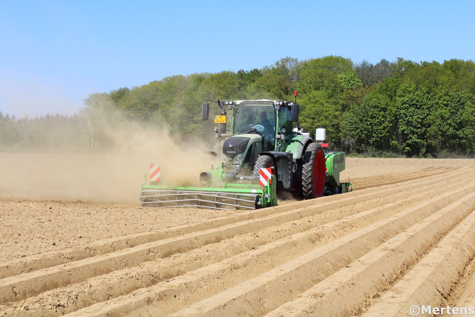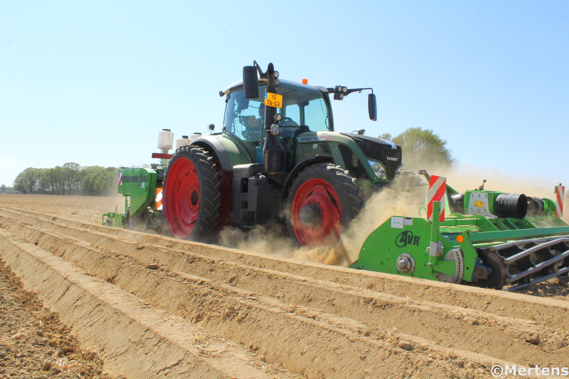 Met de Fendt 720 Vario met Avr-multivator en Ceres-pootmachine met aanaardkap aan het poten bij Mts Peeters- Rijs.