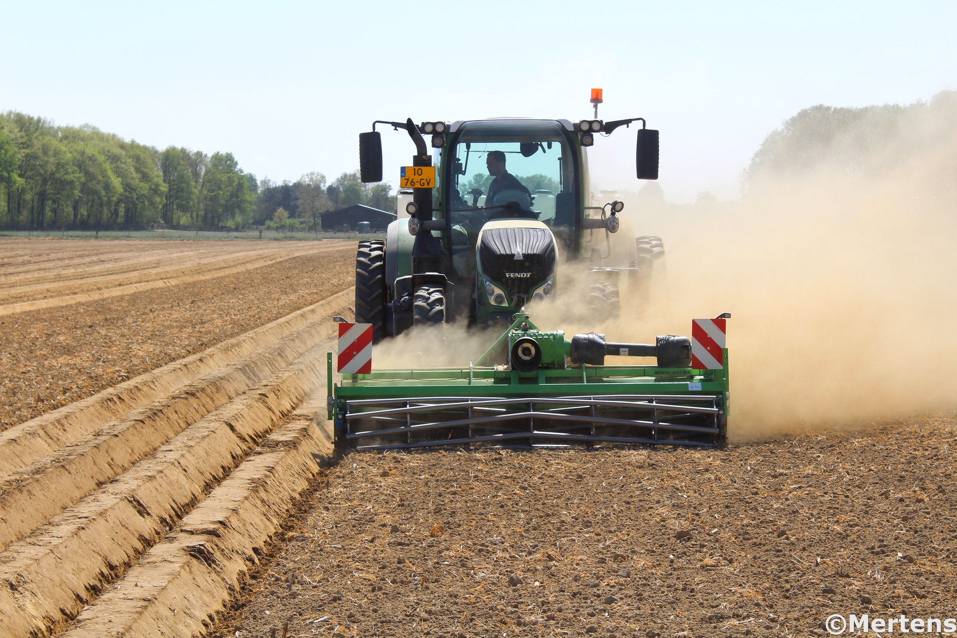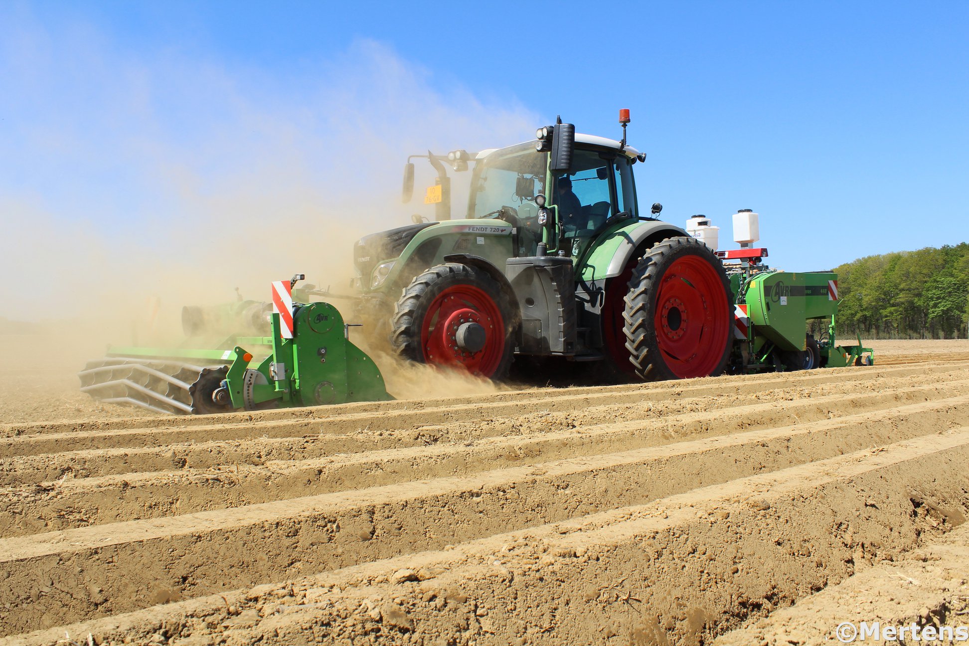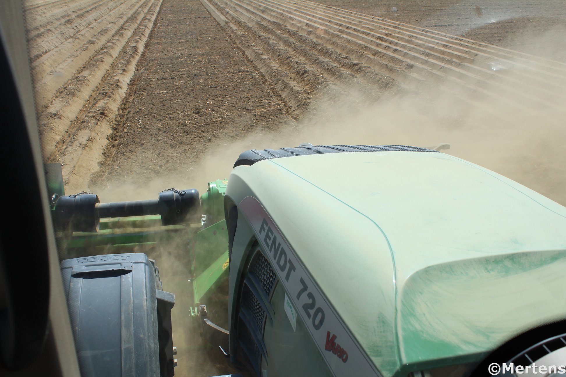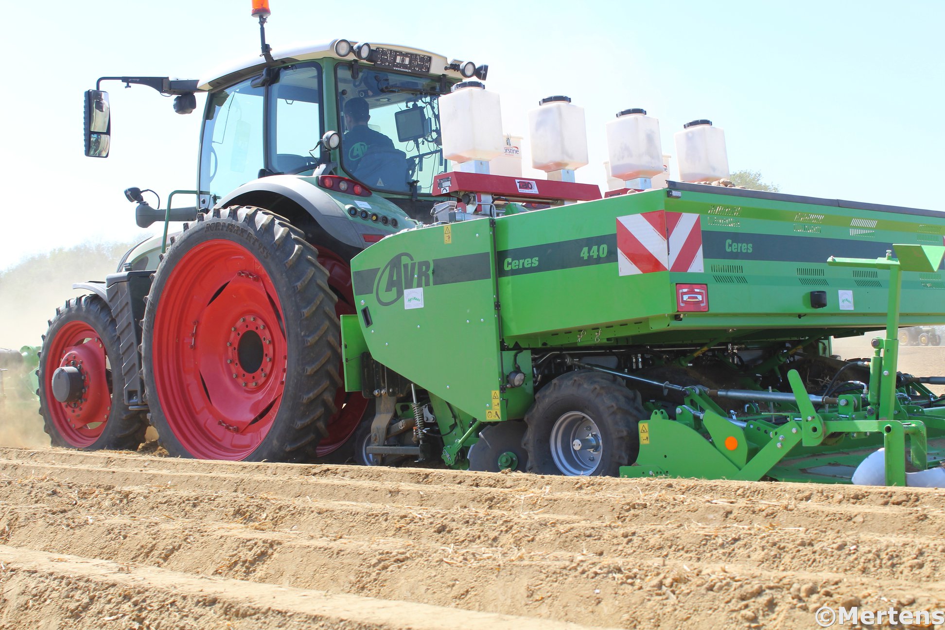 Met de Fendt 720 Vario met Avr-multivator en Ceres-pootmachine met aanaardkap aan het poten bij Mts Peeters- Rijs.